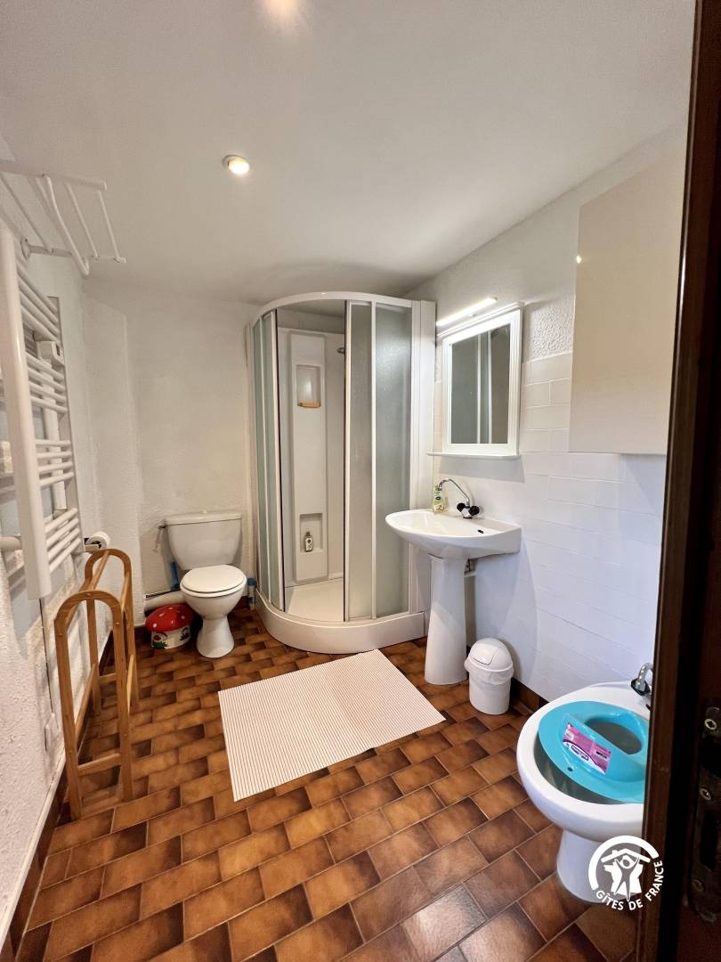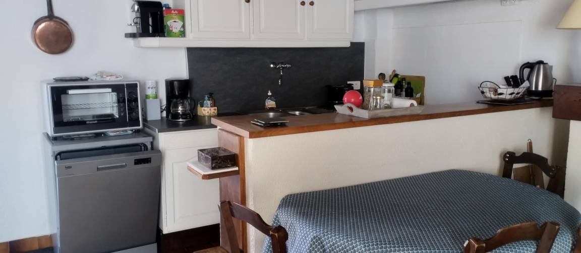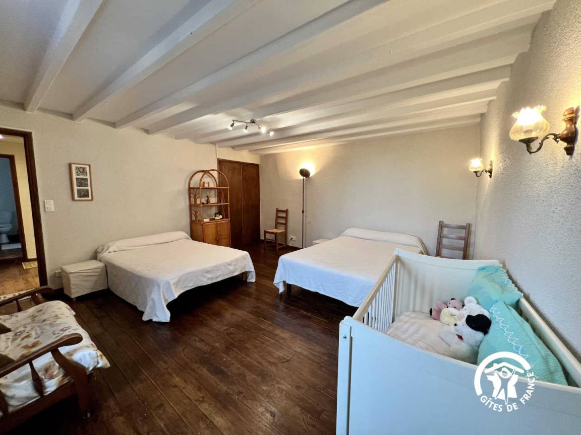 Im Erdgeschoss: Wohnzimmer-Küche mit Kamin (1/2-Hof). Obergeschoss: 2 Schlafzimmer mit 3 Betten, 2 Personen und 1 Kinderbett. Badezimmer - wc.