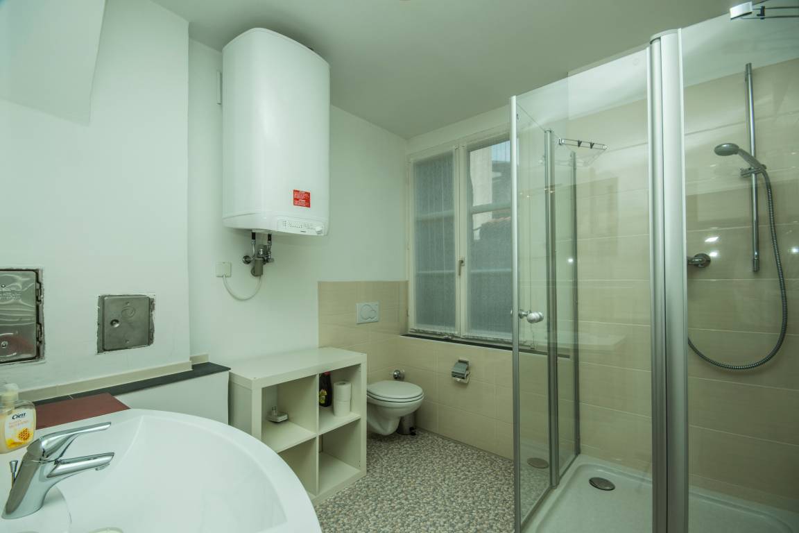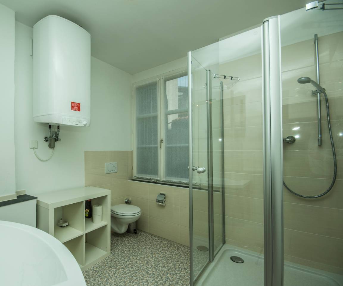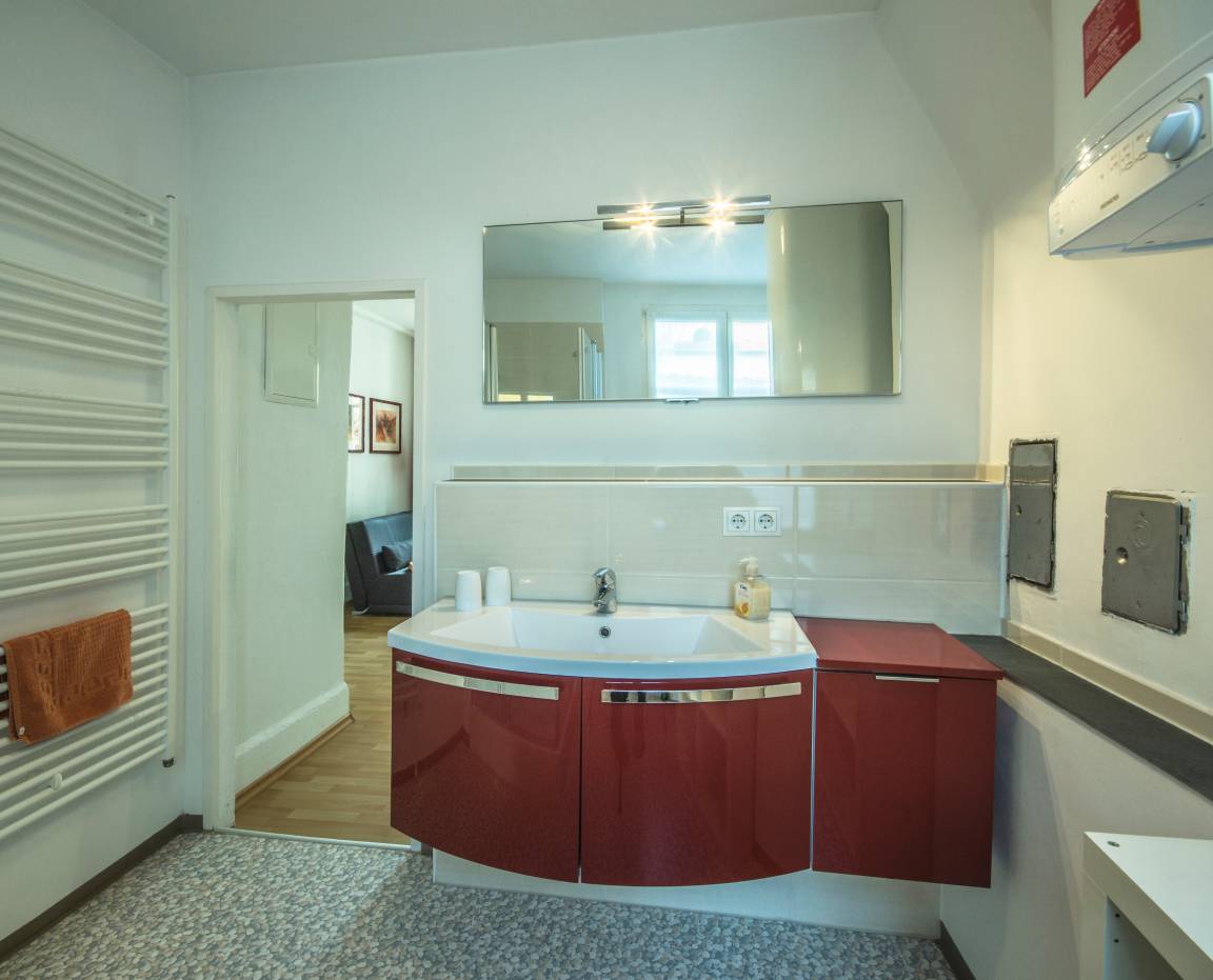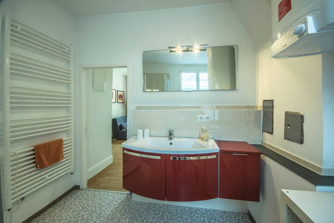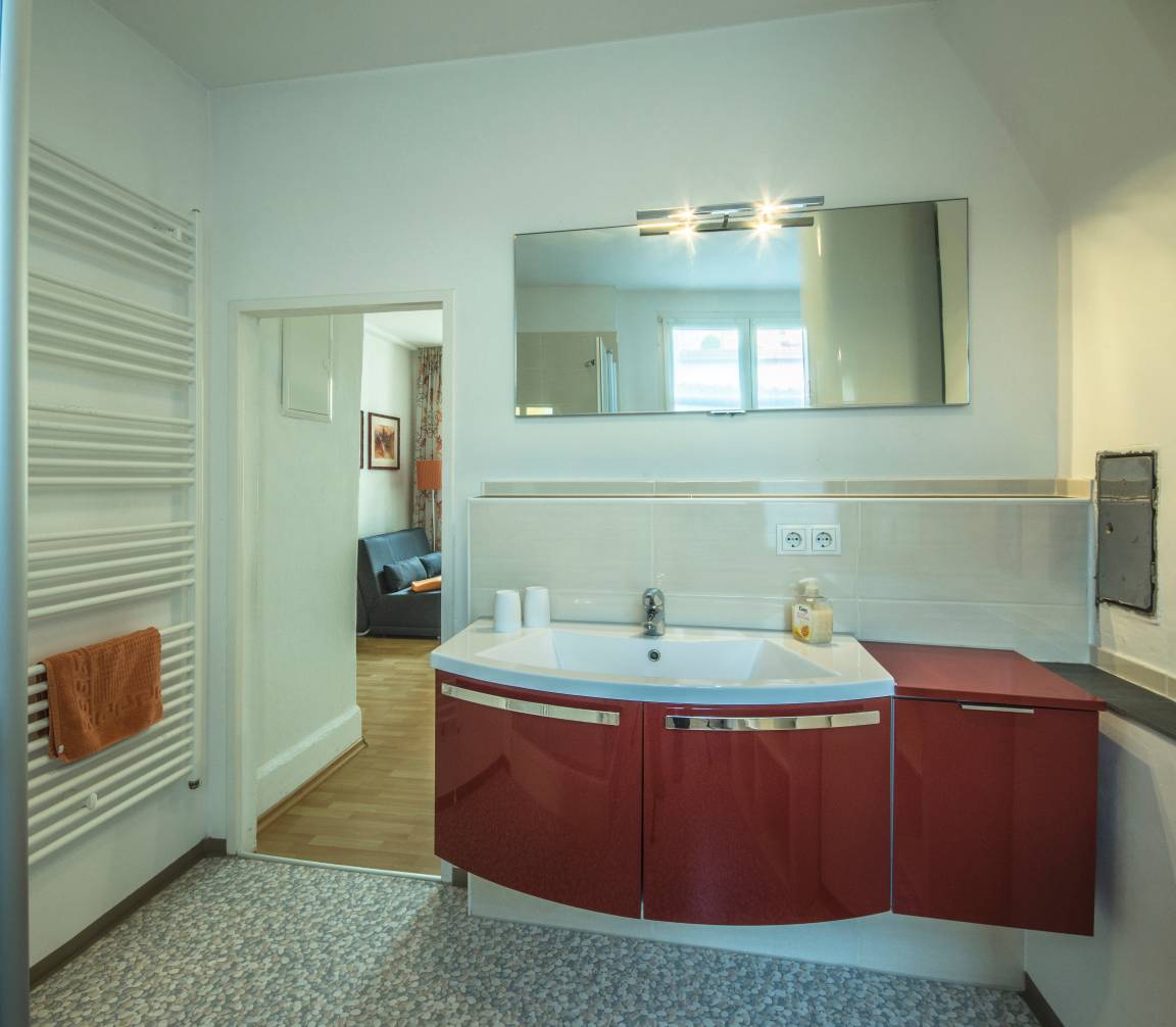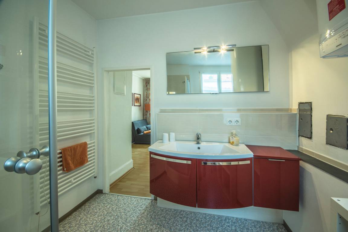Das modern eingerichtete, helle Badezimmer ist komfortabel mit Tageslicht, Handtuchwärmer und einer XL-Dusche ausgestattet.