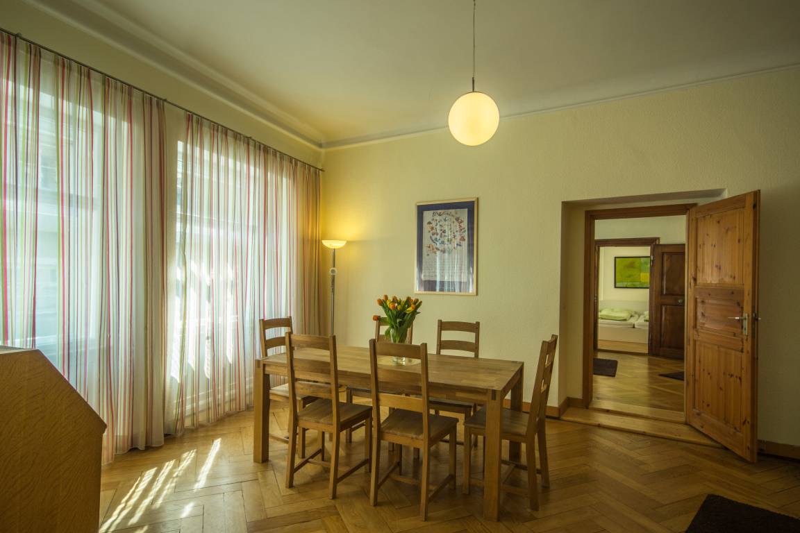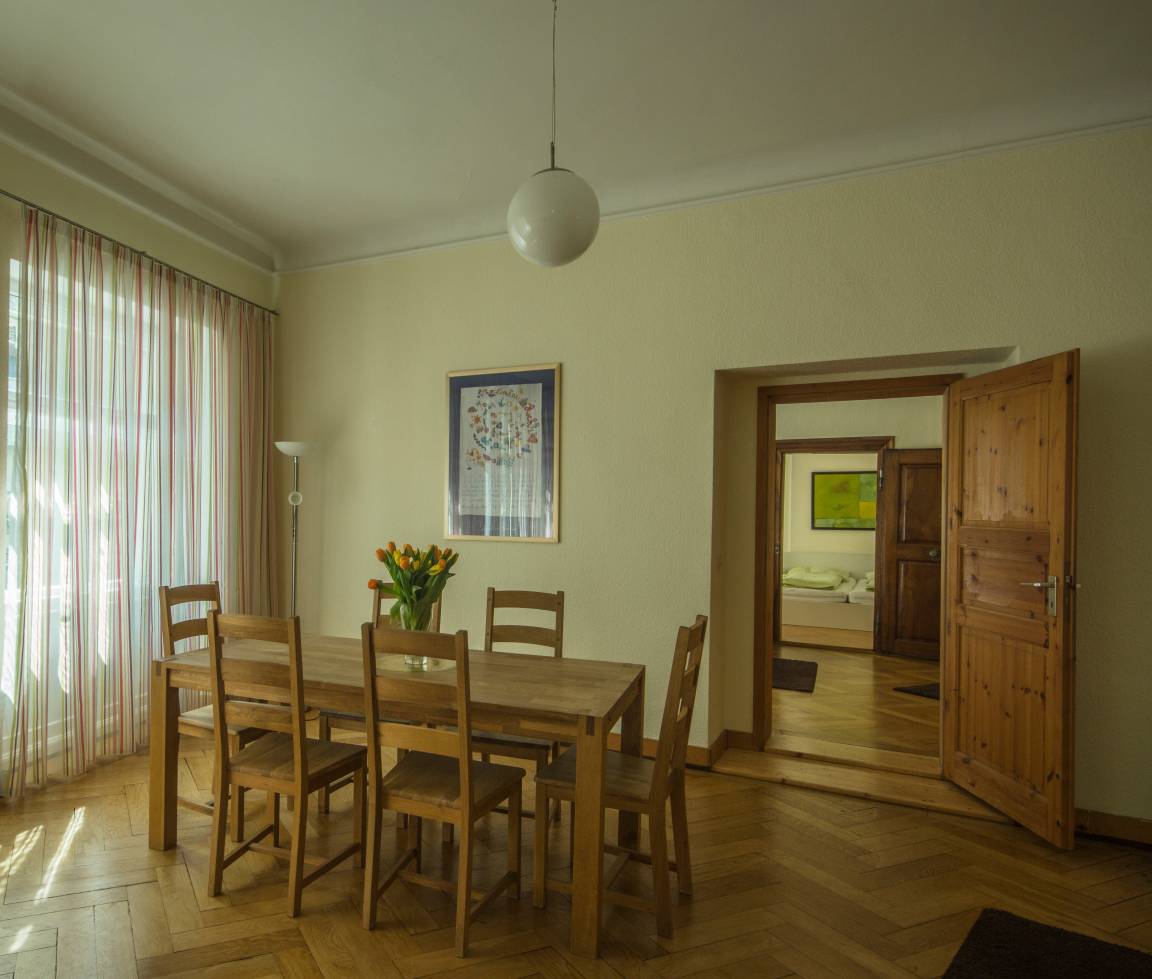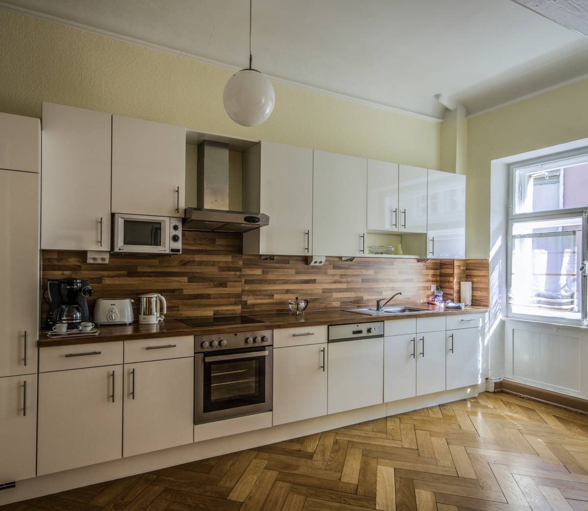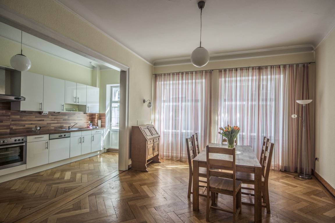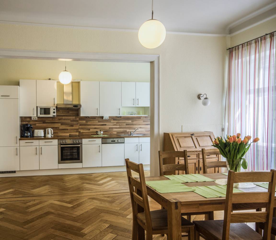 Ein großes, modernes Esszimmer mit offener Küche ist das gemütliche Herzstück dieser Wohnung. Wenn Sie die Geräumigkeit eines Altbaus lieben, werden Sie sich hier wohlfühlen.