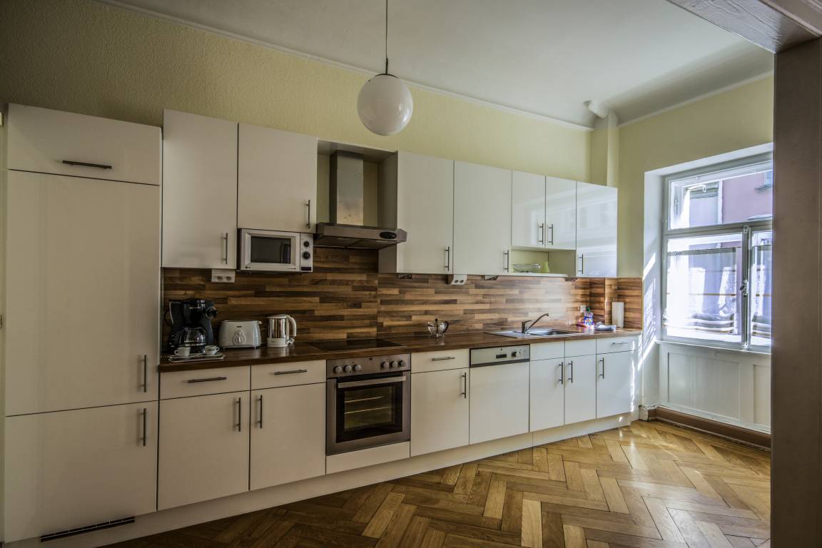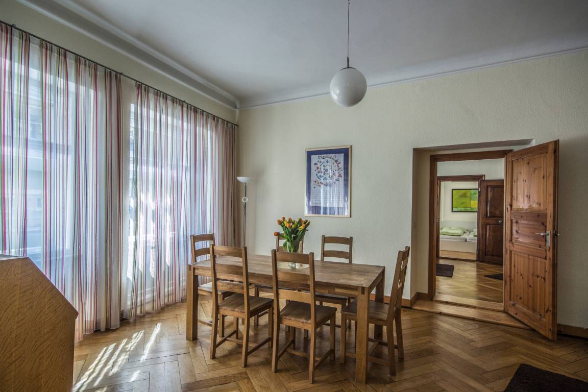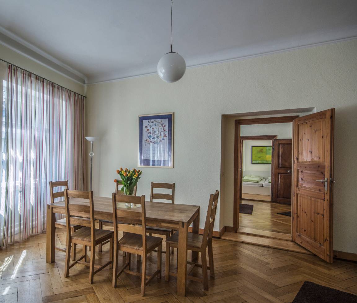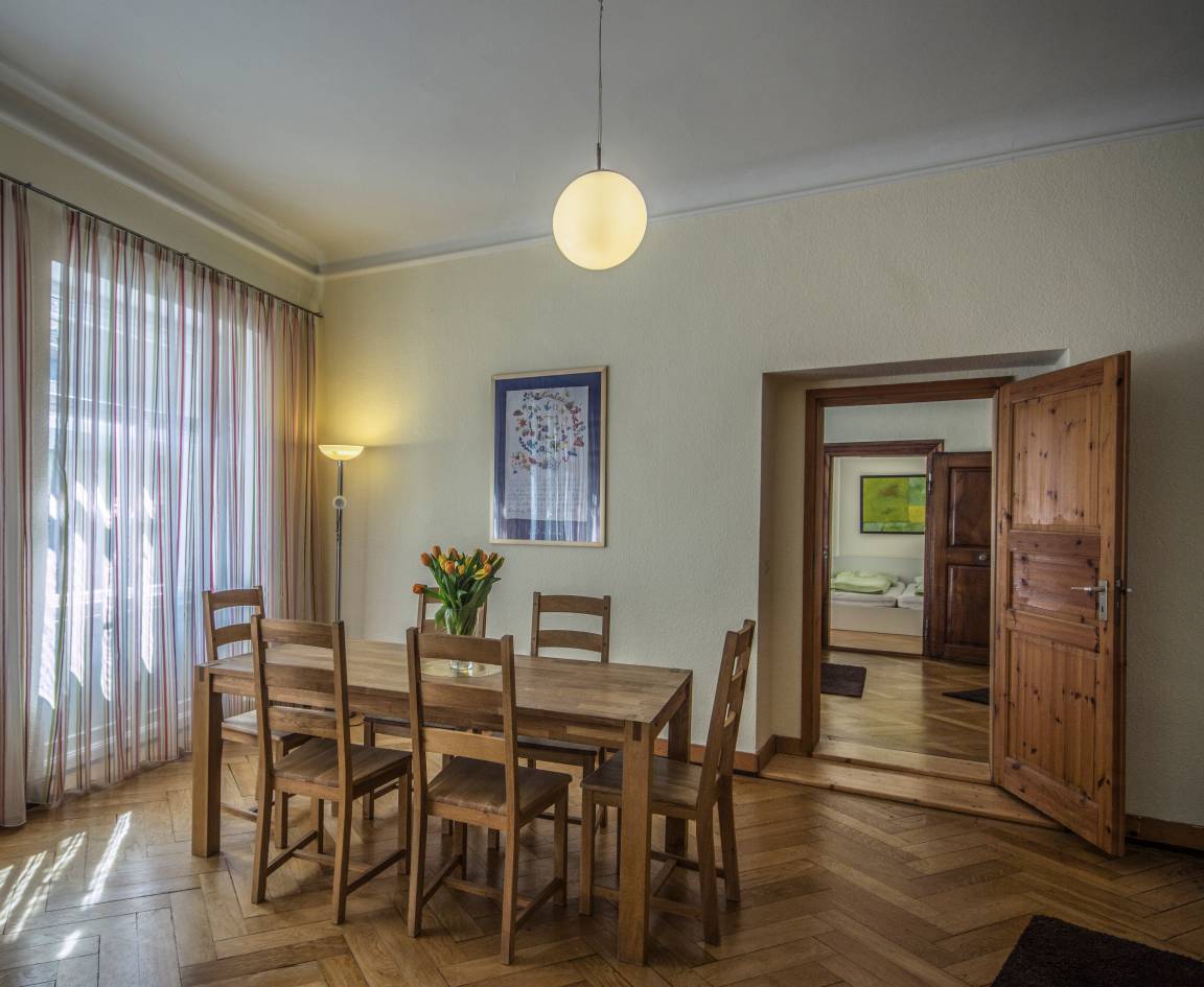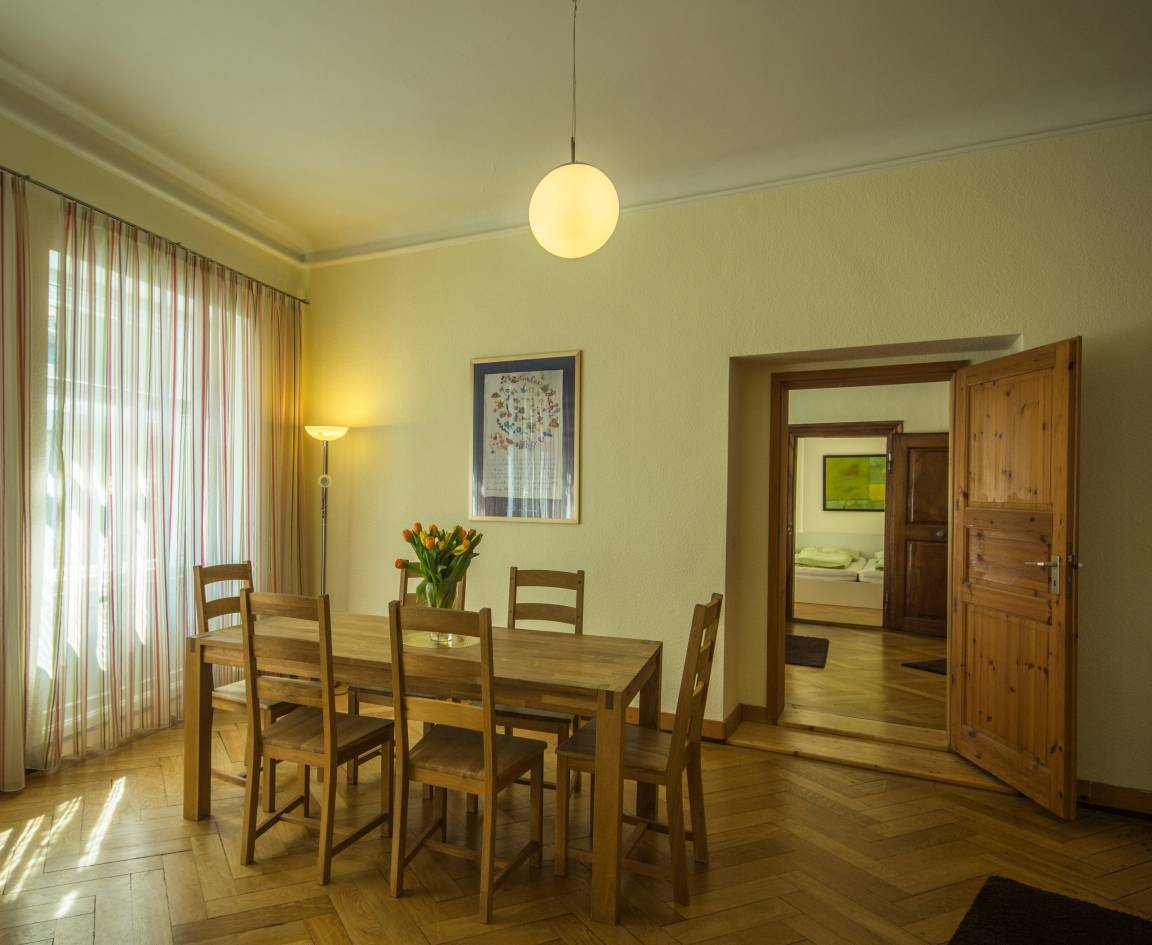 Ein großes, modernes Esszimmer mit offener Küche ist das gemütliche Herzstück dieser Wohnung. Wenn Sie die Geräumigkeit eines Altbaus lieben, werden Sie sich hier wohlfühlen.