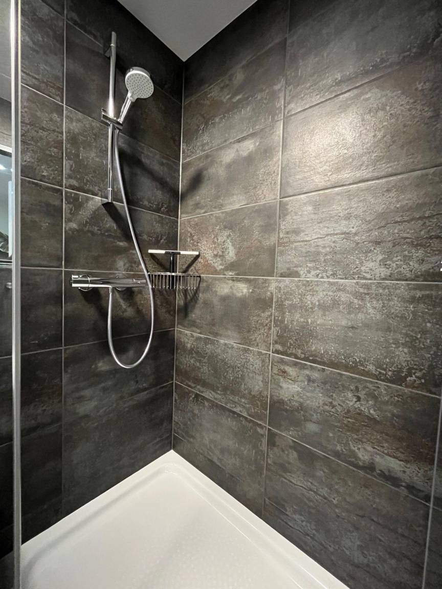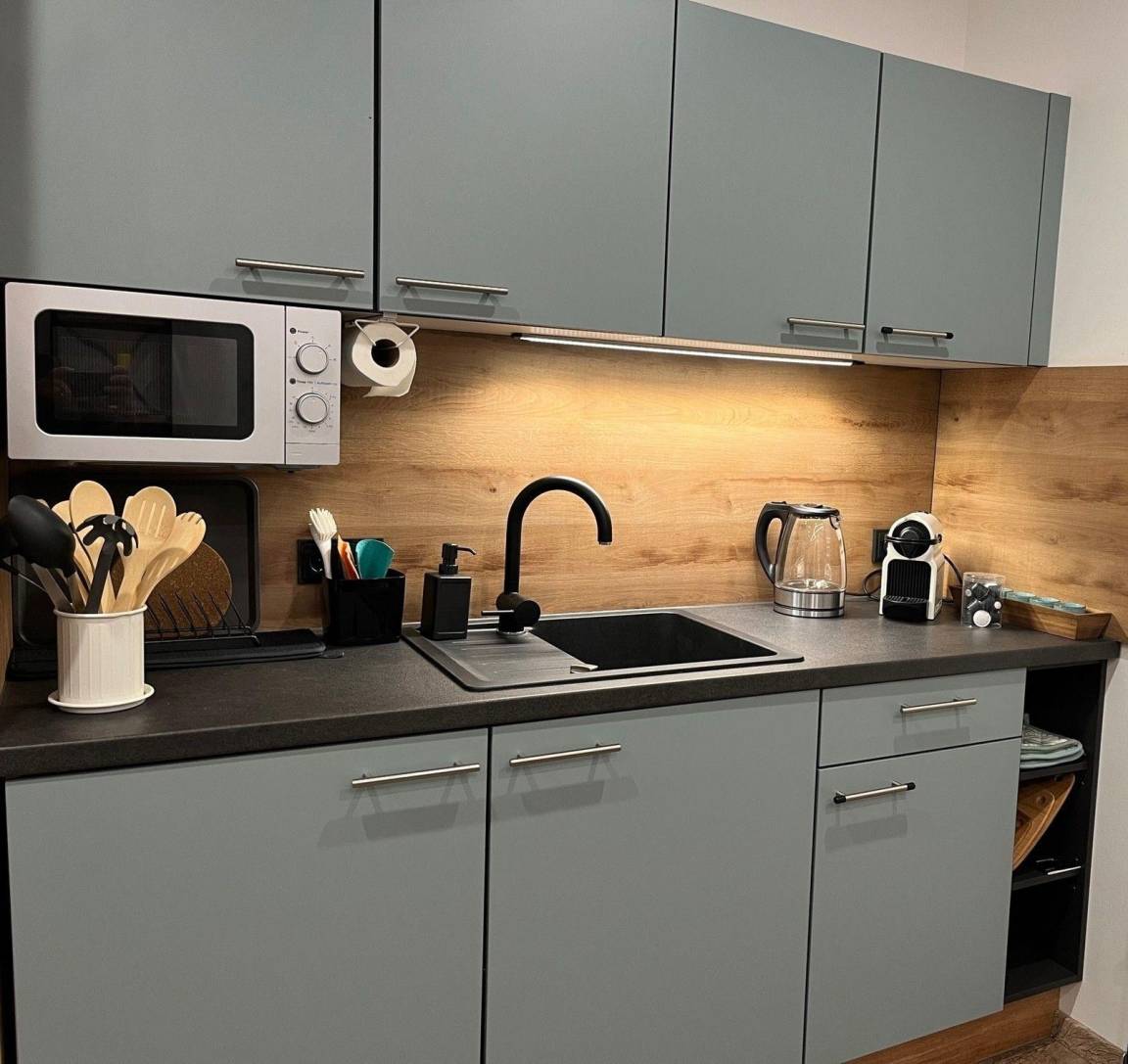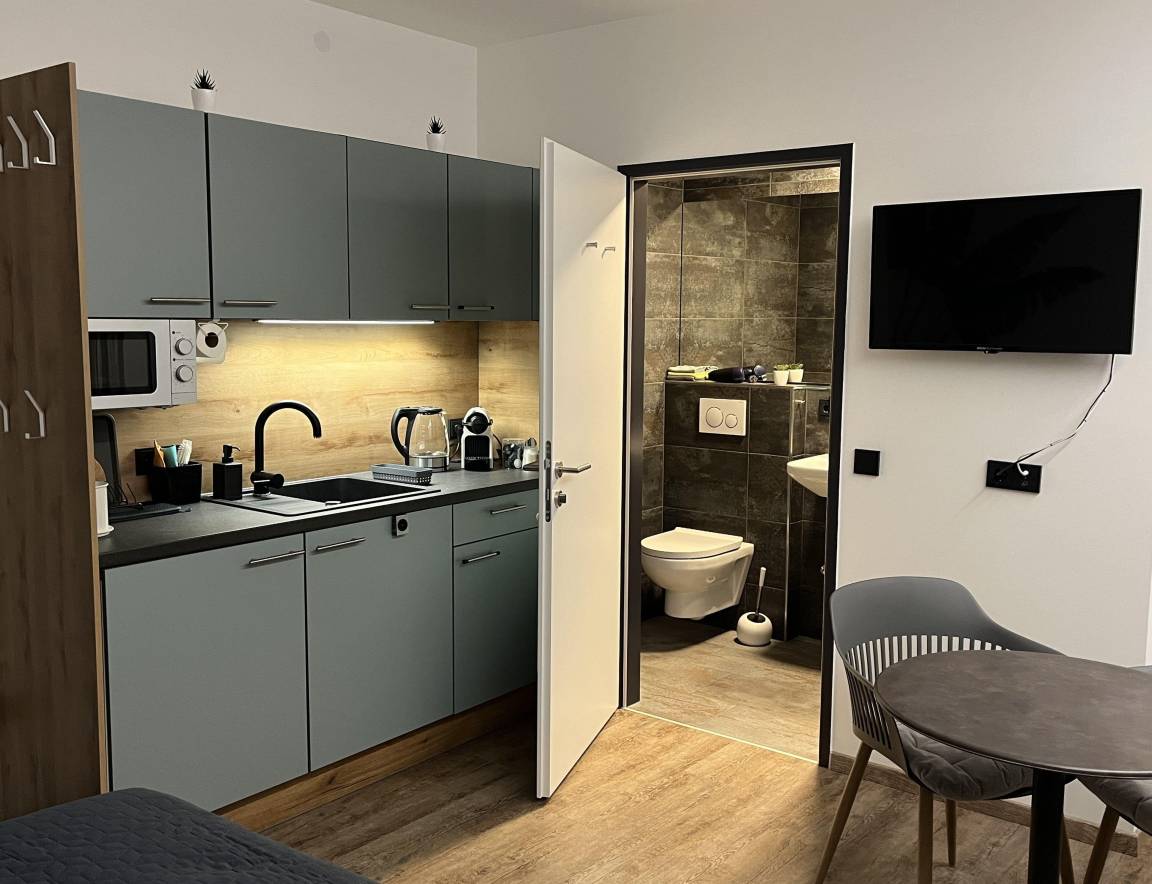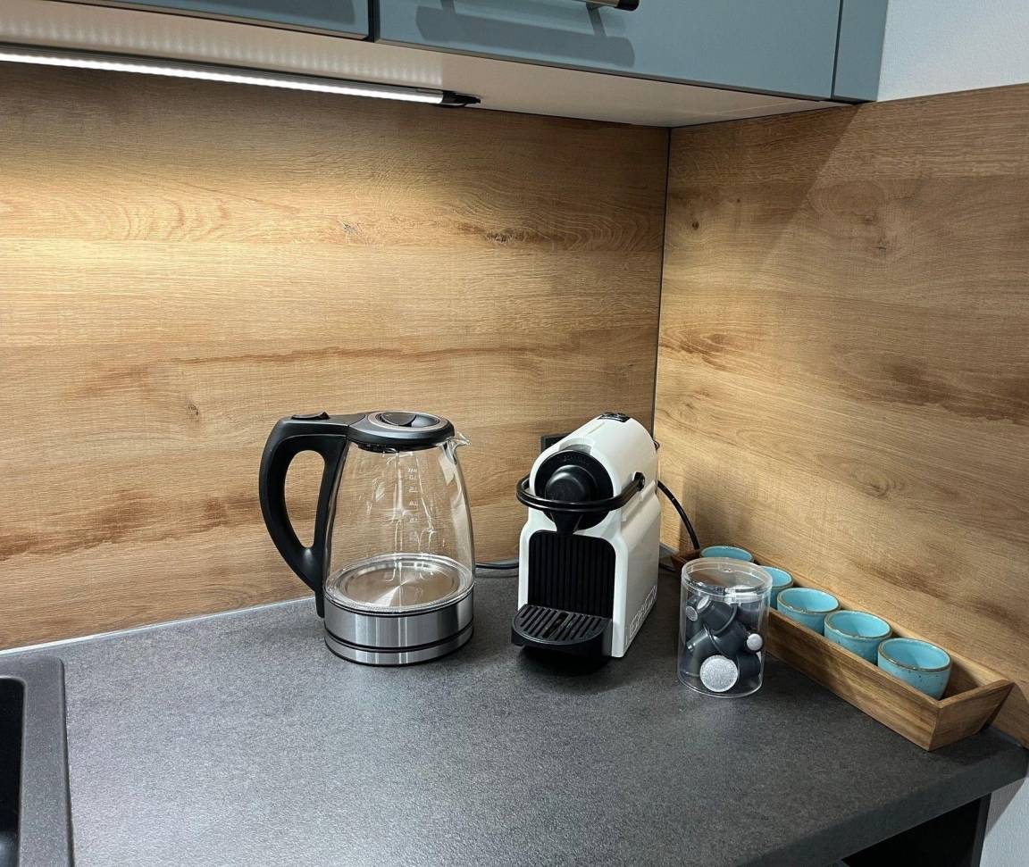 Doppelbett (Boxspringbett 200 x 180 cm), Badezimmer mit geräumiger Dusche inklusive Duschgel und Shampoo, Handtücher und Föhn, Smart-TV, kleine Küche mit Mikrowelle, Induktions-Kochplatte, Wasserkocher, Kühlschrank, Toaster, Nespresso Kaffeemaschine und jede Menge Tee und Kaffee.