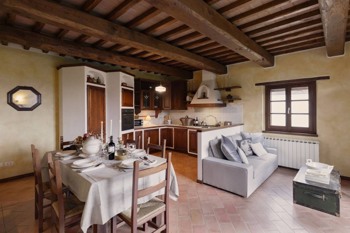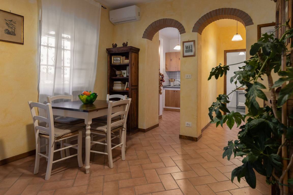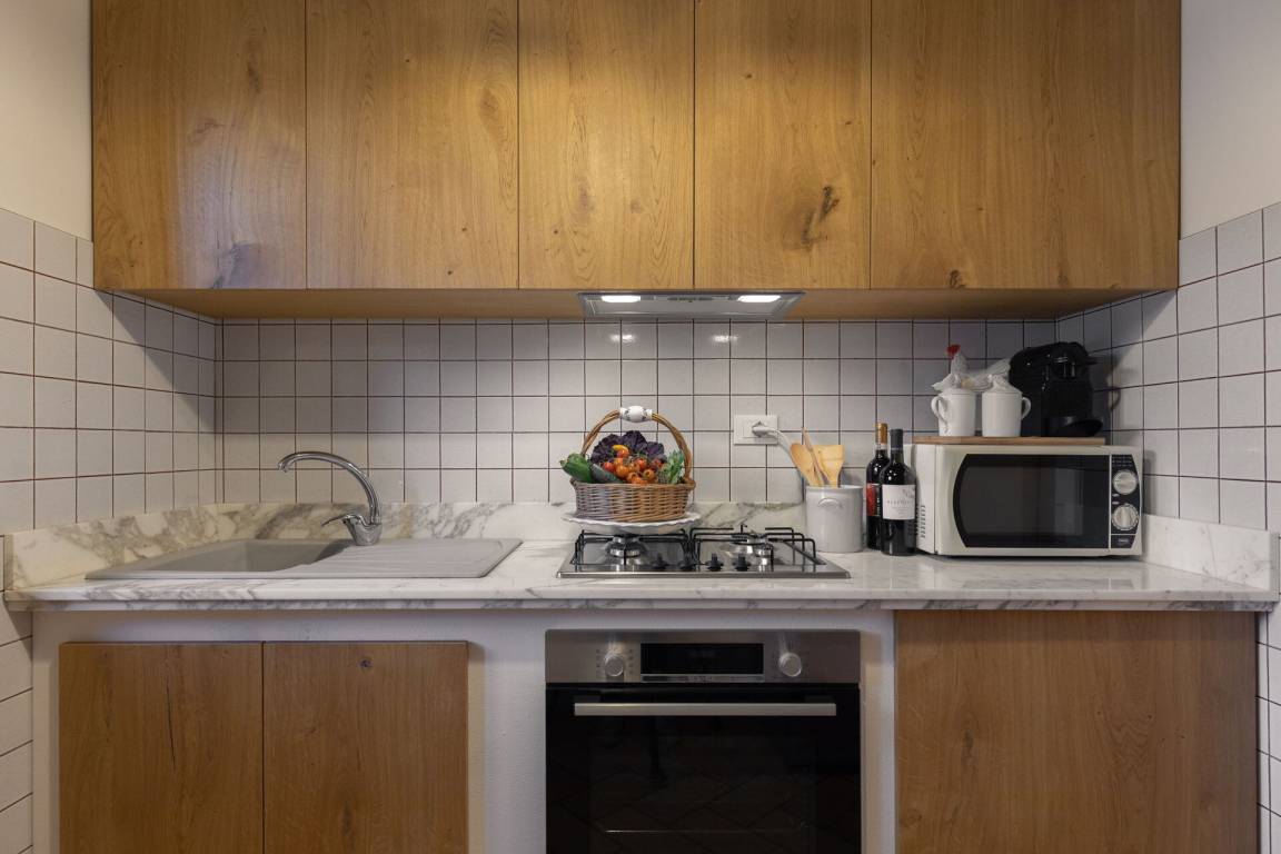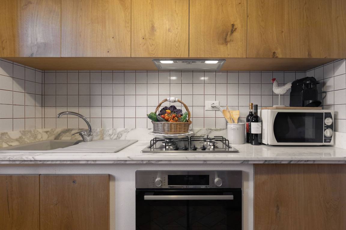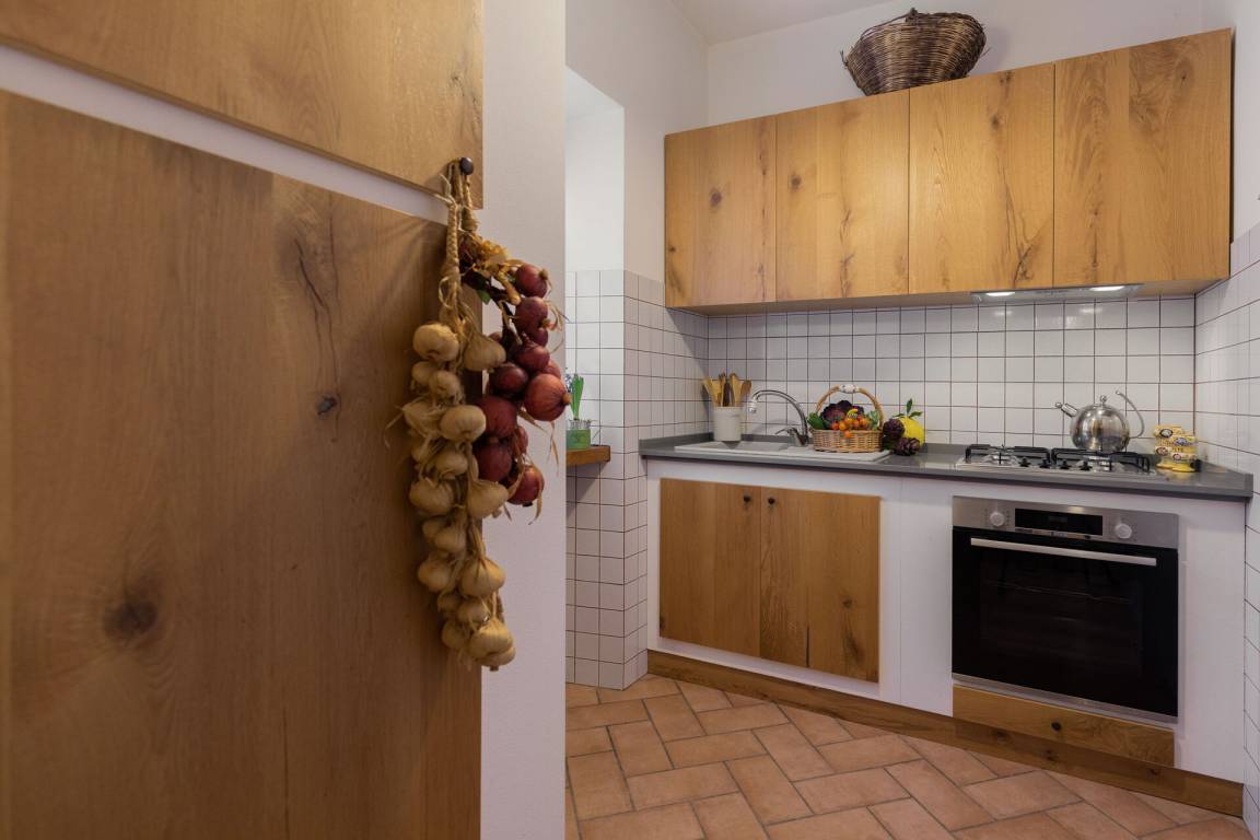 Wohnküche: gut ausgestattete Küche, Esstisch, Kühlschrank, Tiefkühler, Mikrowelle, Herd, Ofen, Toaster, Italienische Kaffeemaschine, Sofa, WiFi Internet, TV, Ausgang auf die Terrasse.