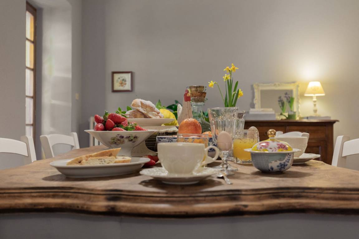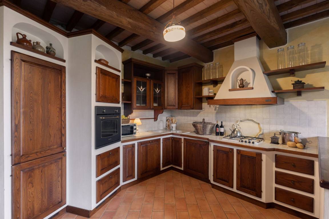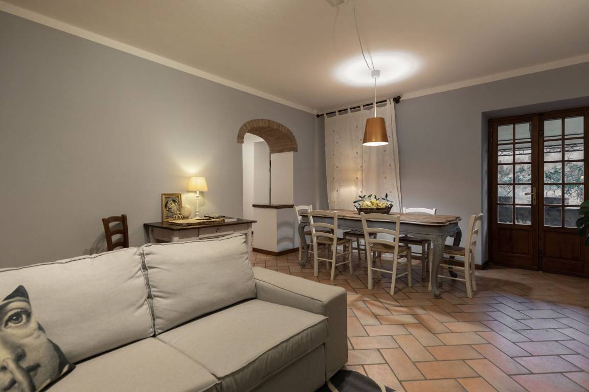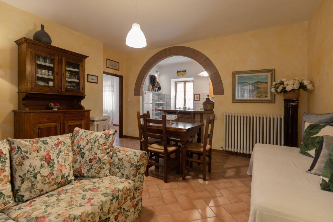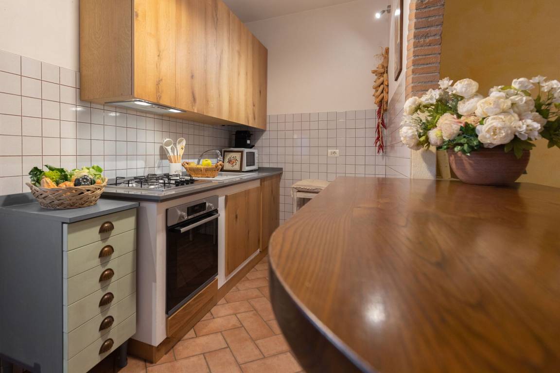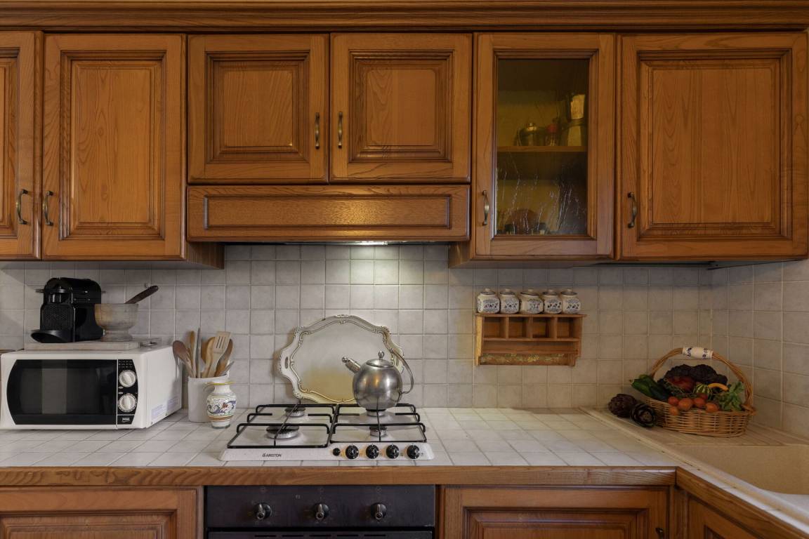 Wohnküche: gut ausgestattete Küche, Esstisch, Spülmaschine, Kühlschrank, Tiefkühler, Mikrowelle, Herd, Ofen, Toaster, Italienische Kaffeemaschine, Waschmaschine, Sofa, WiFi Internet, TV, Ausgang auf den Garten.