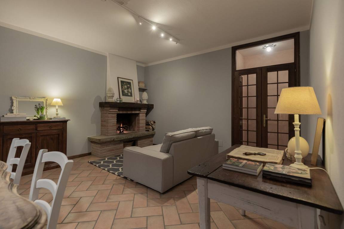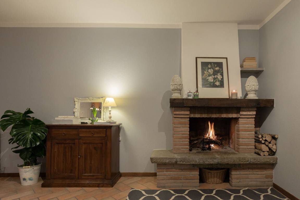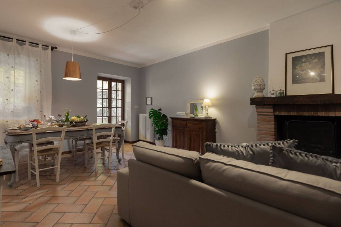 Wohnzimmer 3: Sofa, Kamin, Esstisch, WiFi Internet, TV, Ausgang auf den Garten.