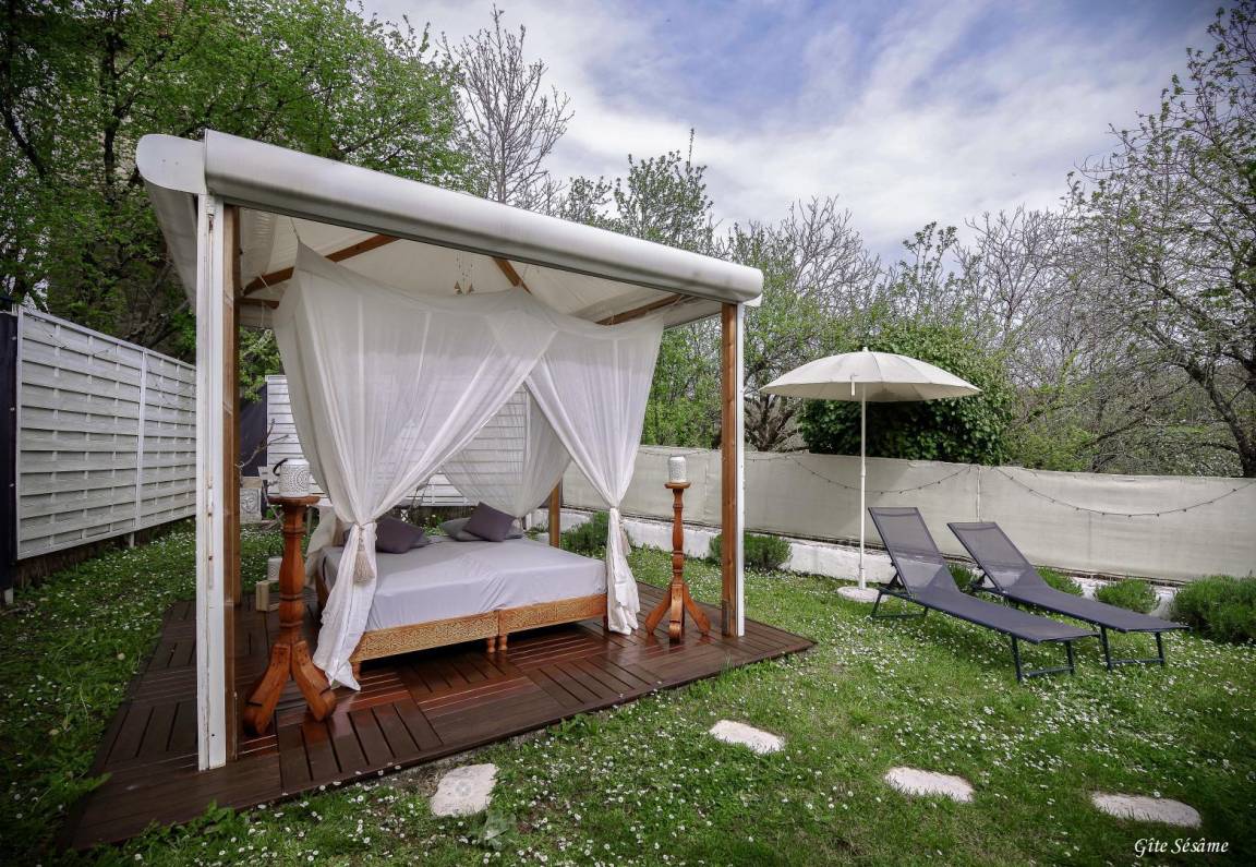 „Ce gîte est une merveille de confort, de simplicité et d'élégance. Il permet de couper temporairement avec les soucis, de prendre de la distance et de se requinquer. Les propriétaires sont chaleureux et sympathiques. Le gîte offre un espace intérieur et 2 espaces extérieurs dont un petit jardin aménagé comme un espace poétique avec un lit extérieur dans une alcôve de bois. Il faut oser soulever les volets roulants qui protègent l'alcôve, et venir dormir sous la moustiquaire de voile blanc, à la lueur de la lune ou des lampions solaires ajourés. Une expérience exceptionnelle.“