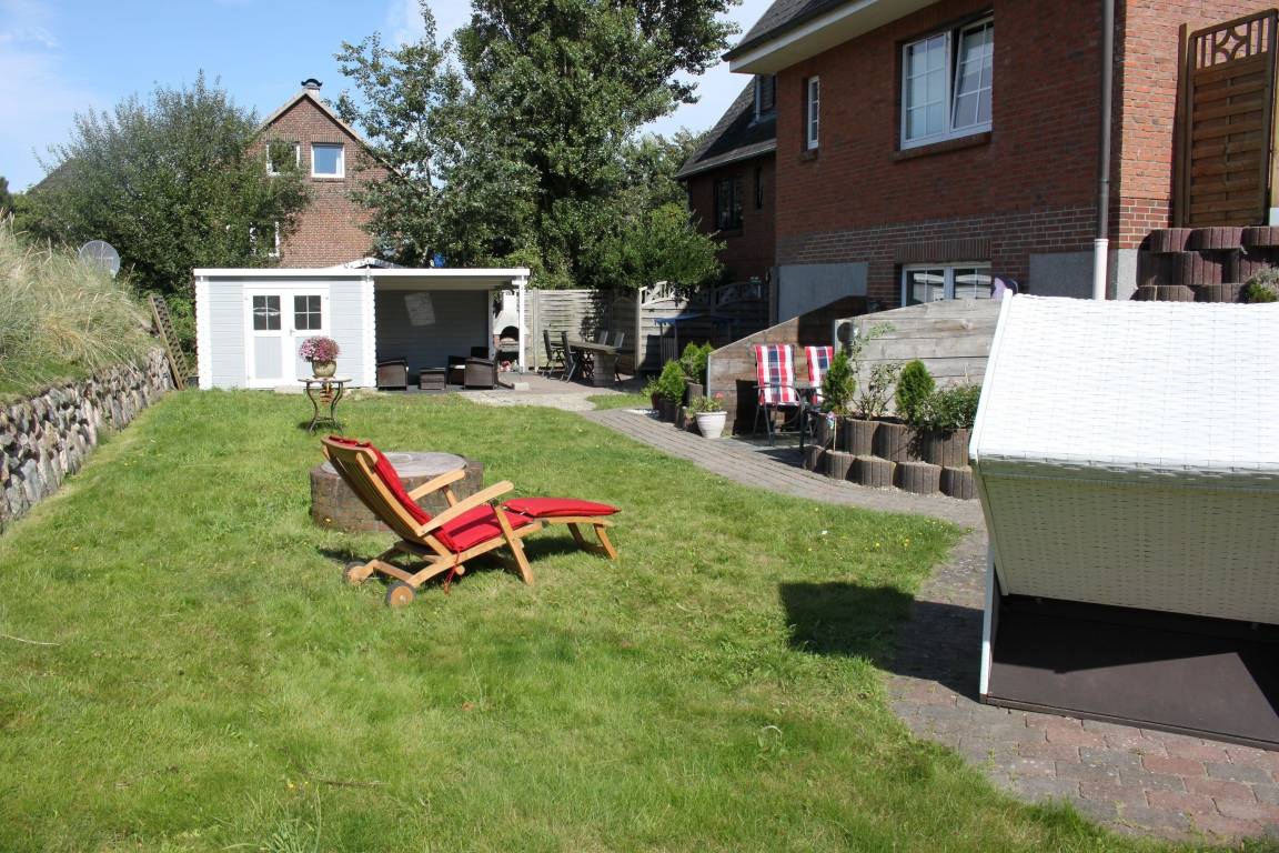 Im Garten befindet sich eine Lounge mit Gartenmöbeln.