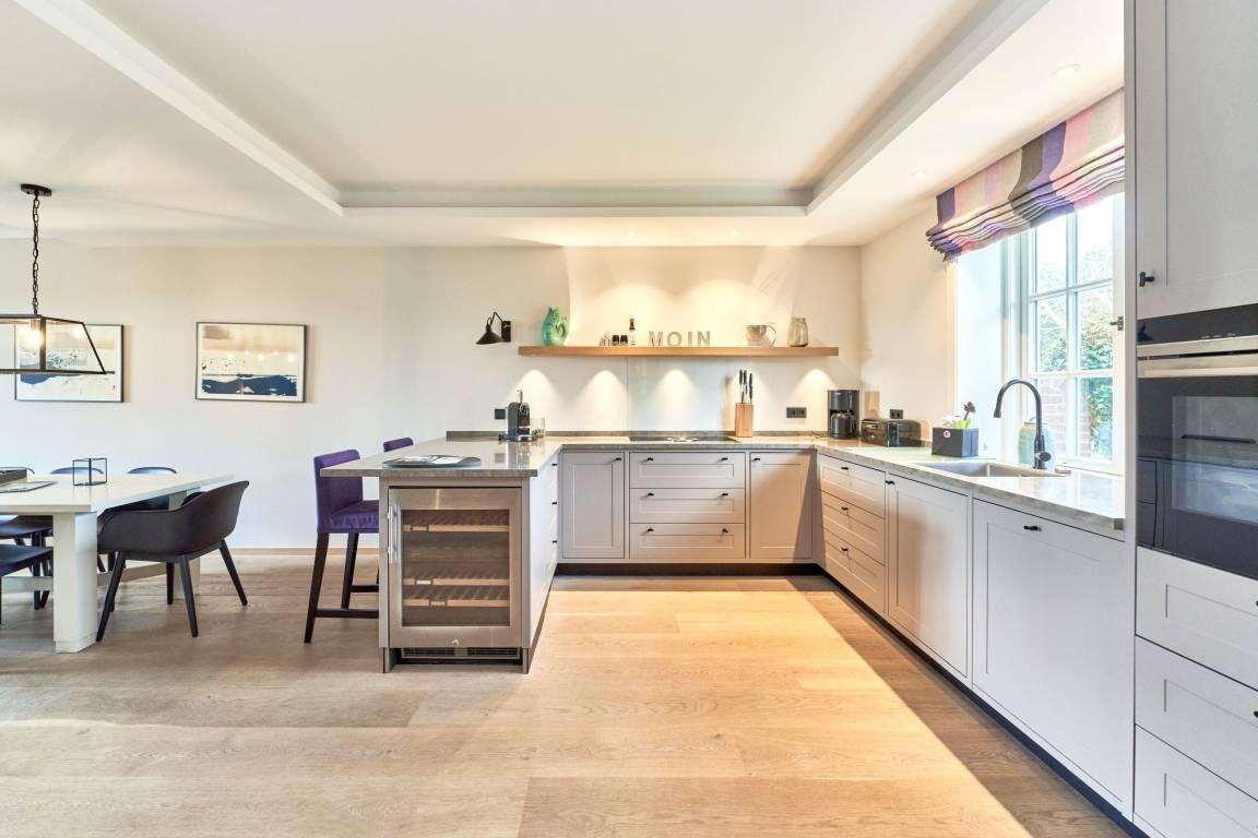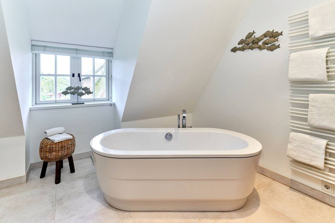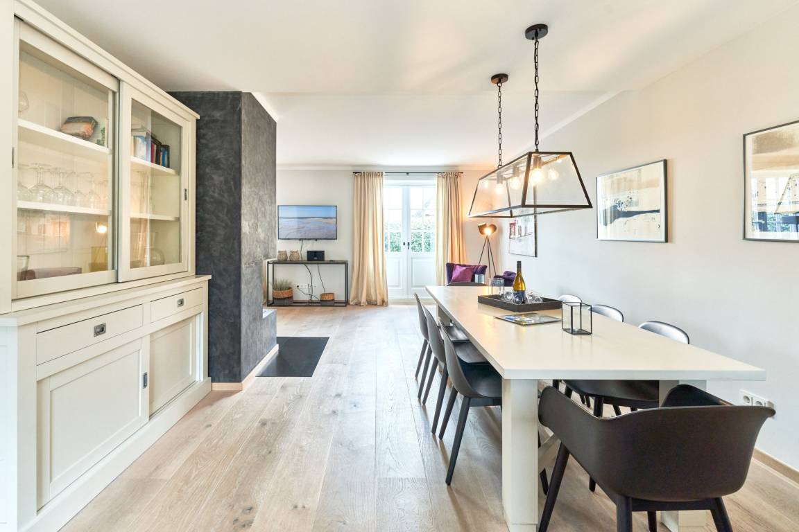 Es erwartet Sie ein außergewöhnlich großes und luxuriöses Ferienhaus unter Reet, alles kernsaniert, modern designt, individuell und ausgesprochen hochwertig ausgestattet mit jeweils 3 Doppelschlafzimmern und 3 Bädern, Der große Wohn-Essbereich mit Kamin und offener Küche lässt keinerlei Wünsche an Raumaufteilung und Ausstattung offen. Das Haus verfügt über einen Fitnessraum mit Crosstrainer, Fahrrad, Rudergerät und Yogamatte sowie einen separatem Duschbad mit WC. Der geschmackvolle Garten verfügt über zwei Terrassen eine mit Gartenmöbel und Tisch sowie die Süd - Terrasse mit Strandkorb. Stellplatz steht am Haus kostenlos zur Verfügung. Das Haus verfügt ab dem 01.01.2024 über eine E- Auto- Ladestation am dazugehörigen Parkplatz am Haus.