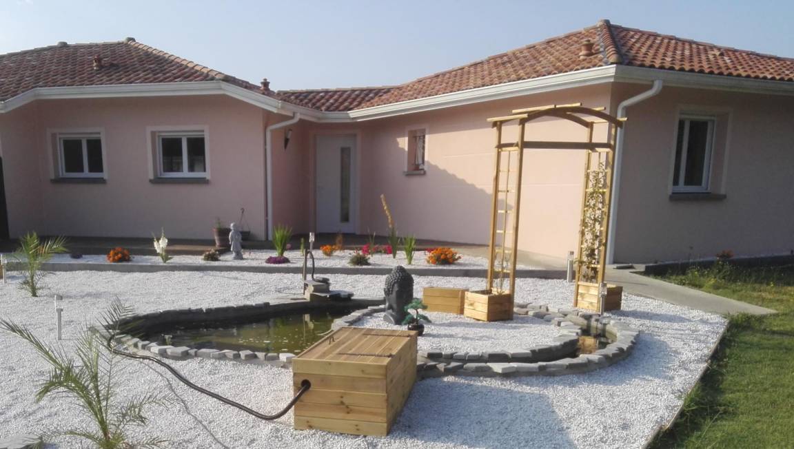Eine Terrasse mit Gartenmöbeln, Grill und Plancha erweitert den Innenwohnraum.