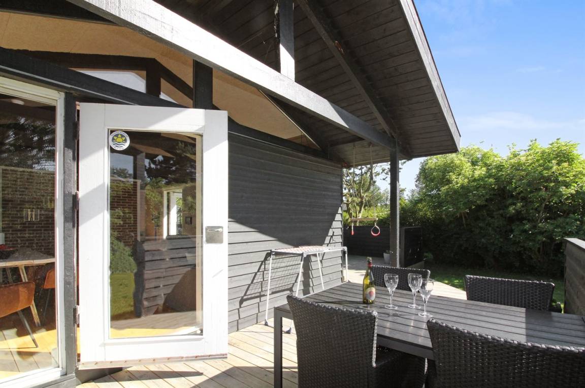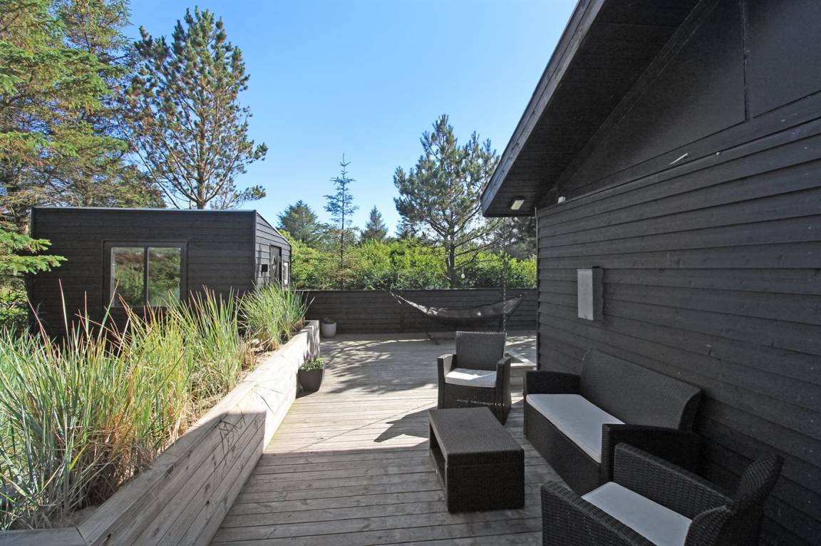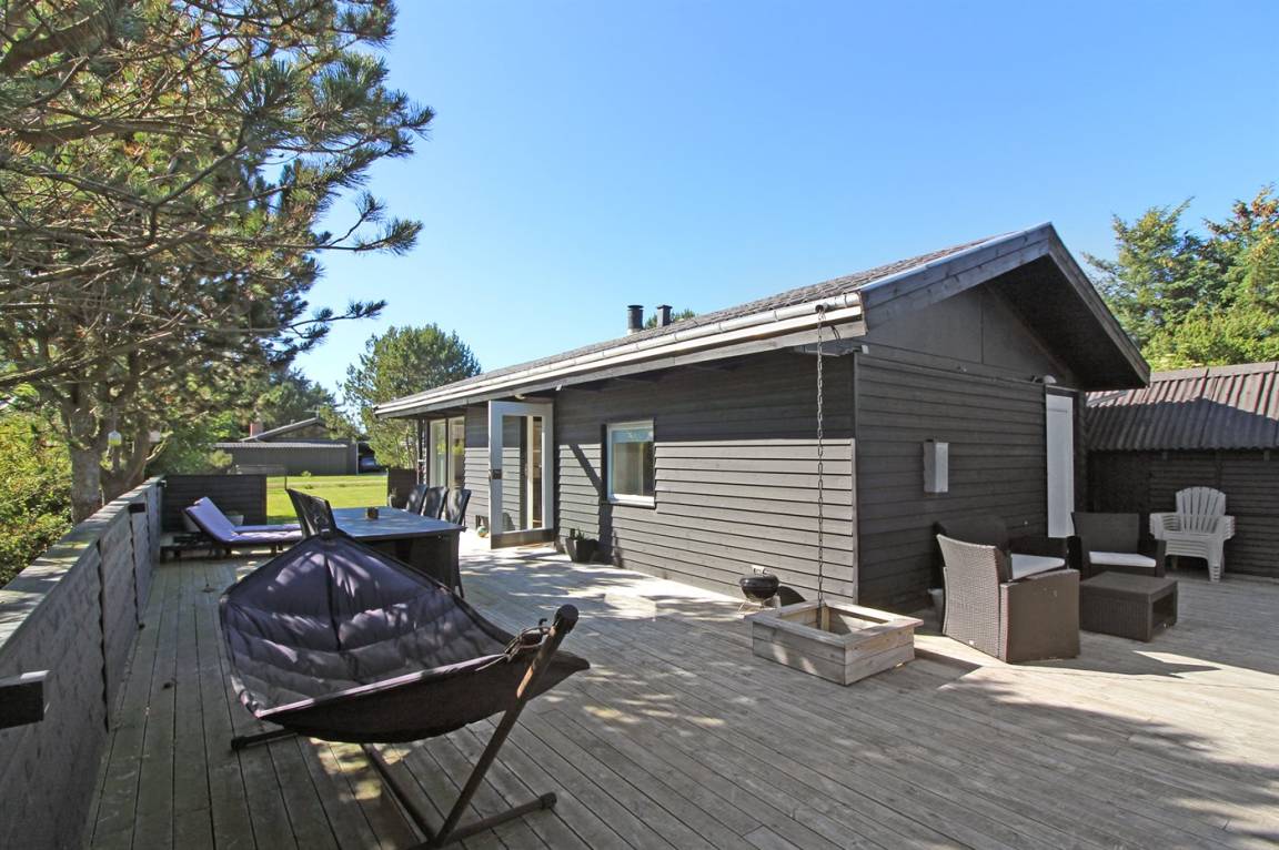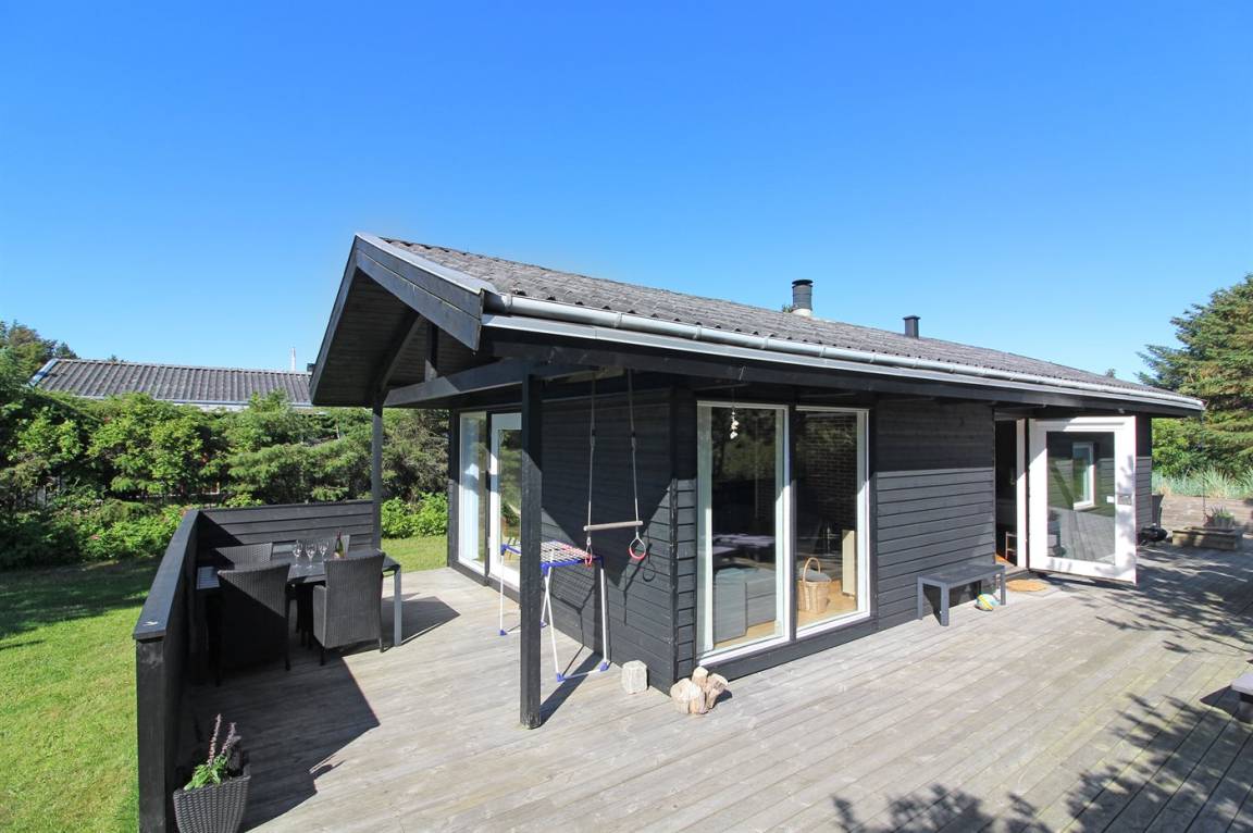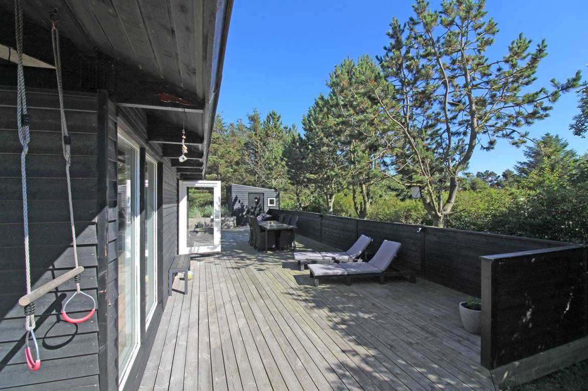 Das Ferienhaus ist von einer großen Holzterrasse umgeben, und du musst nicht an den Strand gehen, um das Strandsgefühl zu erleben, da am Rand der Terrasse eine gemütliche kleine Strand-Oase angelegt ist. Das Hängemattengestell und die Spielgeräte im Außenbereich bieten ausreichend Platz für Kinder und Kindgebliebene.