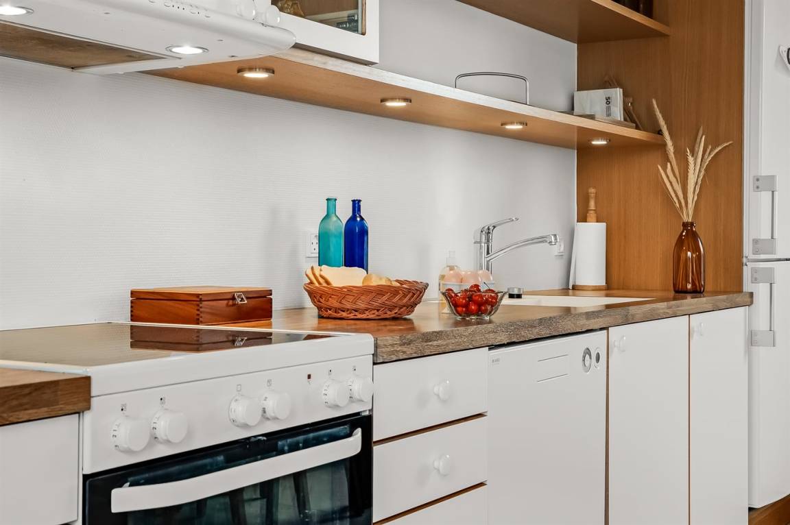 KücheDie Küche ist mit Kühlschrank ausgestattet. Außerdem gibt es 4 Keramik-Kochfelder, Umluftofen, Mikrowelle sowie Geschirrspüler. Fußbodenheizung in der Küche.