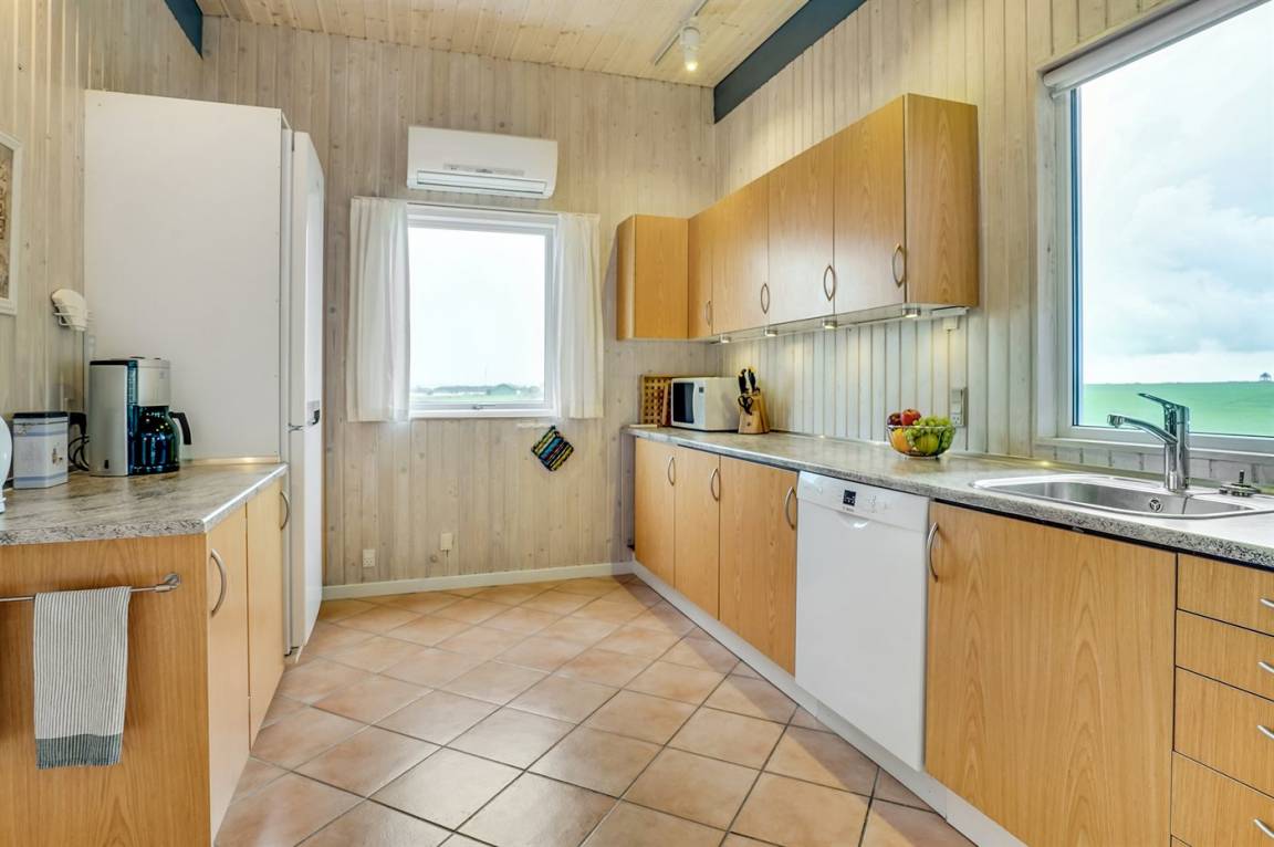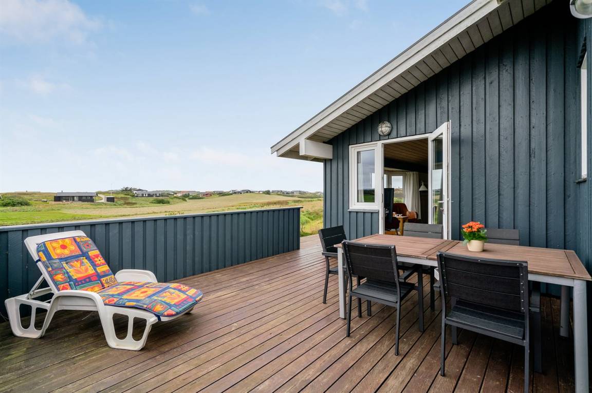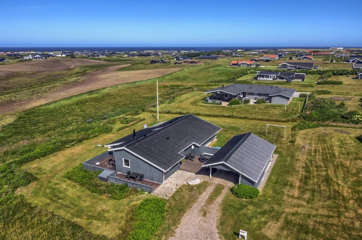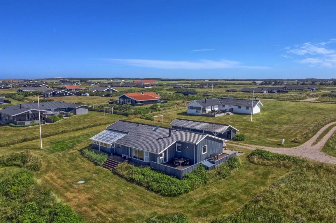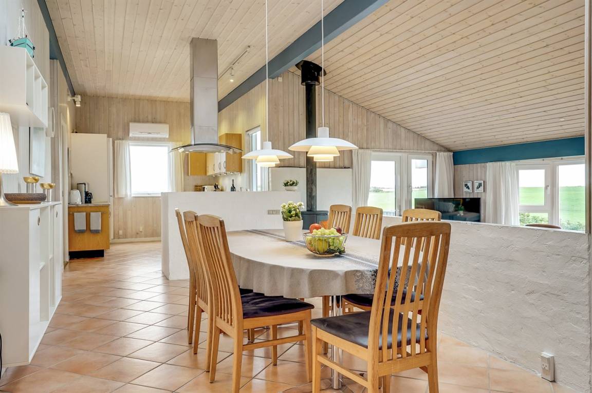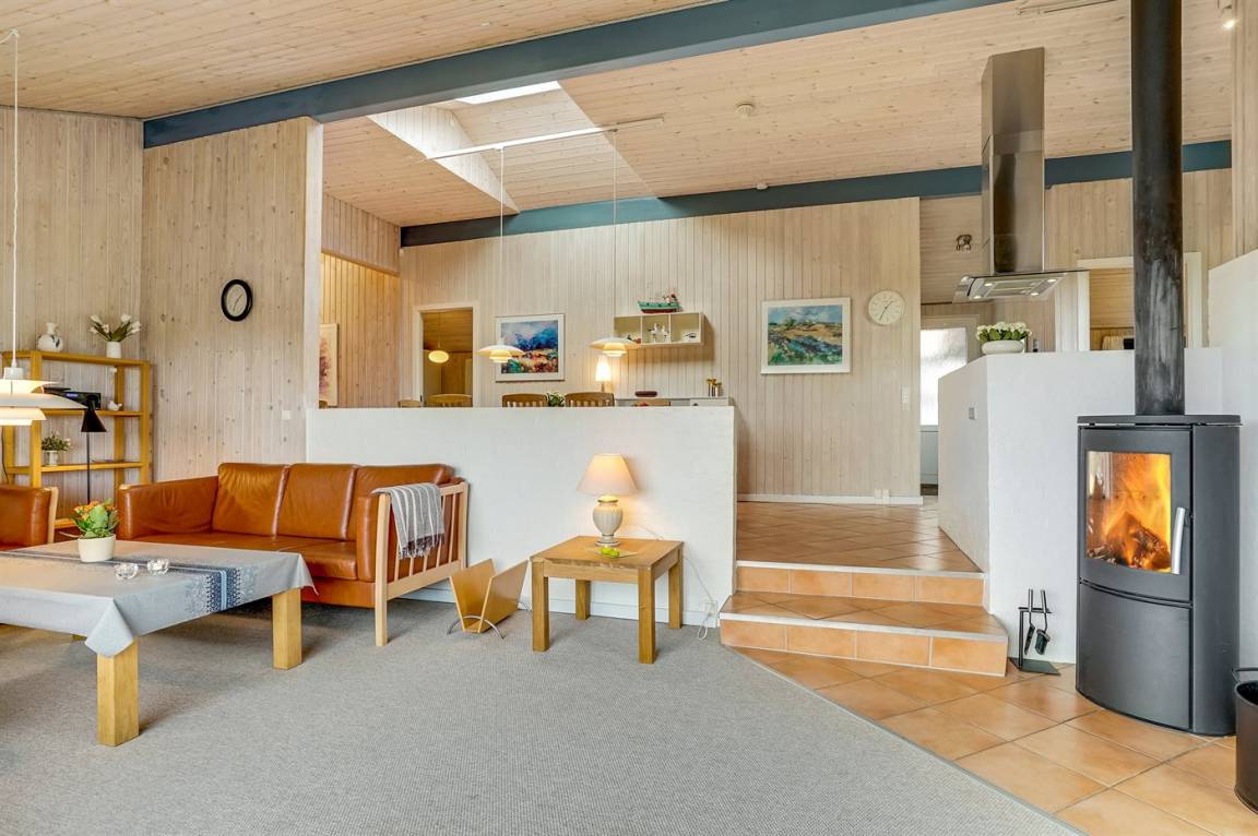 Dieses große Ferienhaus ist in versetzter Ebene gebaut, 2004 baulich erweitert, laufend modernisiert und instand gehalten. Die Lage ist einmalig – das Haus liegt am Ende einer Sackgasse und das Grundstück grenzt an offene Felder an. Vom Haus gibt es eine schöne Aussicht auf die Felder und das umliegende Ferienhausgebiet. Zum Haus gehört eine große Terrassenfläche, die das Haus auf 3 Seiten umgibt. Die in Richtung Westen gerichtete Terrasse ist überdacht und abgeschirmt. Beheizbare Klinkerböden in der Küche, im Esszimmer, im Flur und in den Badezimmern. Das Haus ist mit Qualitätsmöbeln eingerichtet.