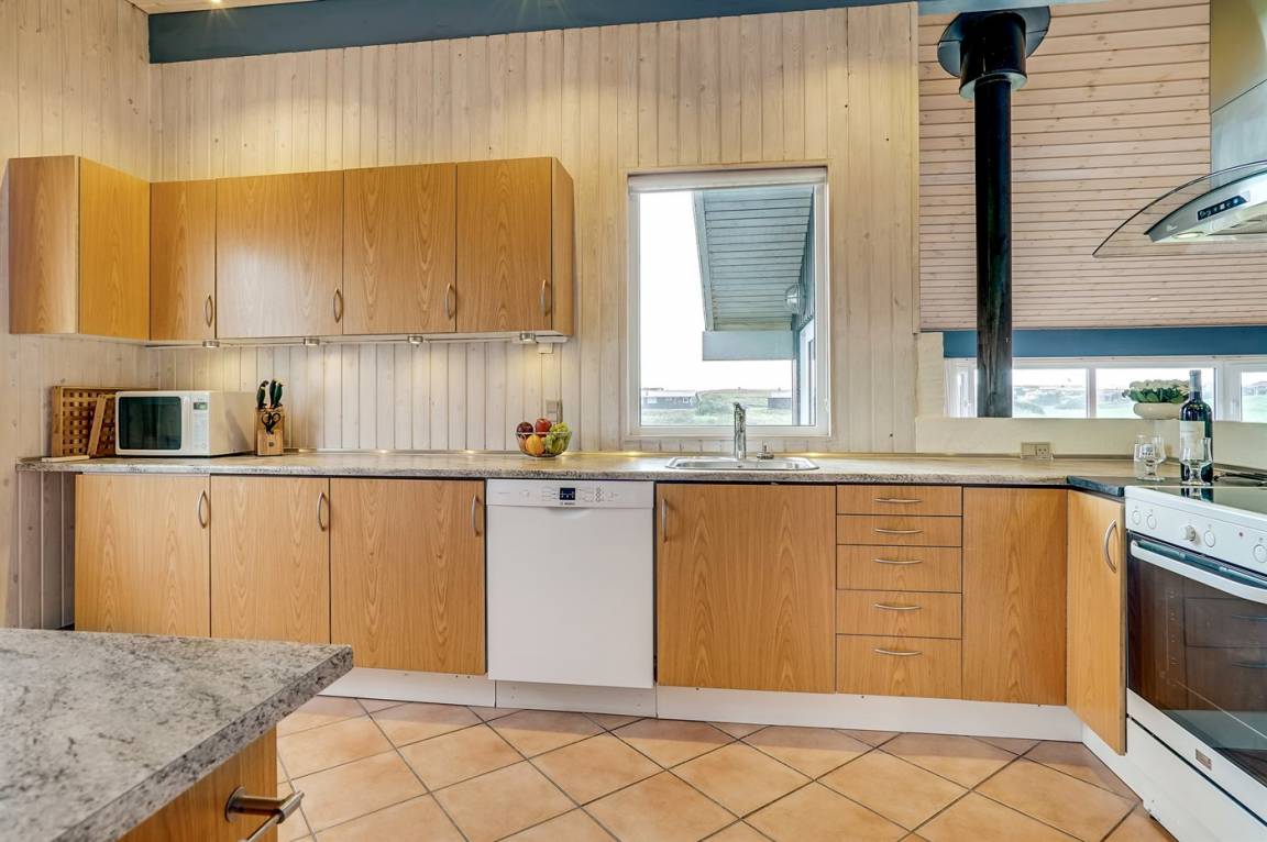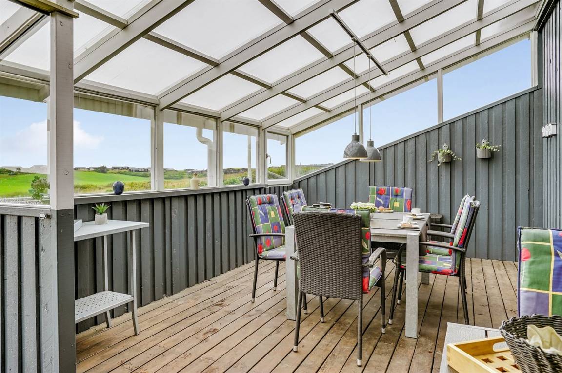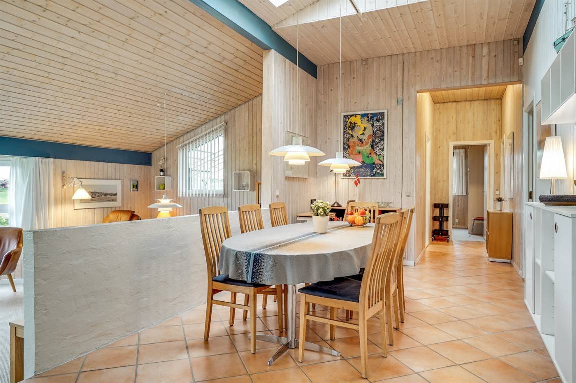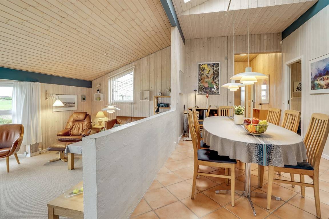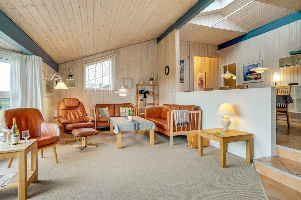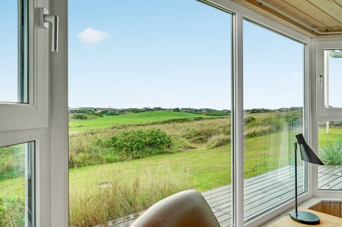 Dieses große Ferienhaus ist in versetzter Ebene gebaut, 2004 baulich erweitert, laufend modernisiert und instand gehalten. Die Lage ist einmalig – das Haus liegt am Ende einer Sackgasse und das Grundstück grenzt an offene Felder an. Vom Haus gibt es eine schöne Aussicht auf die Felder und das umliegende Ferienhausgebiet. Zum Haus gehört eine große Terrassenfläche, die das Haus auf 3 Seiten umgibt. Die in Richtung Westen gerichtete Terrasse ist überdacht und abgeschirmt. Beheizbare Klinkerböden in der Küche, im Esszimmer, im Flur und in den Badezimmern. Das Haus ist mit Qualitätsmöbeln eingerichtet.