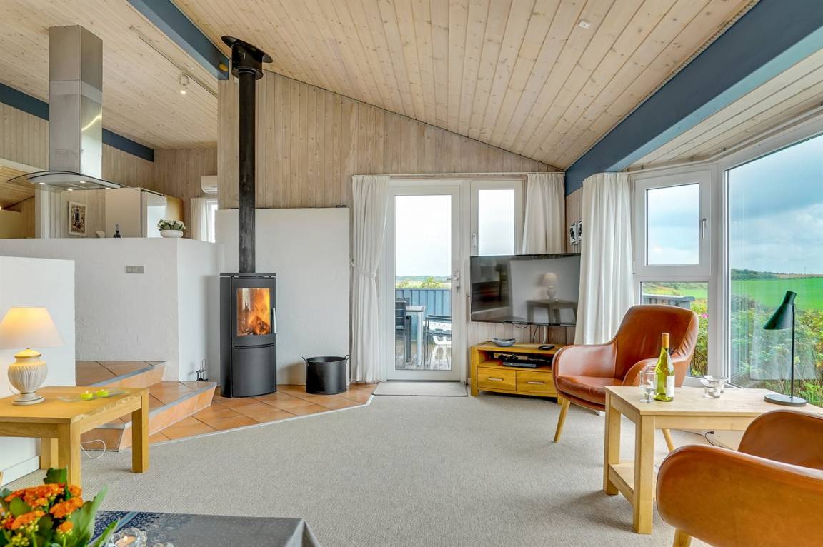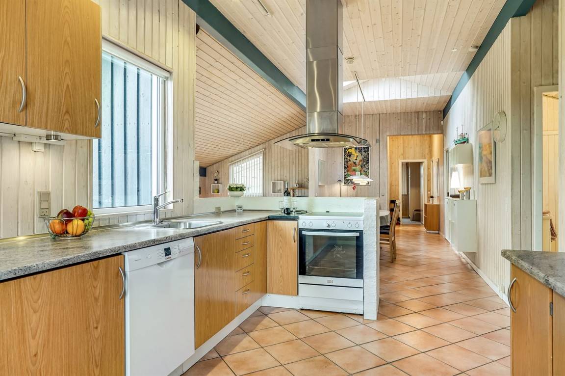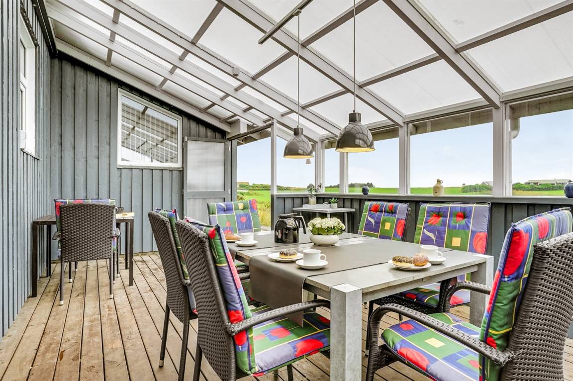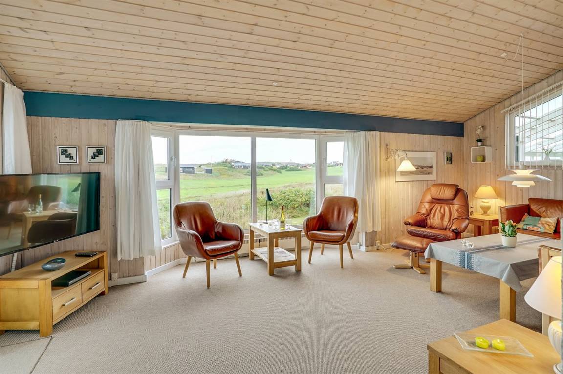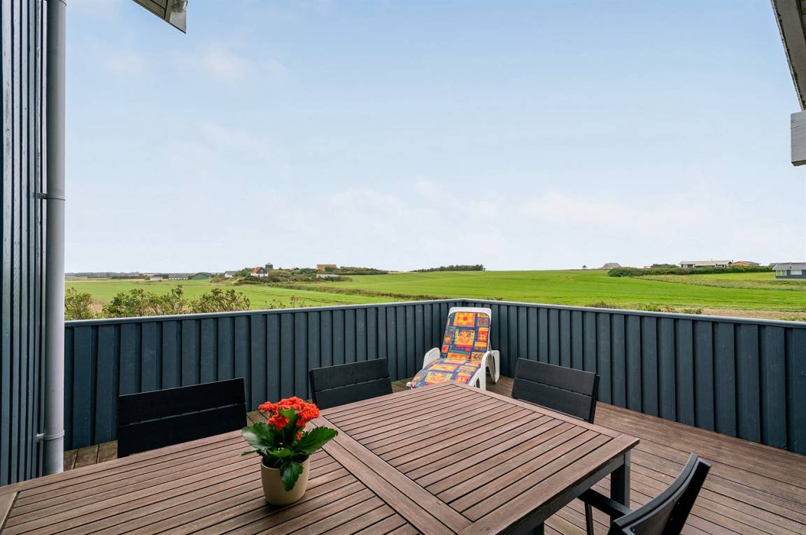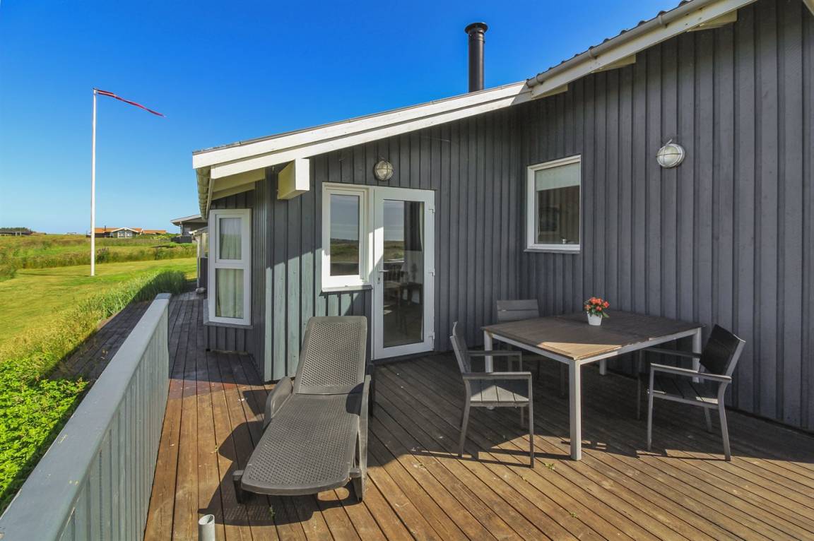 Dieses große Ferienhaus ist in versetzter Ebene gebaut, 2004 baulich erweitert, laufend modernisiert und instand gehalten. Die Lage ist einmalig – das Haus liegt am Ende einer Sackgasse und das Grundstück grenzt an offene Felder an. Vom Haus gibt es eine schöne Aussicht auf die Felder und das umliegende Ferienhausgebiet. Zum Haus gehört eine große Terrassenfläche, die das Haus auf 3 Seiten umgibt. Die in Richtung Westen gerichtete Terrasse ist überdacht und abgeschirmt. Beheizbare Klinkerböden in der Küche, im Esszimmer, im Flur und in den Badezimmern. Das Haus ist mit Qualitätsmöbeln eingerichtet.