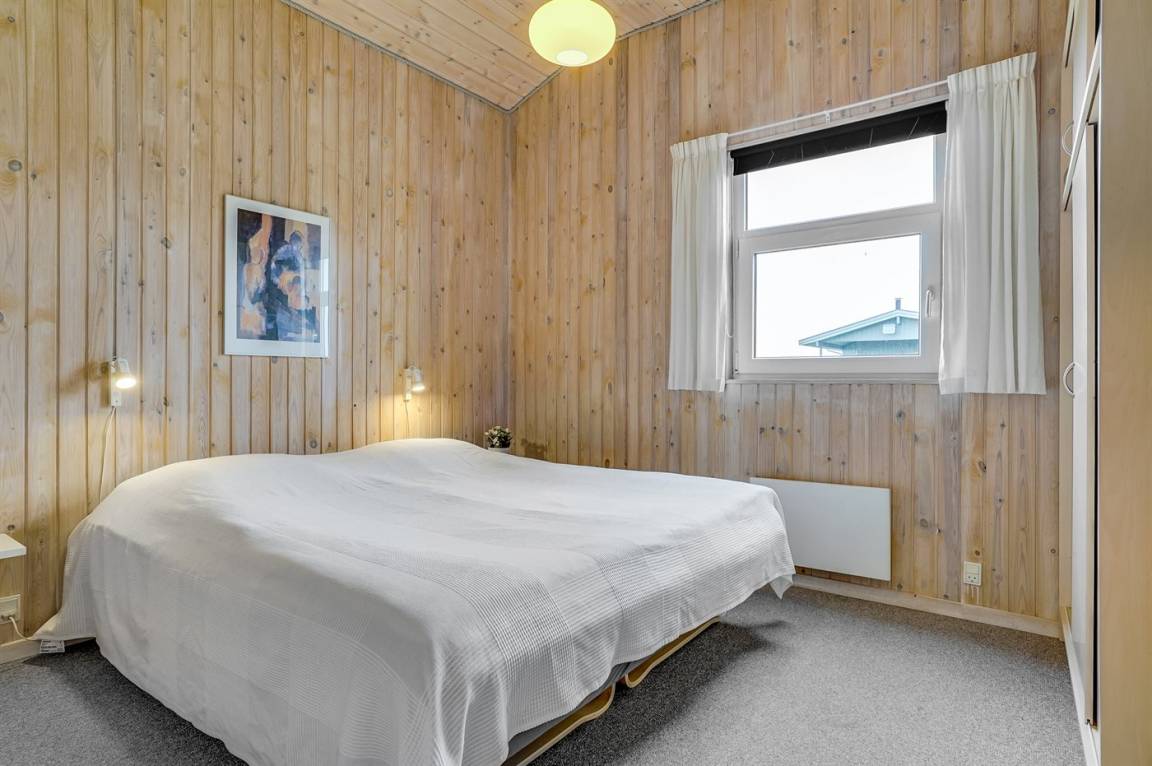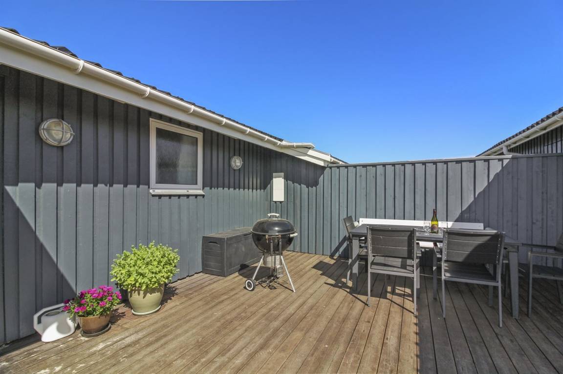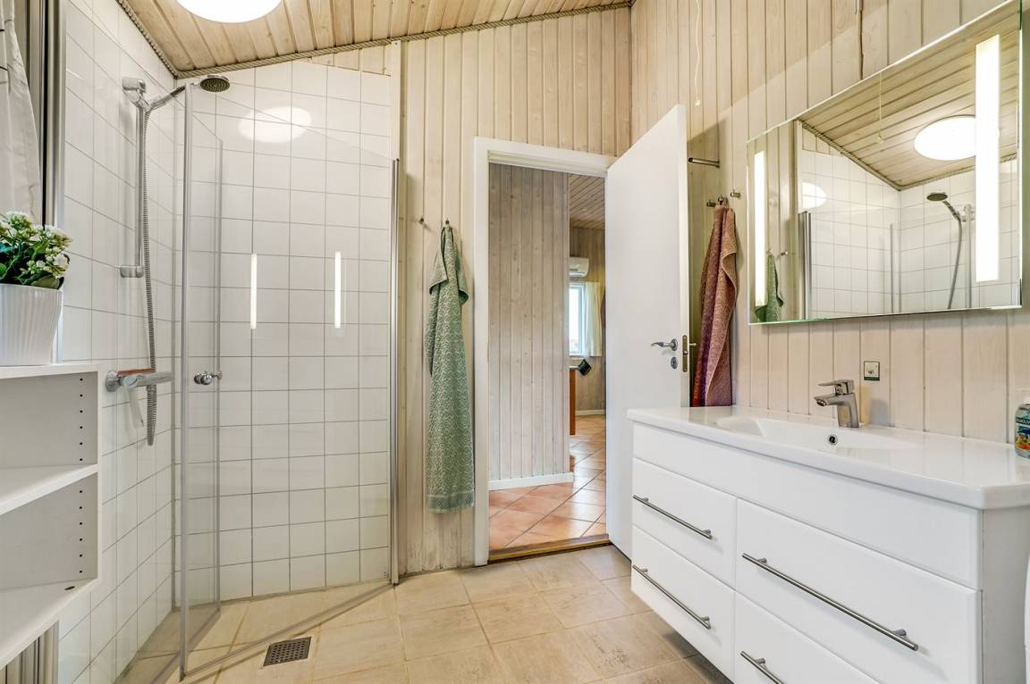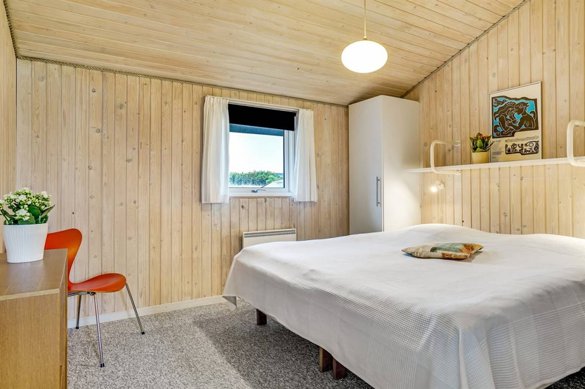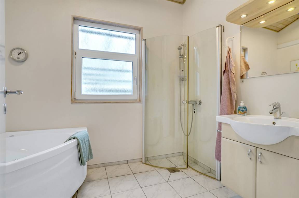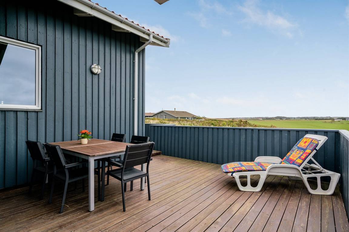 Dieses große Ferienhaus ist in versetzter Ebene gebaut, 2004 baulich erweitert, laufend modernisiert und instand gehalten. Die Lage ist einmalig – das Haus liegt am Ende einer Sackgasse und das Grundstück grenzt an offene Felder an. Vom Haus gibt es eine schöne Aussicht auf die Felder und das umliegende Ferienhausgebiet. Zum Haus gehört eine große Terrassenfläche, die das Haus auf 3 Seiten umgibt. Die in Richtung Westen gerichtete Terrasse ist überdacht und abgeschirmt. Beheizbare Klinkerböden in der Küche, im Esszimmer, im Flur und in den Badezimmern. Das Haus ist mit Qualitätsmöbeln eingerichtet.