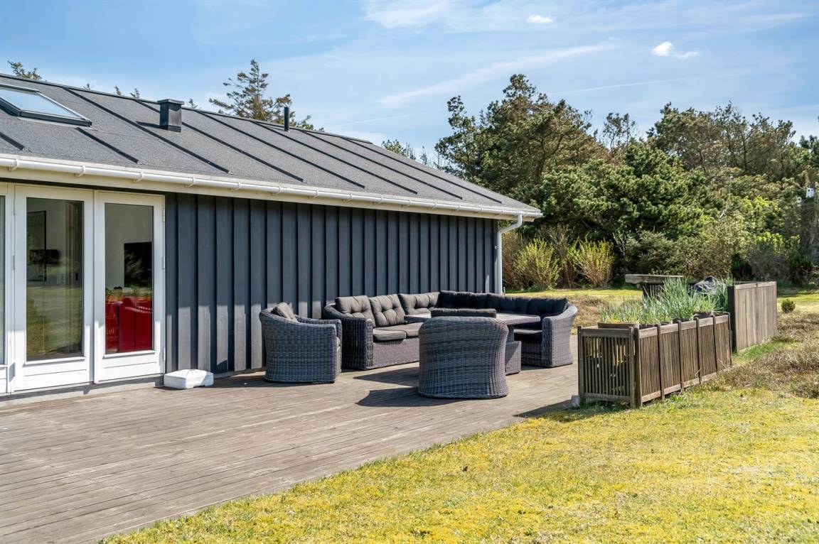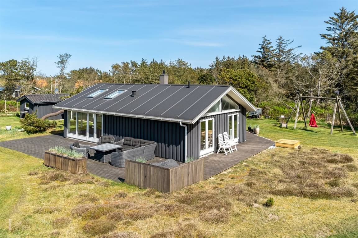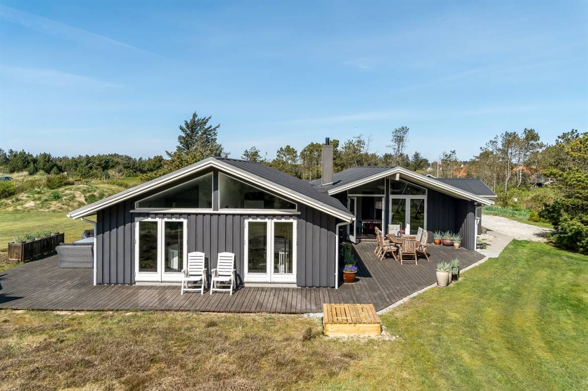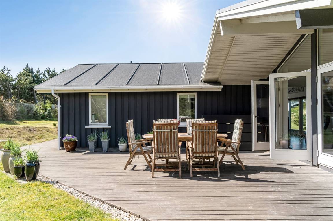 Dieses Ferienhaus liegt auf einem großen, ungestörten Grundstück in einem beliebten Feriengebiet. Zum Haus gehört eine große Holzterrasse, die einen Großteil des Hauses umgibt.
