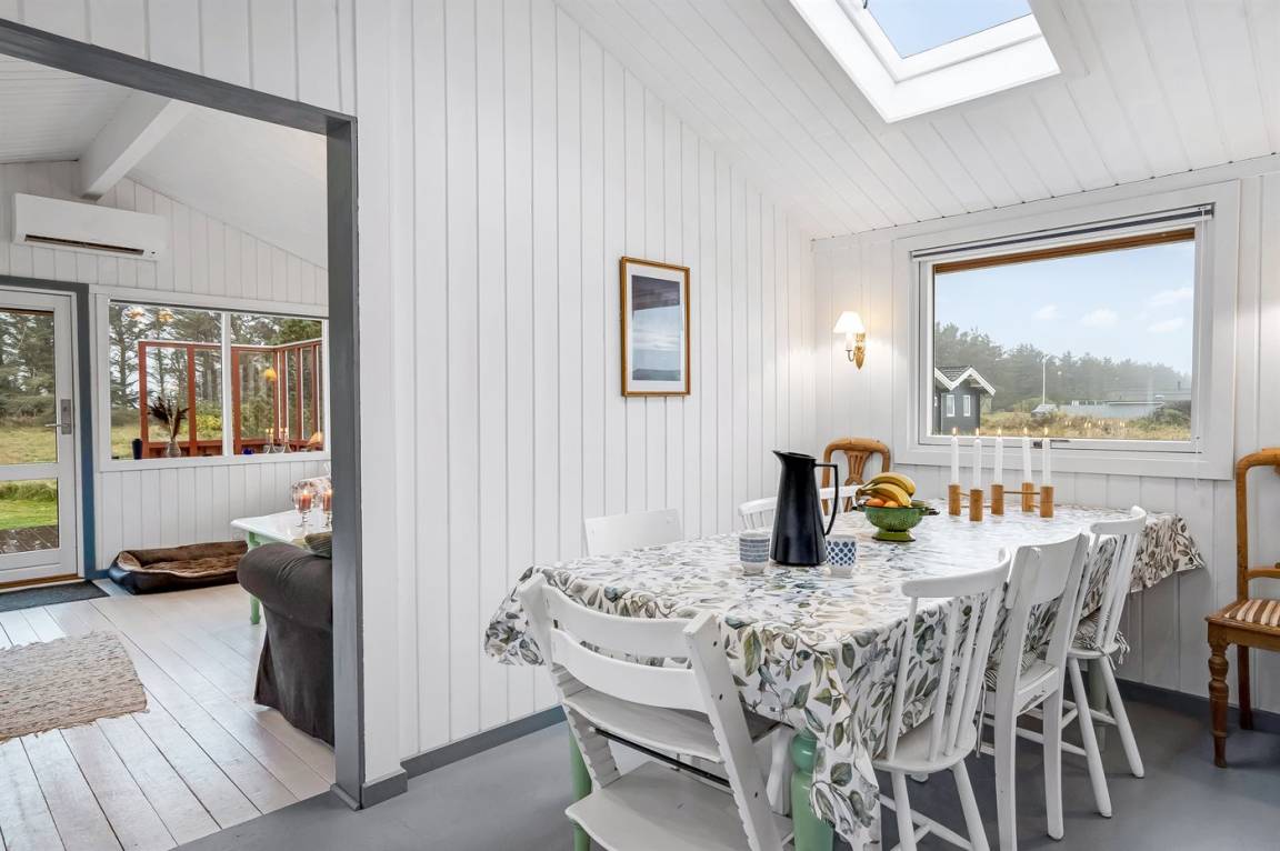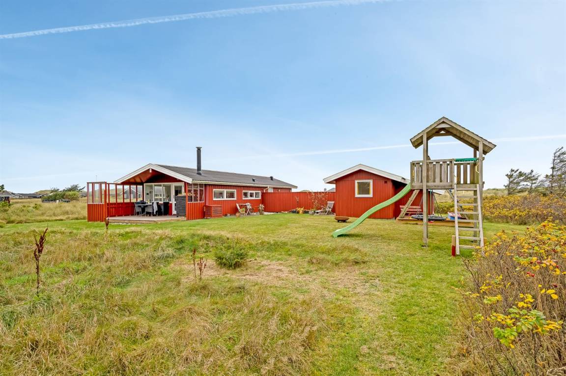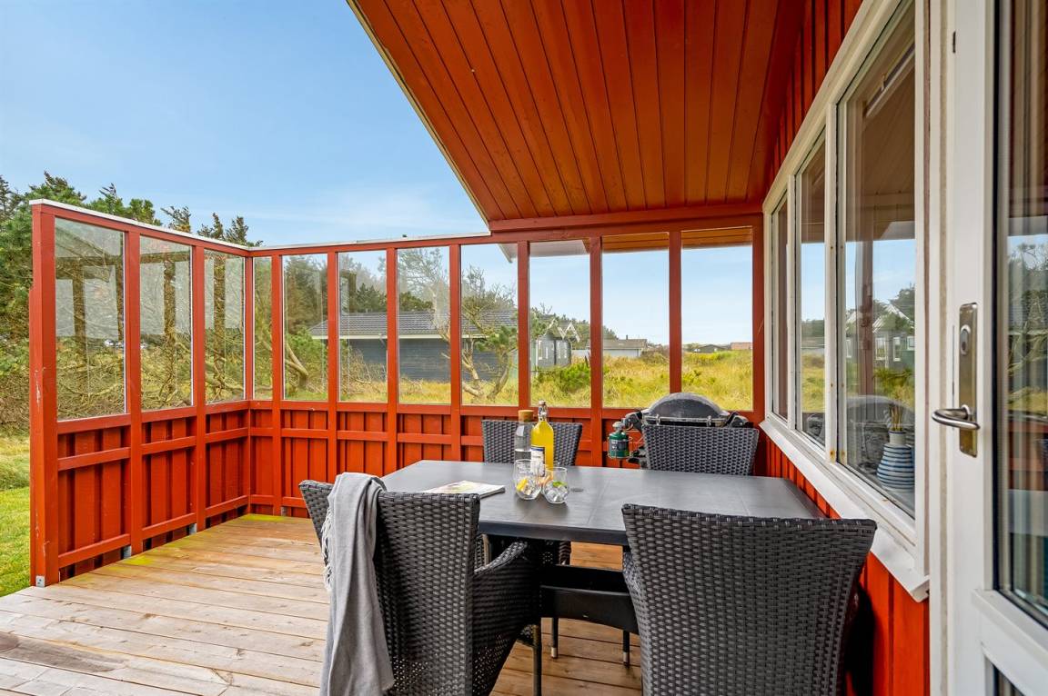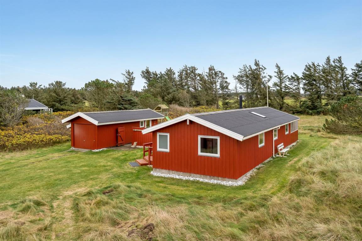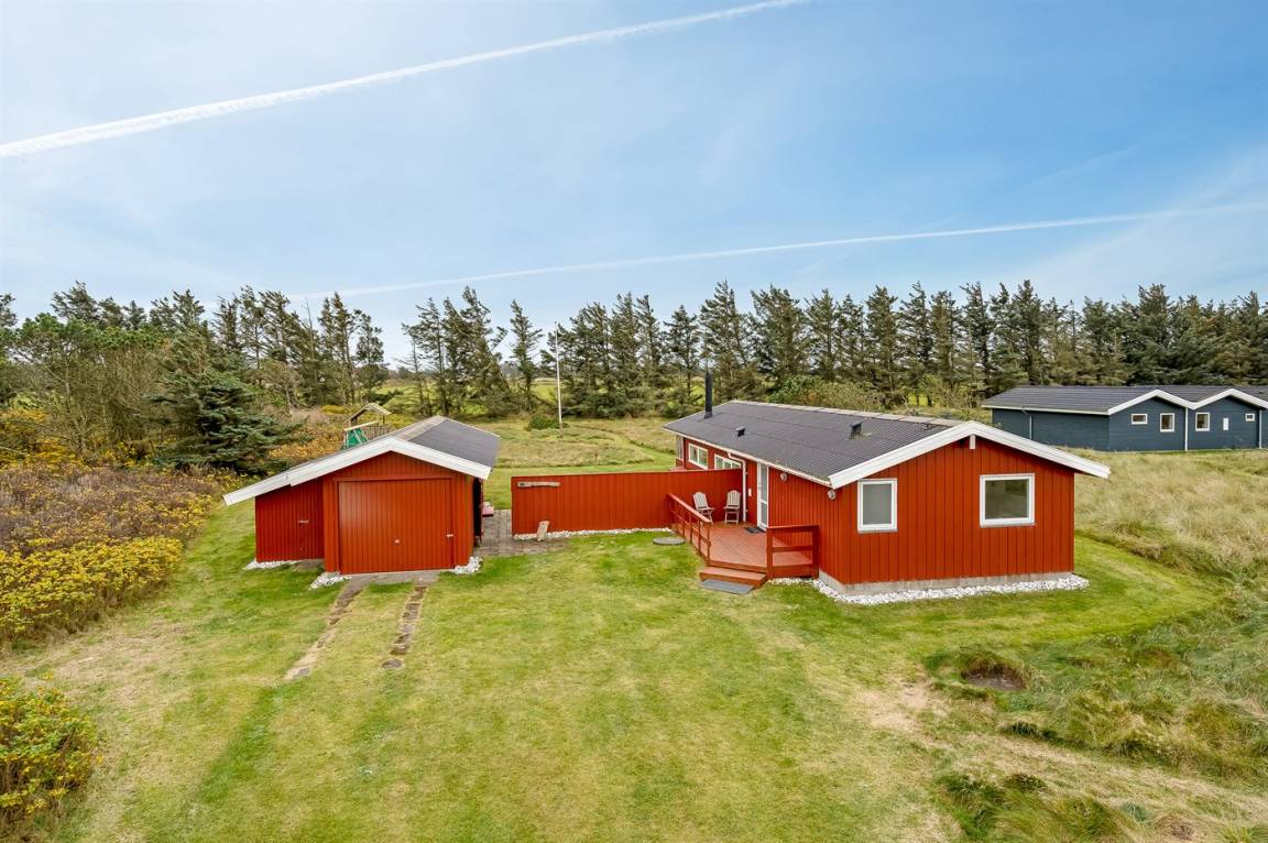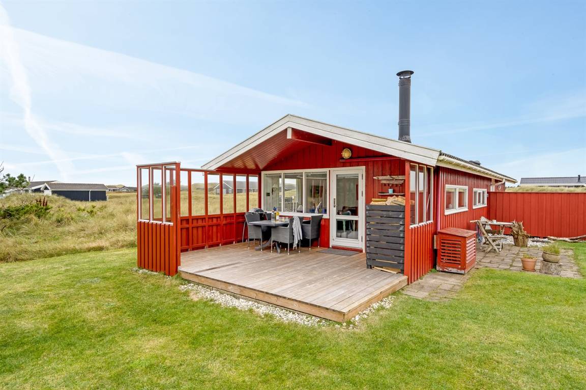 Charmantes Ferienhaus mit Platz für die ganze Familie. Das Haus liegt in der Nähe von Løkken und dem weißen Sandstrand. Das Ferienhaus integriert die Natur, und mit der überdachten Holzterrasse ist es möglich, die späten Sommerabende im Freien zu genießen.