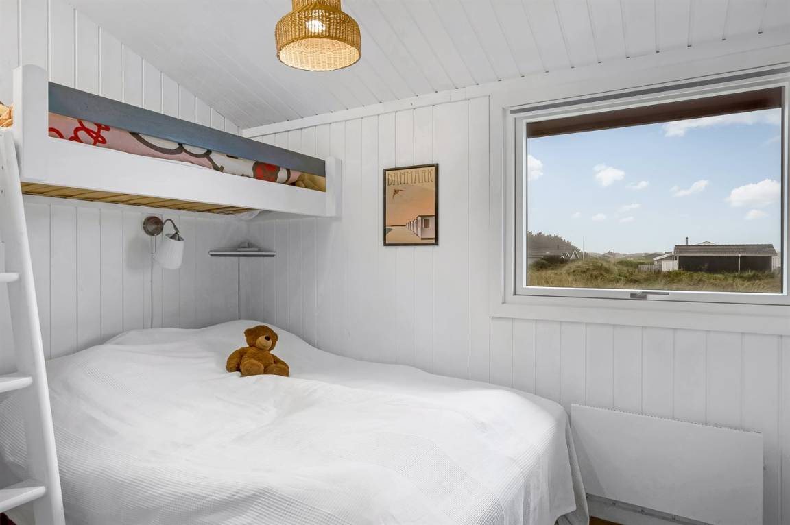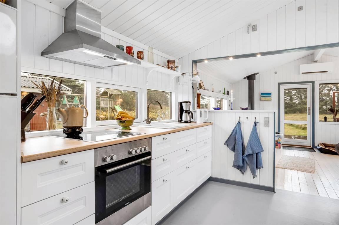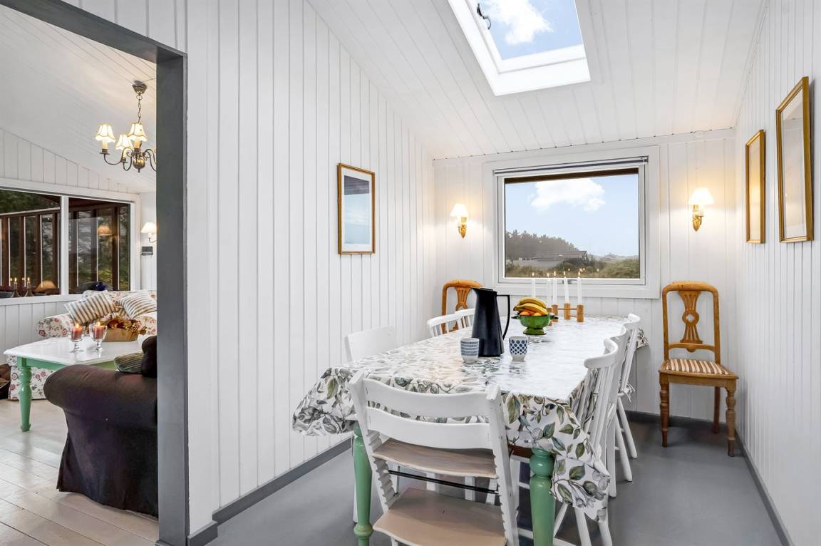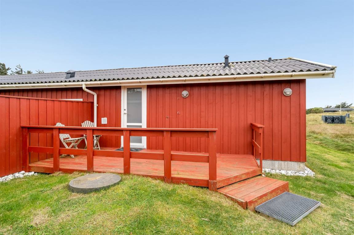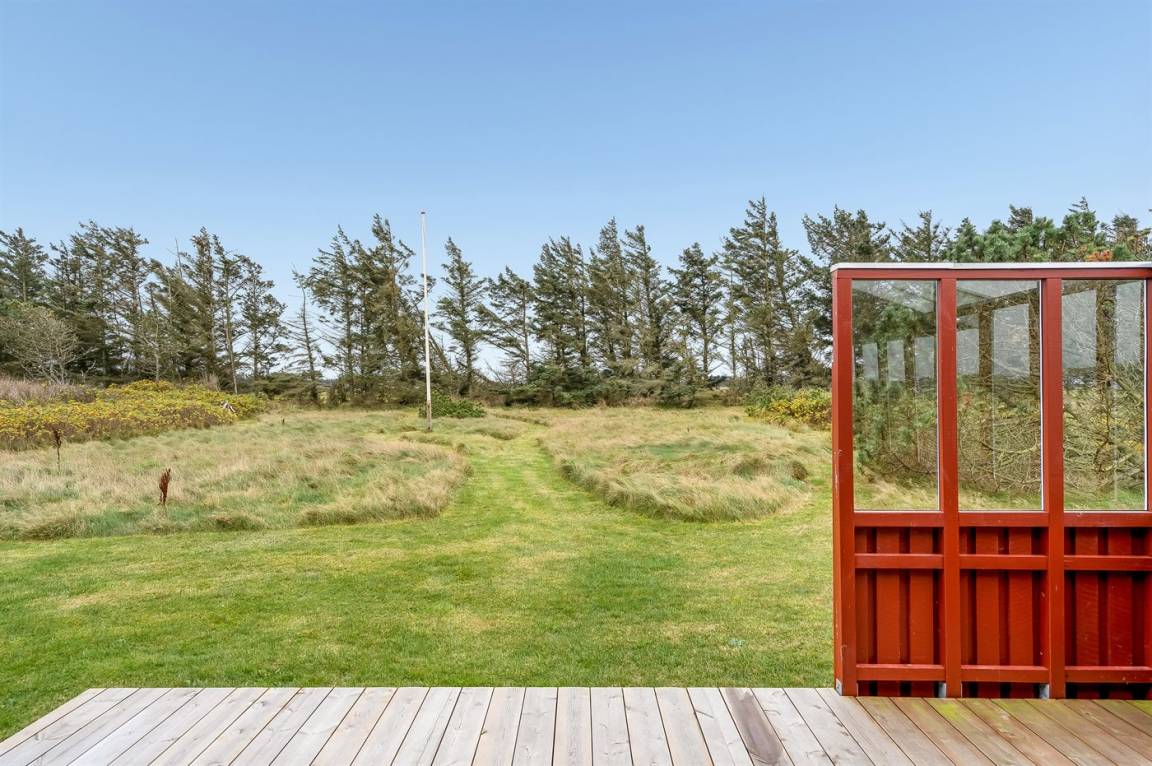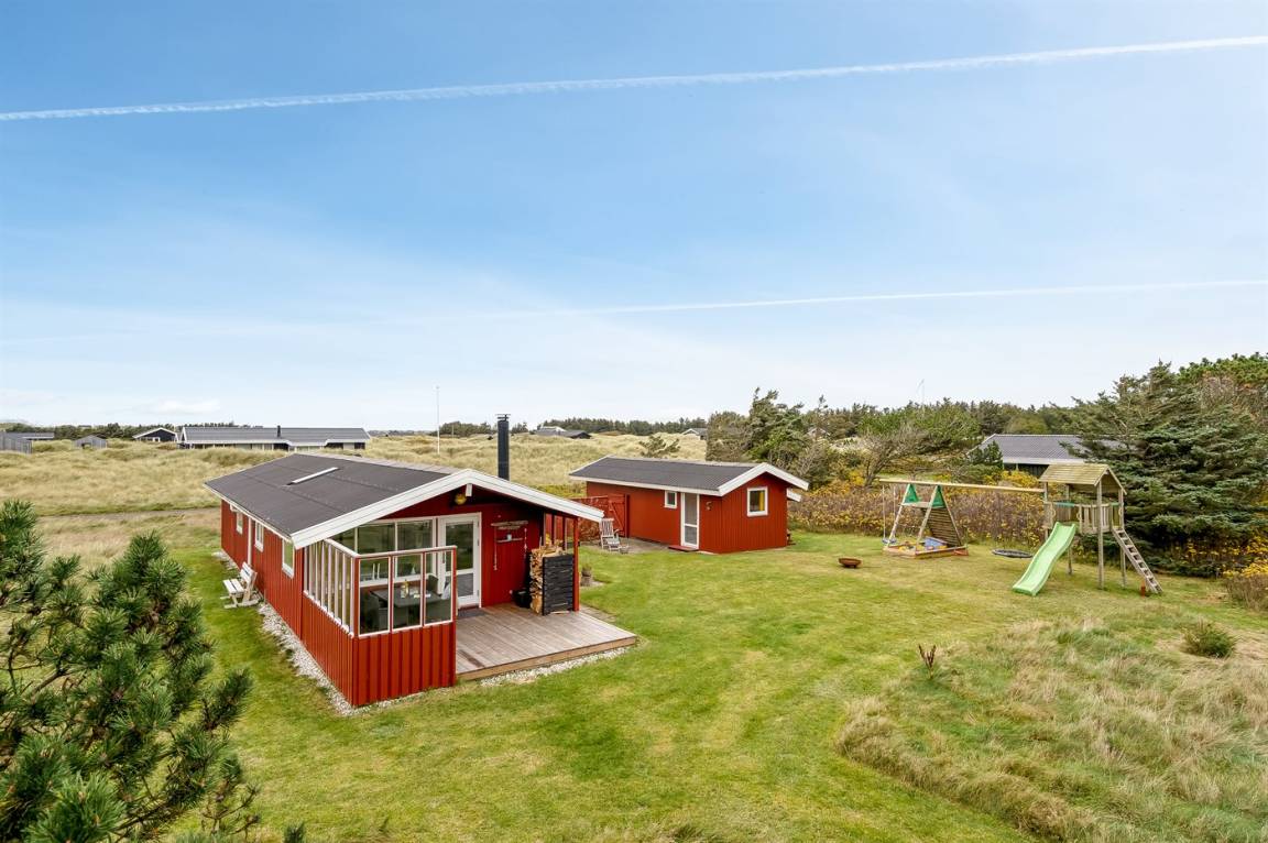 Charmantes Ferienhaus mit Platz für die ganze Familie. Das Haus liegt in der Nähe von Løkken und dem weißen Sandstrand. Das Ferienhaus integriert die Natur, und mit der überdachten Holzterrasse ist es möglich, die späten Sommerabende im Freien zu genießen.