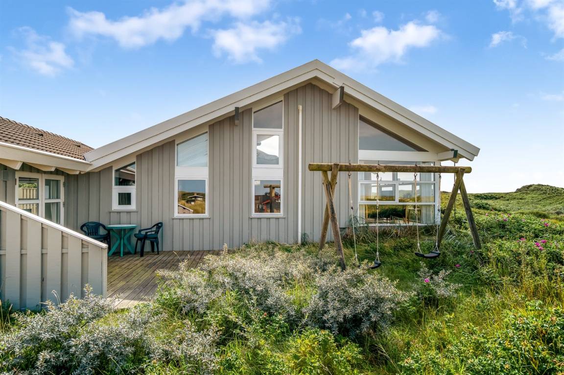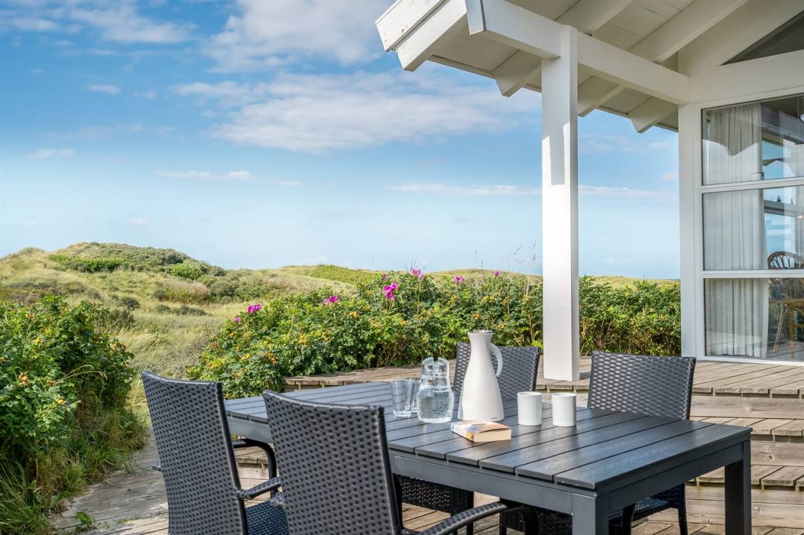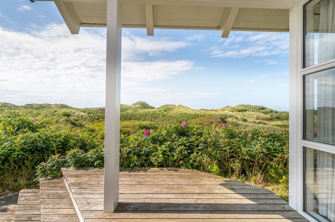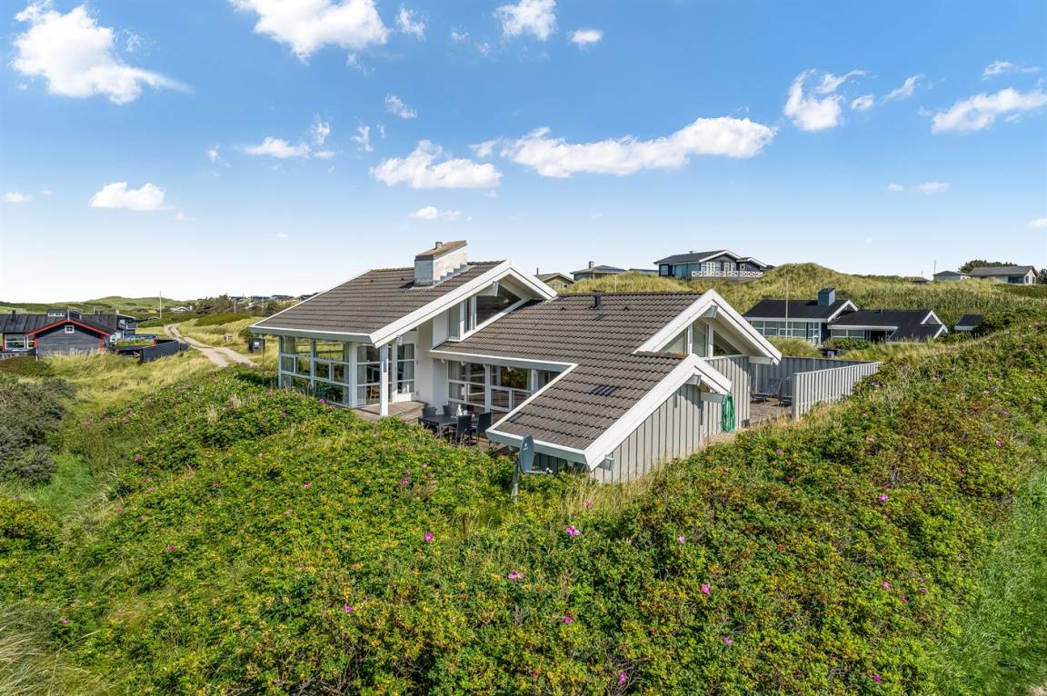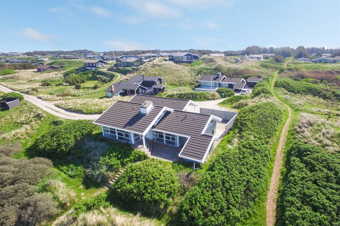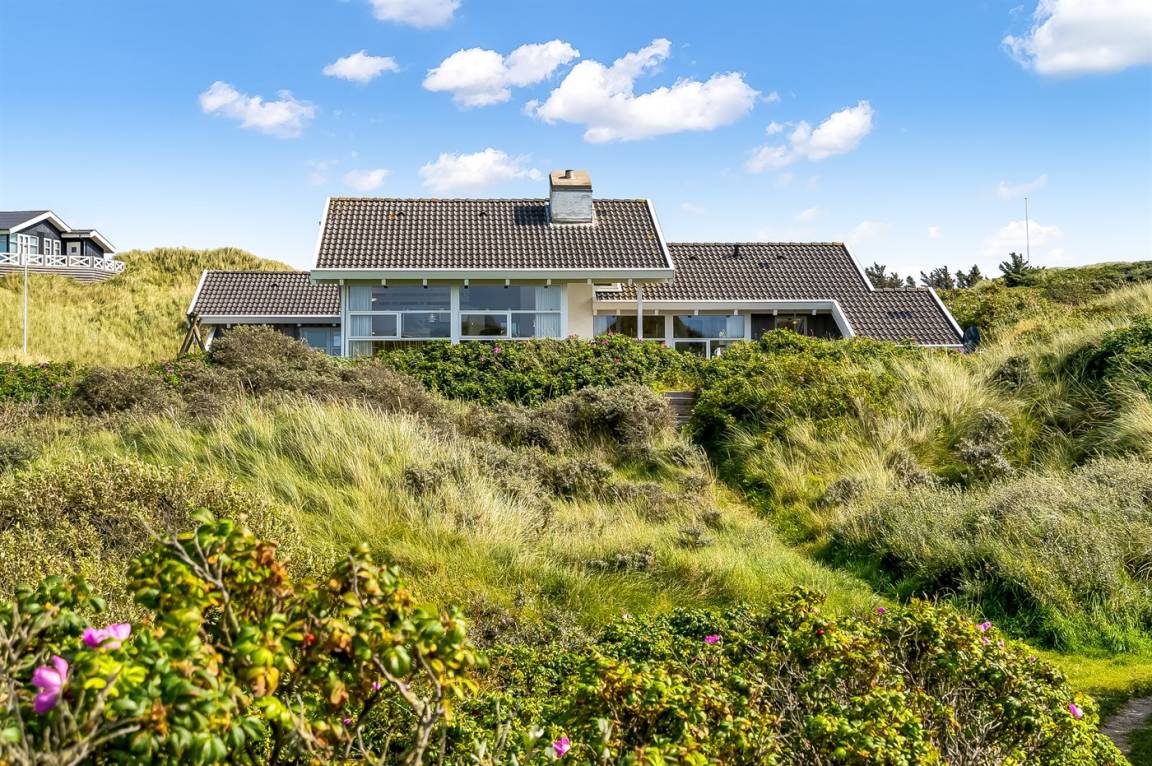 Dieses schöne Ferienhaus ist in versetzten Ebenen gebaut und im Wohnzimmer gibt es ein großes offenes Obergeschoss, wo die Kinder spielen können, während die Erwachsenen es sich im Wohnzimmer oder in der Küche gemütlich machen. Das Haus hat eine ganz einmalige Lage in der ersten Dünenreihe und am Ende einer Sackgasse, auf einem sehr großen und leicht hügeligen Dünengrundstück. Von hier aus führt ein Pfad direkt an den schönen Strand der Nordsee und sowohl vom Haus als auch vom Grundstück aus hat man einen herrlichen Blick auf die Nordsee und die faszinierende Dünenlandschaft. Vom höchsten Punkt der Dünen aus gibt es außerdem einen 180-Grad-Blick über die Bucht "Jammerbugten".