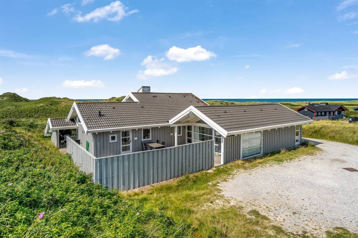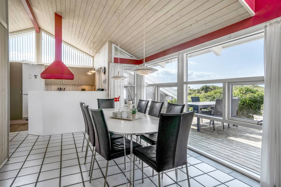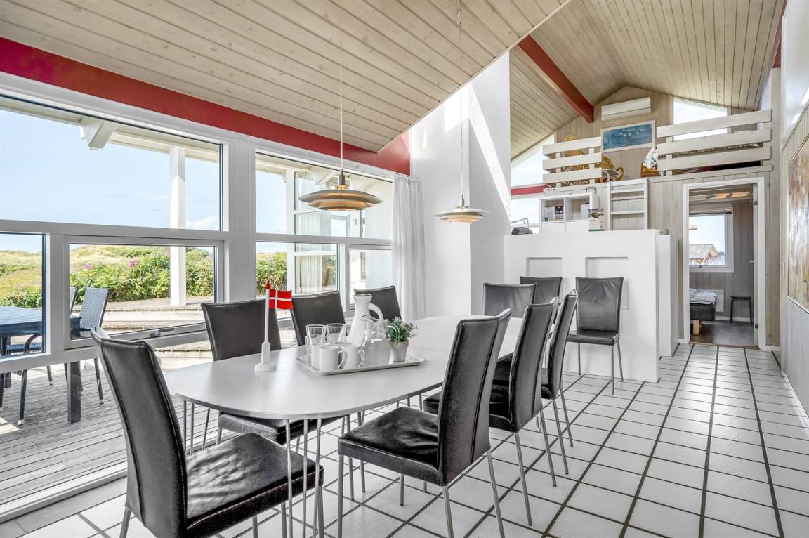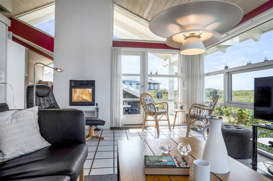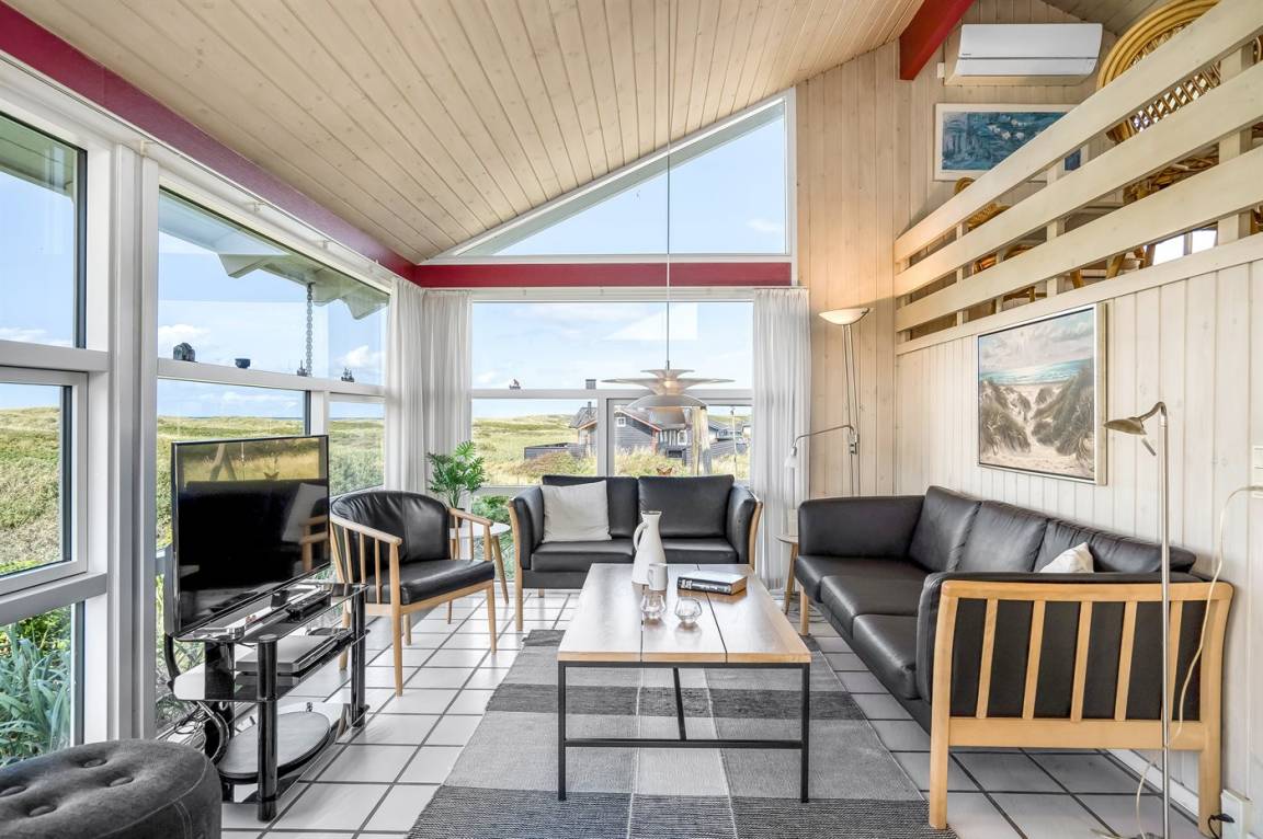 Dieses schöne Ferienhaus ist in versetzten Ebenen gebaut und im Wohnzimmer gibt es ein großes offenes Obergeschoss, wo die Kinder spielen können, während die Erwachsenen es sich im Wohnzimmer oder in der Küche gemütlich machen. Das Haus hat eine ganz einmalige Lage in der ersten Dünenreihe und am Ende einer Sackgasse, auf einem sehr großen und leicht hügeligen Dünengrundstück. Von hier aus führt ein Pfad direkt an den schönen Strand der Nordsee und sowohl vom Haus als auch vom Grundstück aus hat man einen herrlichen Blick auf die Nordsee und die faszinierende Dünenlandschaft. Vom höchsten Punkt der Dünen aus gibt es außerdem einen 180-Grad-Blick über die Bucht "Jammerbugten".