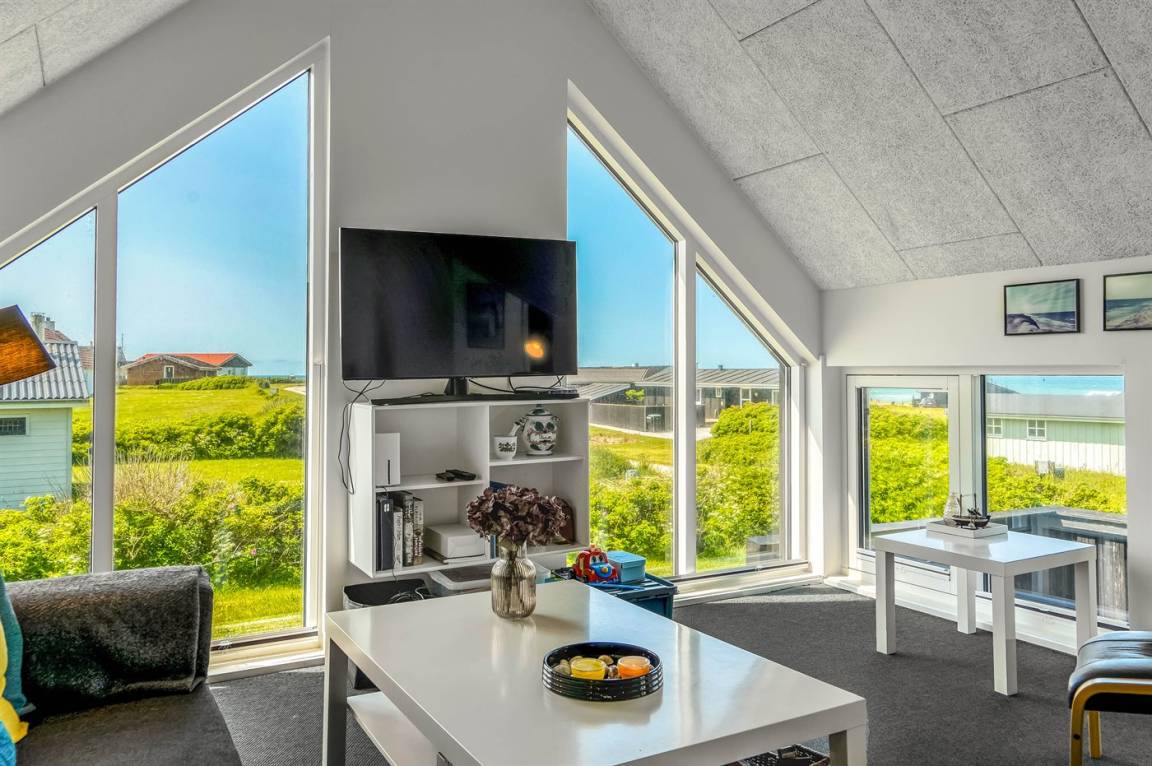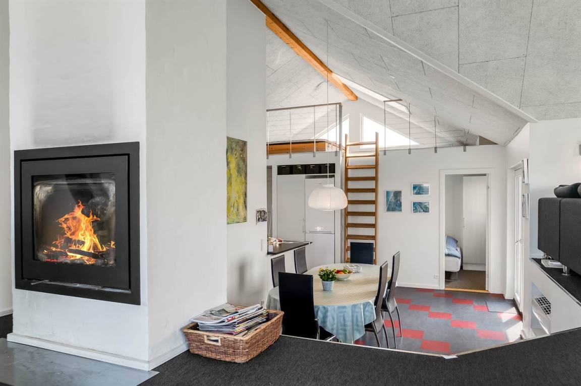 Ferienhaus im ruhigen Nr. Lyngby. Das Haus ist architektonisch gestaltet und das Wohnzimmer ist erhöht, um die Aussicht auf die Umgebung zu optimieren.