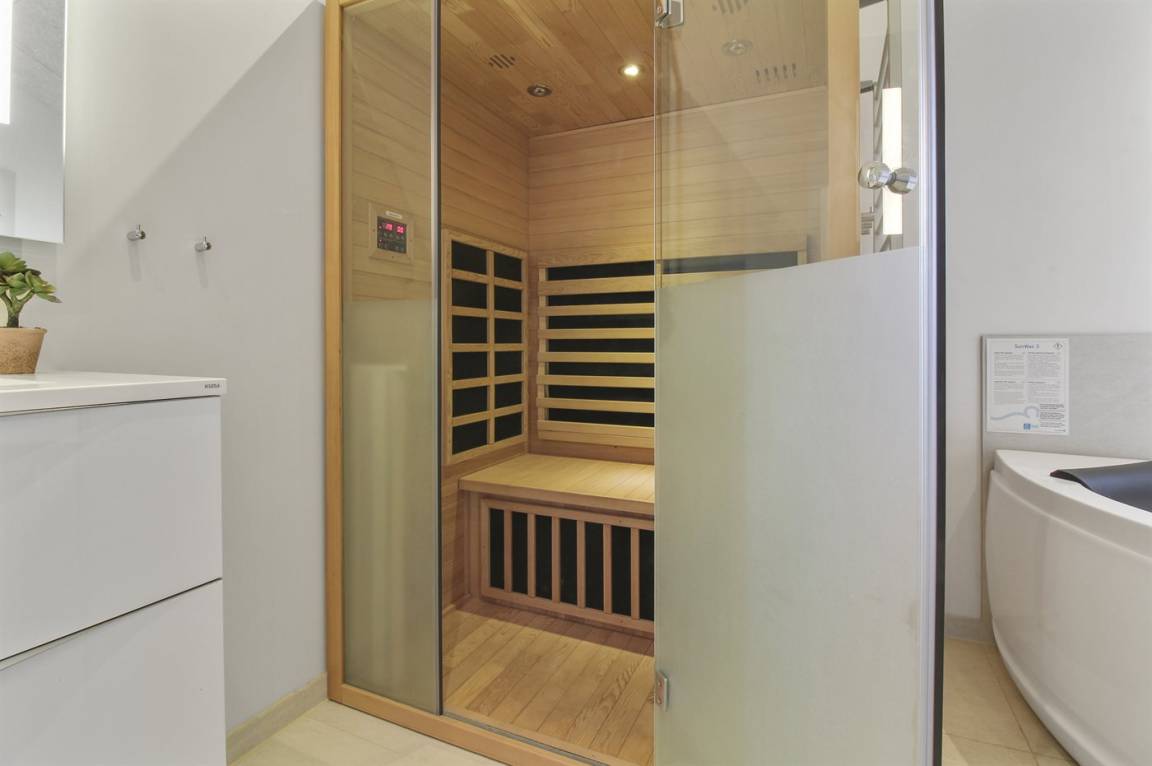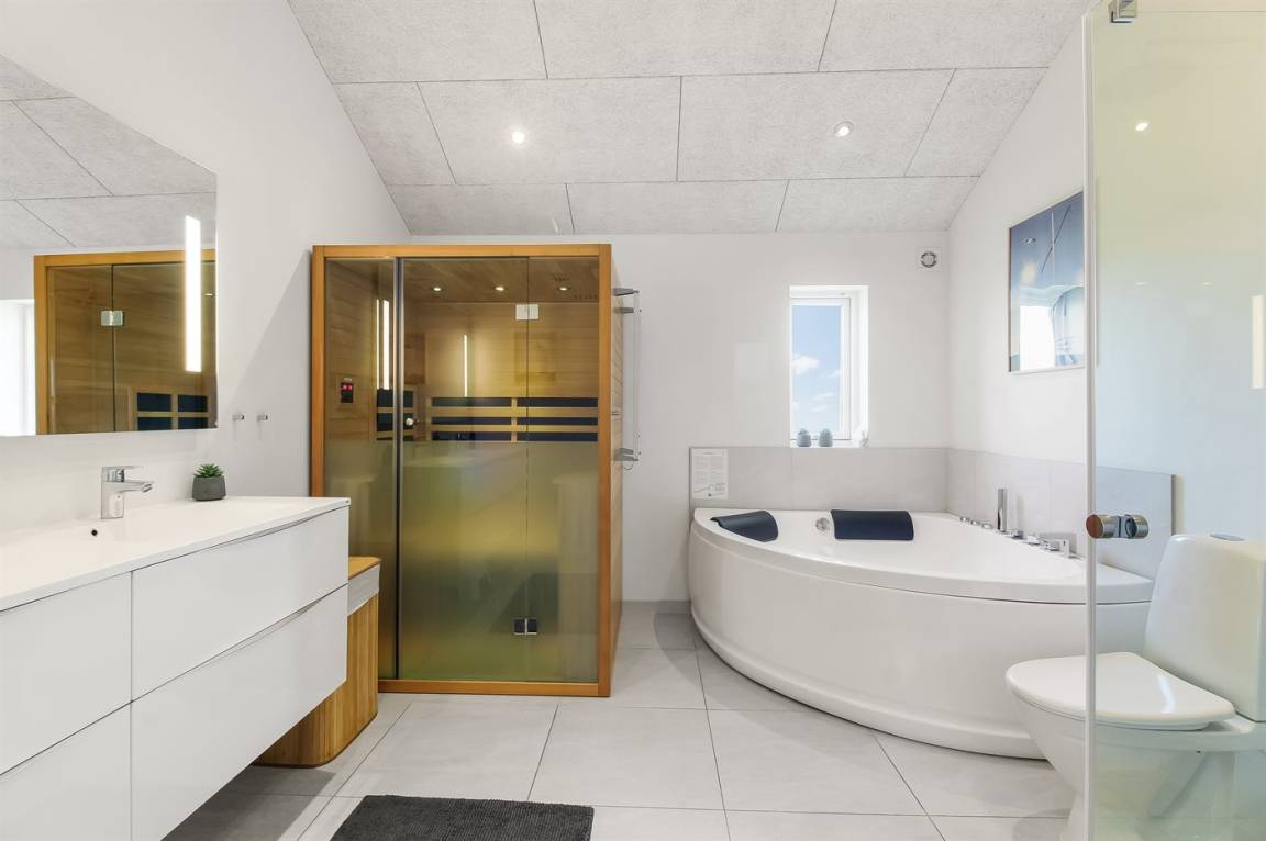 Es gibt 2 Badezimmer mit Dusche und 3 Toiletten, darunter 1 Gäste-WC. Beide Badezimmer haben Fußbodenheizung. In einem der Badezimmer kannst du dich in einem Indoor-Whirlpool für 2 Personen entspannen und die Sauna mit Bluetooth-Lautsprecher genießen.