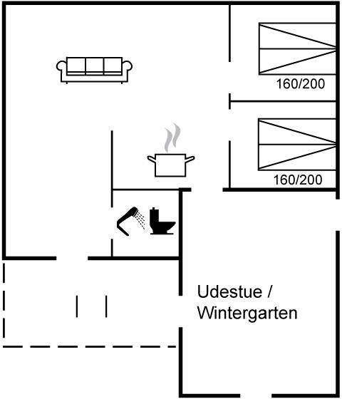SchlafverhältnisseDie Schlafplätze verteilen sich auf 2 Schlafräume. 4 Schlafplätze in Doppelbetten. 2 Schlafplätze auf Matratzen. 2 von diesen Schlafplätzen befinden sich im offenen Obergeschoss und sind daher am besten für größere Kinder geignet.