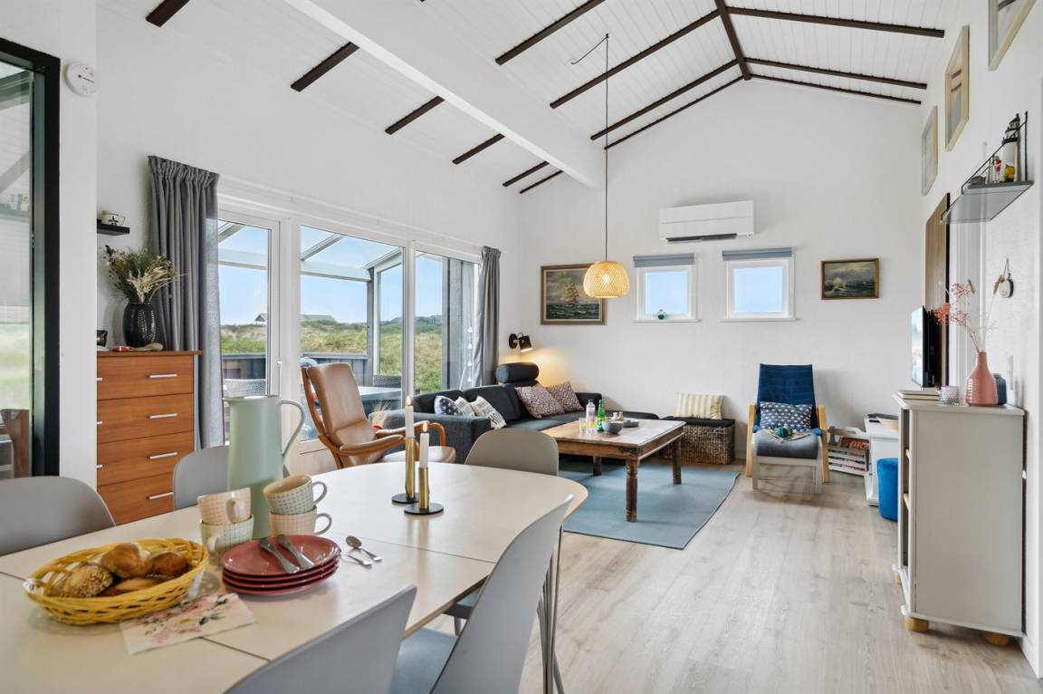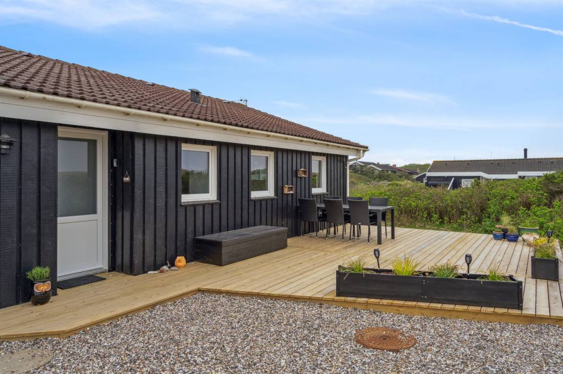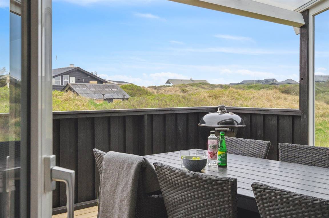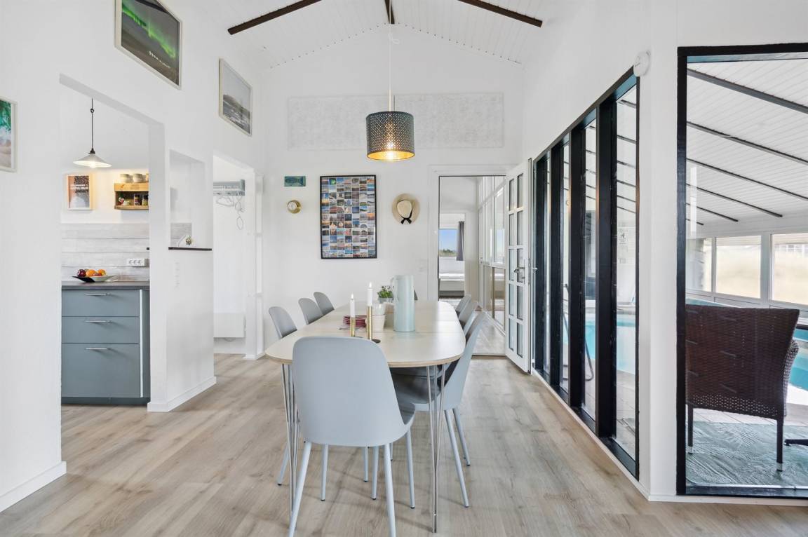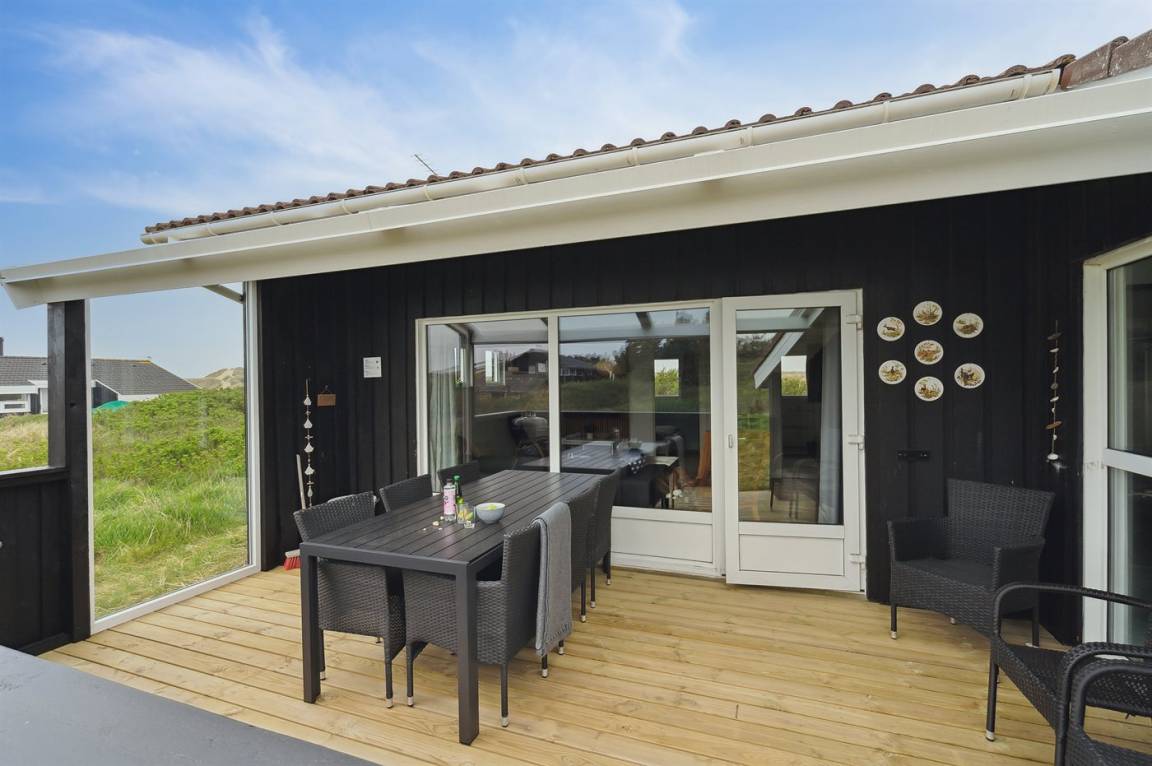 Ein schönes Poolhaus im beliebten Feriengebiet Grønhøj. Genieße ein Glas Wein oder eine Tasse Kaffee auf der überdachten Terrasse - bei jedem Wetter. Nach einem langen Spaziergang am Meer kannst du es dir anschließend mit einem guten Buch gemütlich machen oder die Familie bei einem Spiel Karten herausfordern.