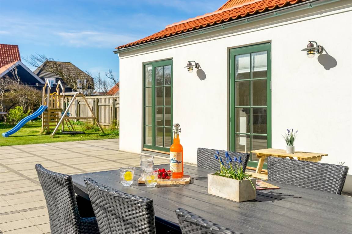 DraußenDie Ferienunterkunft liegt auf einem 510 m² großen Naturgrundstück. Die Entfernung zum Meer beträgt 400 m. Die nächste Einkaufsmöglichkeit liegt 400 m entfernt. Es steht ein offenes Terrassenareal zur Verfügung. Trampolin. Spielturm. Rutsche. Außendusche. Es steht ein Grill zur Verfügung. Parkplatz auf dem Grundstück.