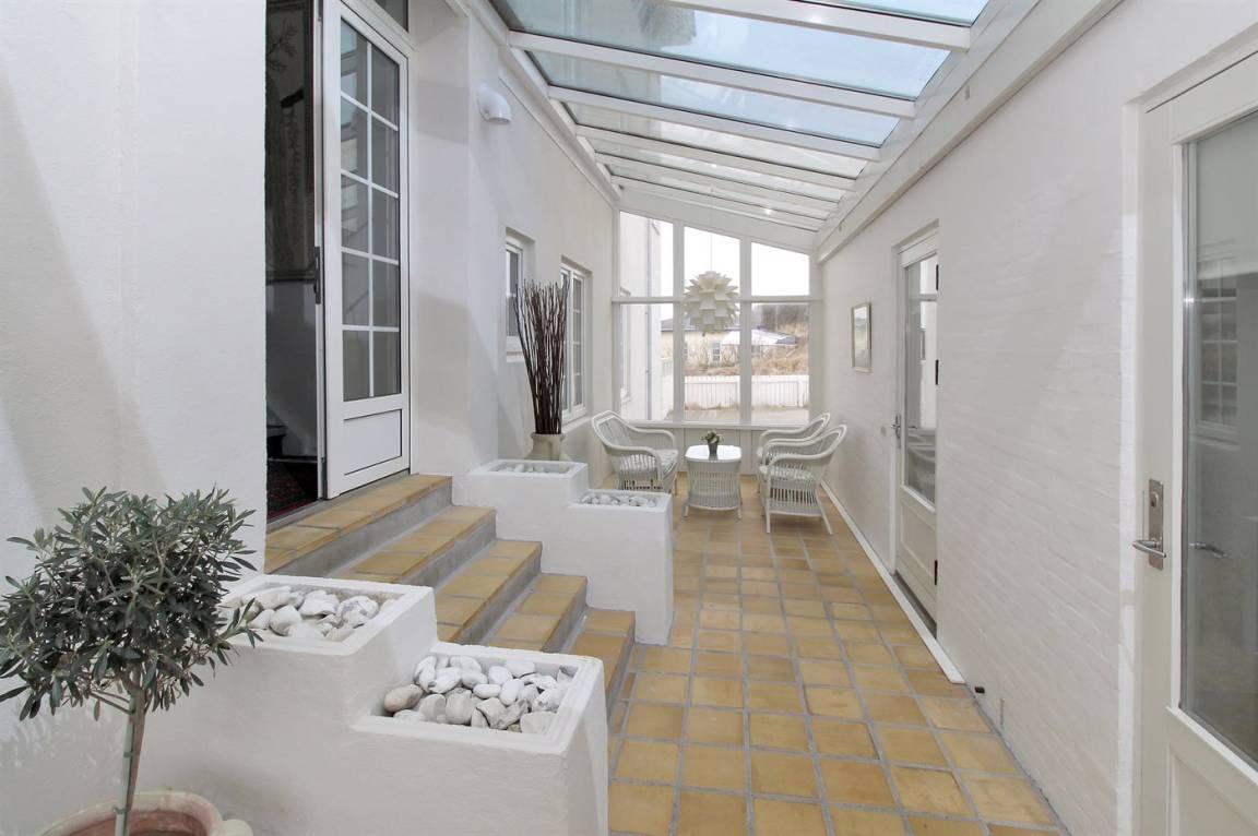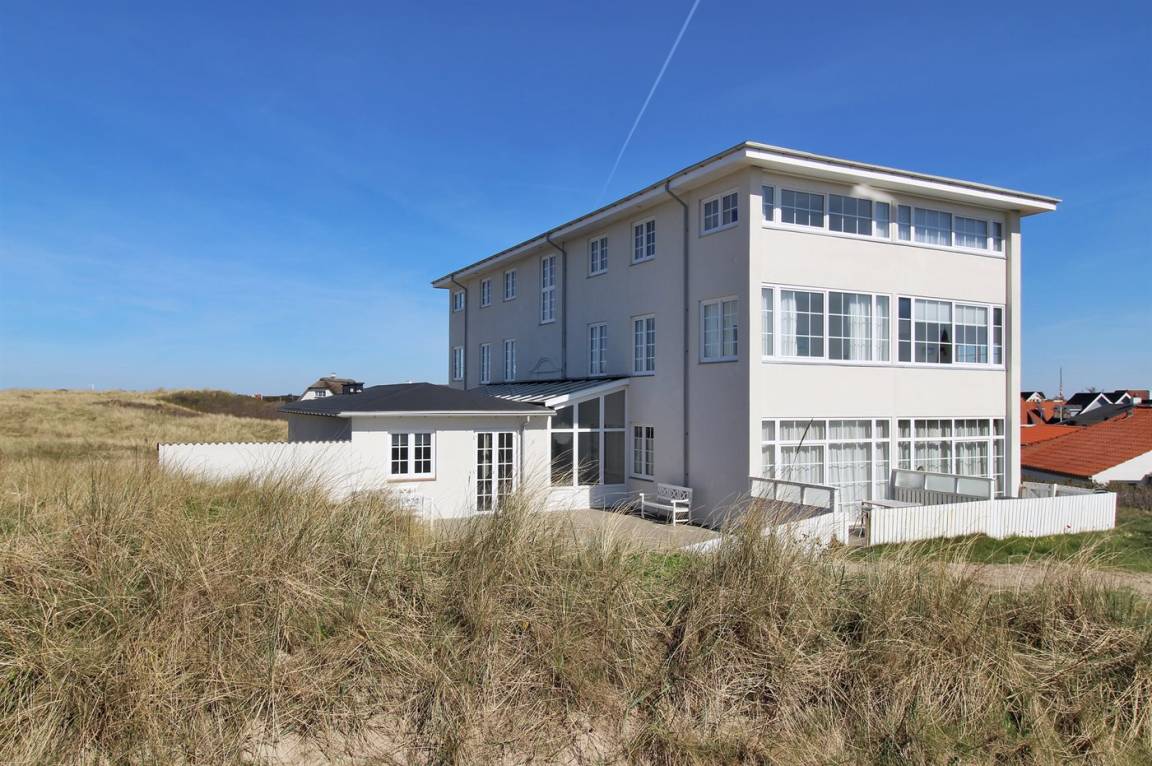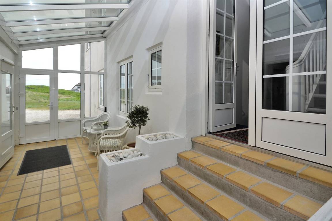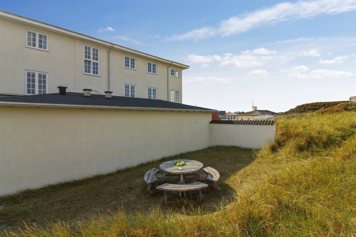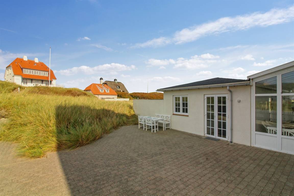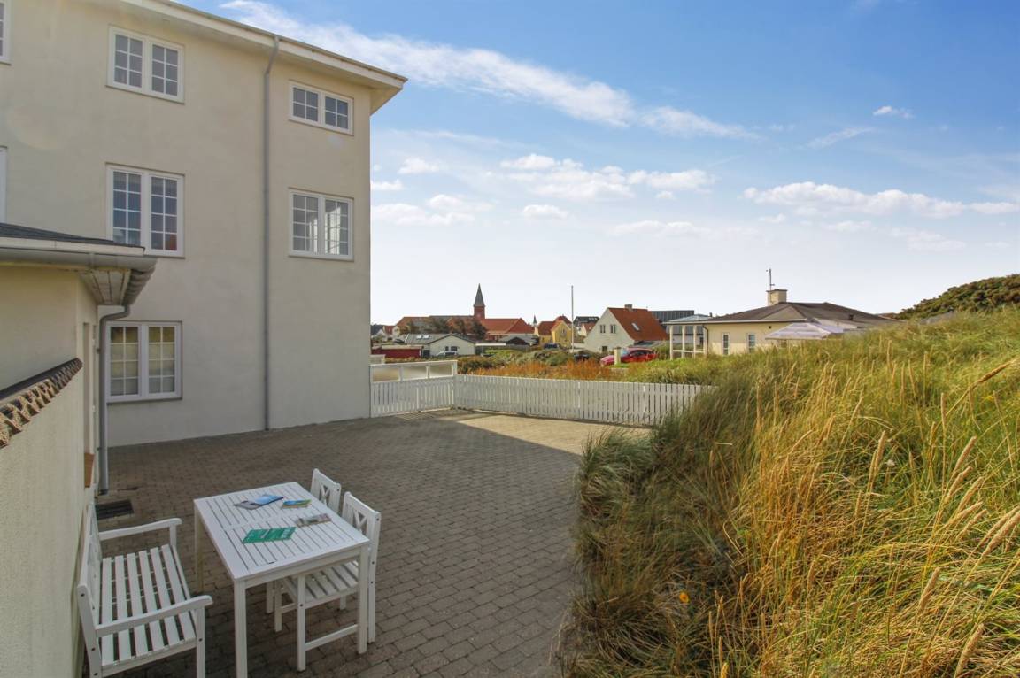 Schöne Ferienwohnung zentral in Løkken gelegen. Ausgang vom Haus zu der großen neueren Terrasse, die in den Dünen liegt.