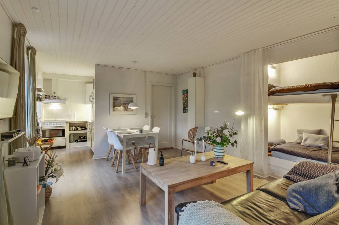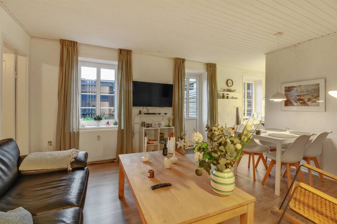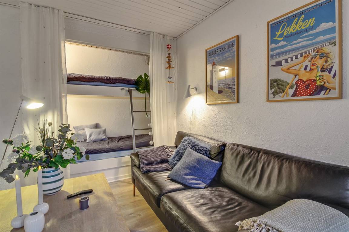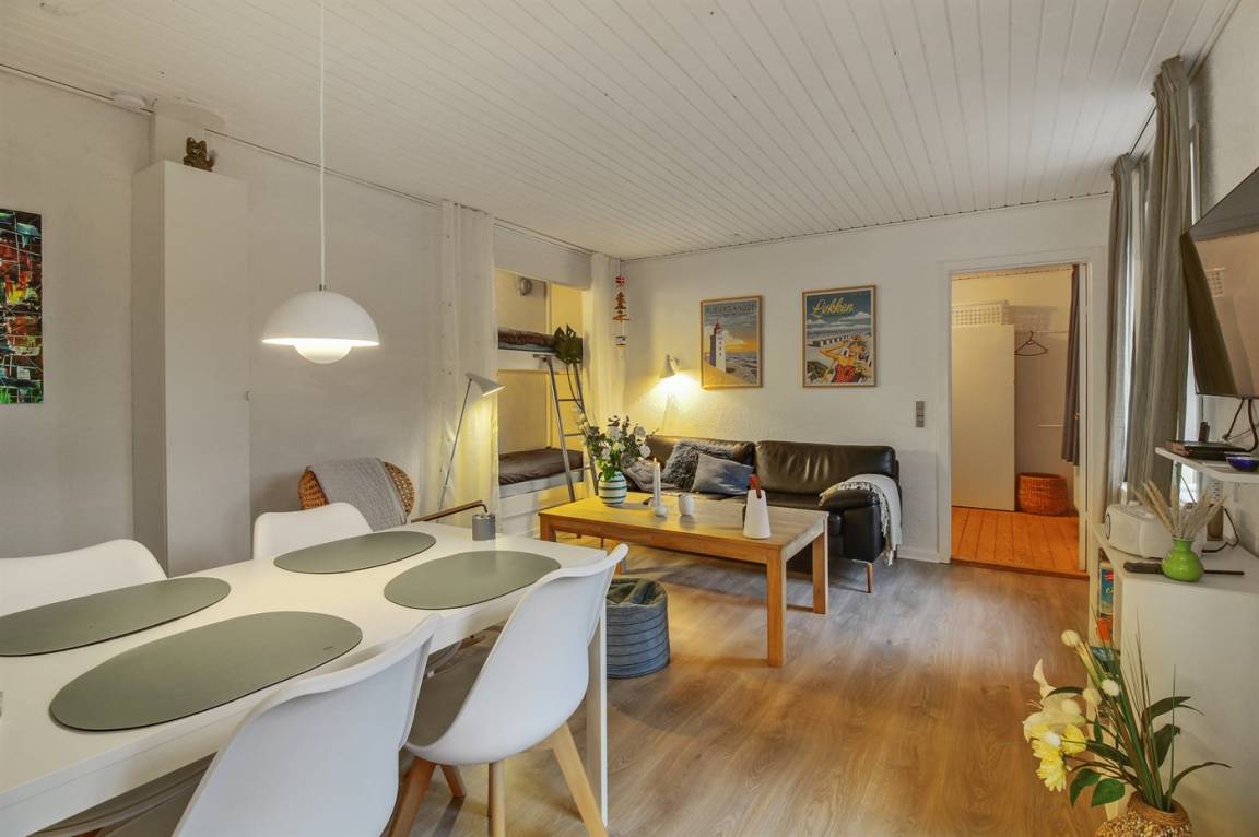 Eine Ferienwohnung mit zentraler Lage im Ferienort Løkken – nicht weit vom schönen Badestrand entfernt. Übrigens: 2 Schlafplätze im Alkoven (Etagenbett) im Wohnzimmer.