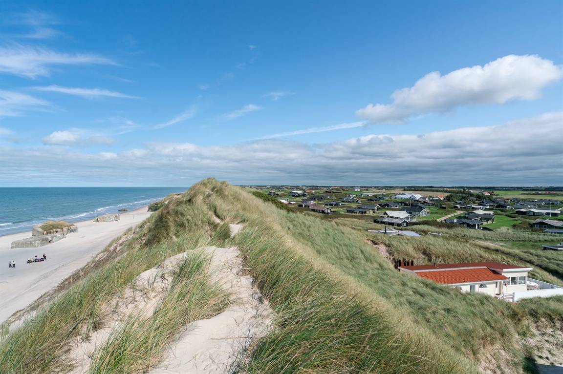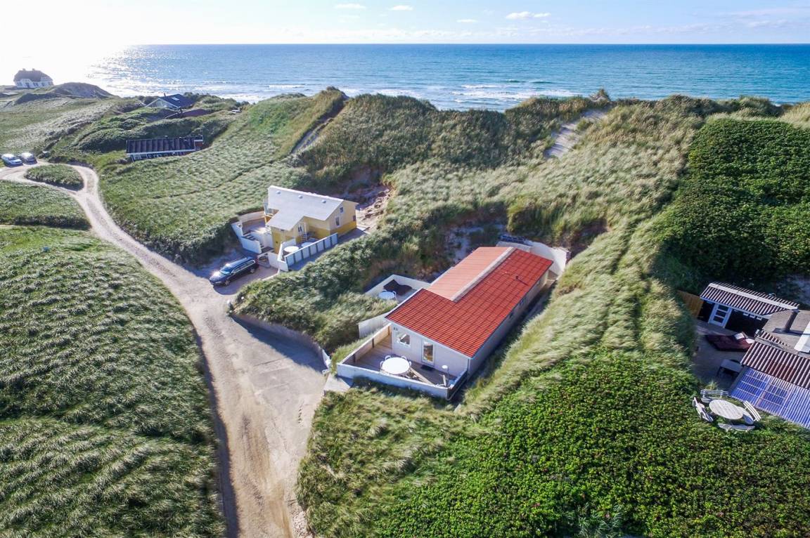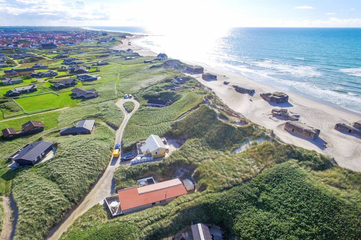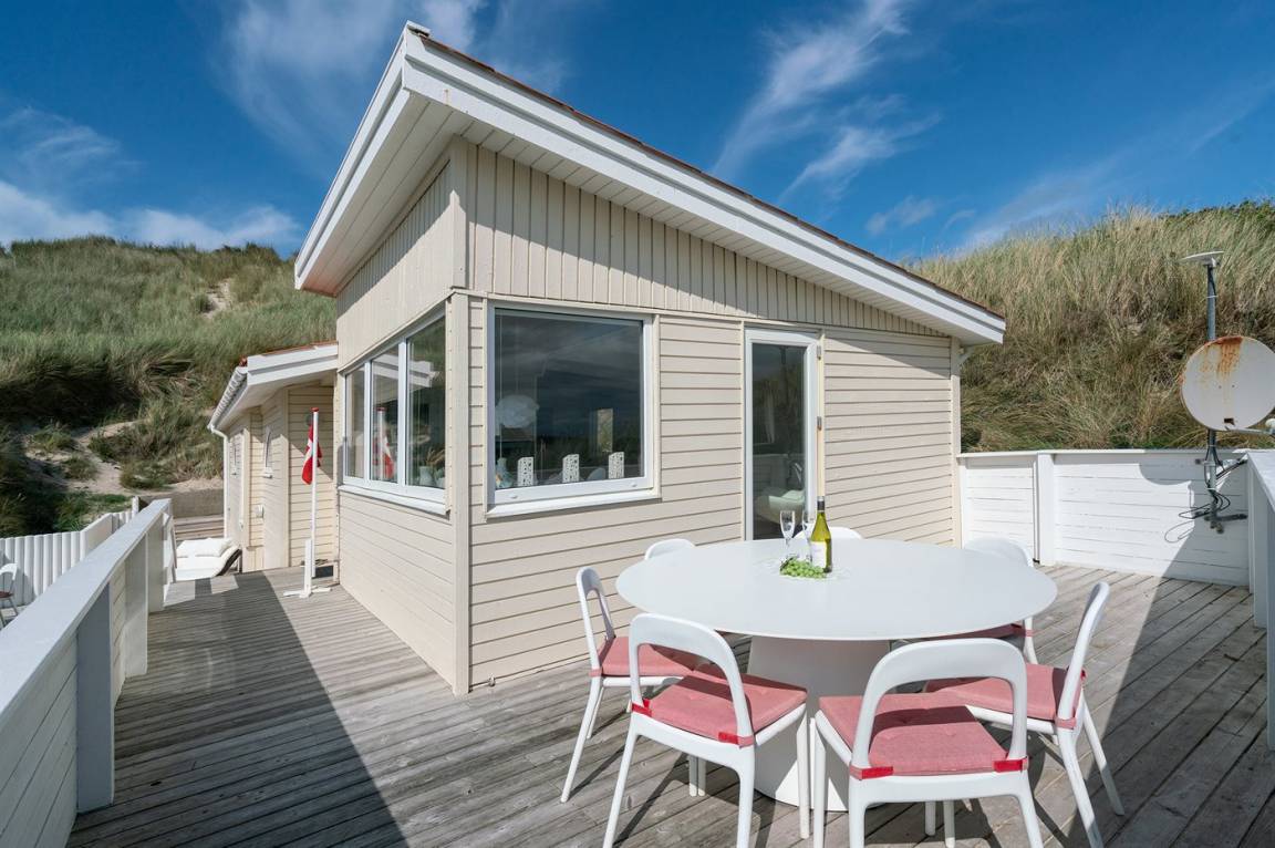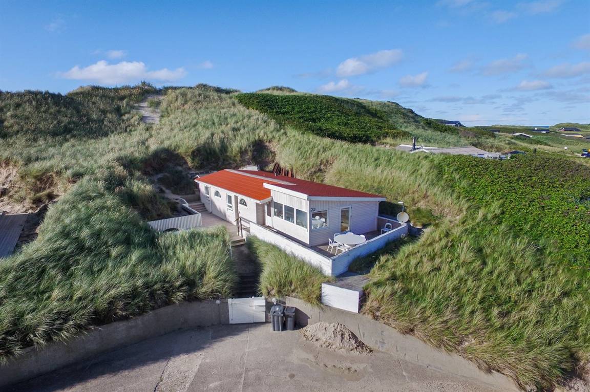 Fahren Sie durch die kleinen Straßen bis zu den hohen Dünen, wo sich dieses wunderschöne Ferienhaus oberhalb der Straße in der extremen Klippe zum Strand und zur Nordsee befindet. Das Haus ist in der Düne gut geschützt vom Westwind, und mit seiner hohen Lage gibt es einen schönen Blick auf das Ferienhaus vom Wohnzimmer. Von der Spitze des Hügels gibt es Meerblick. Zum Haus gehört eine geschlossene Terrasse nach Osten und Süden
