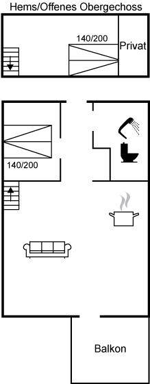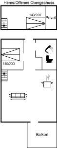 SchlafverhältnisseEs gibt einen Schlafraum. 4 Schlafplätze in Doppelbetten. 2 von diesen Schlafplätzen befinden sich im offenen Obergeschoss.