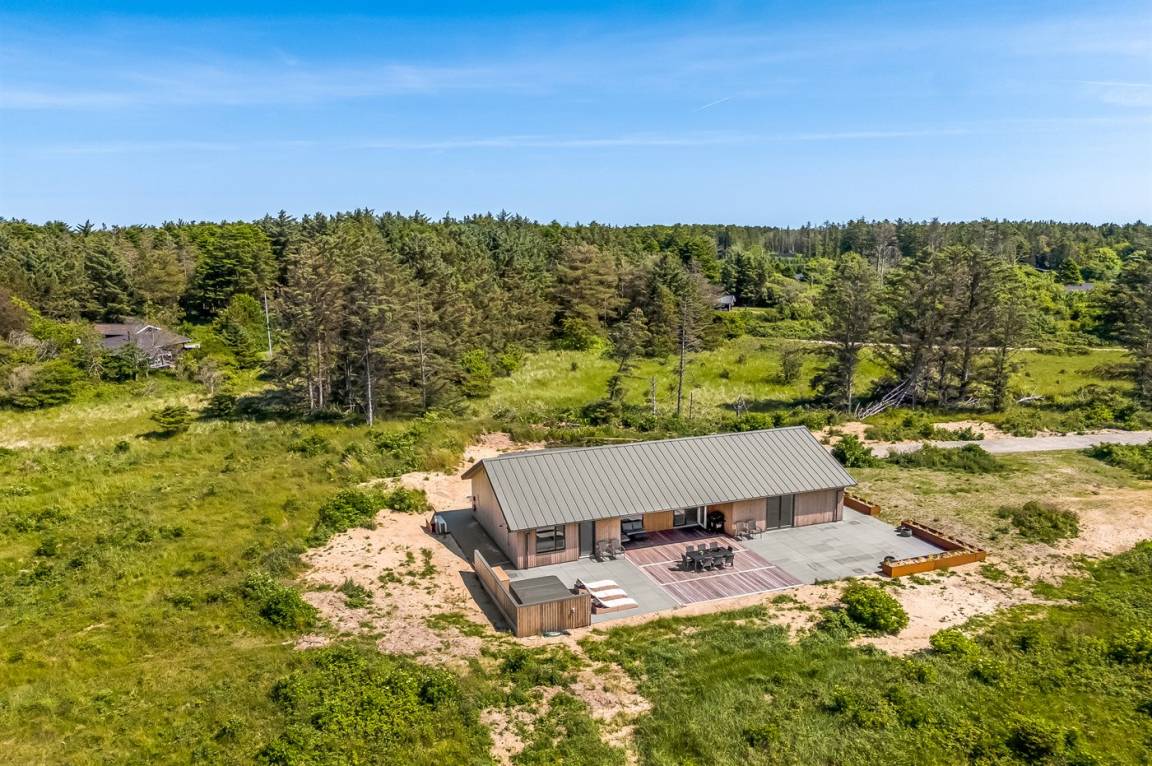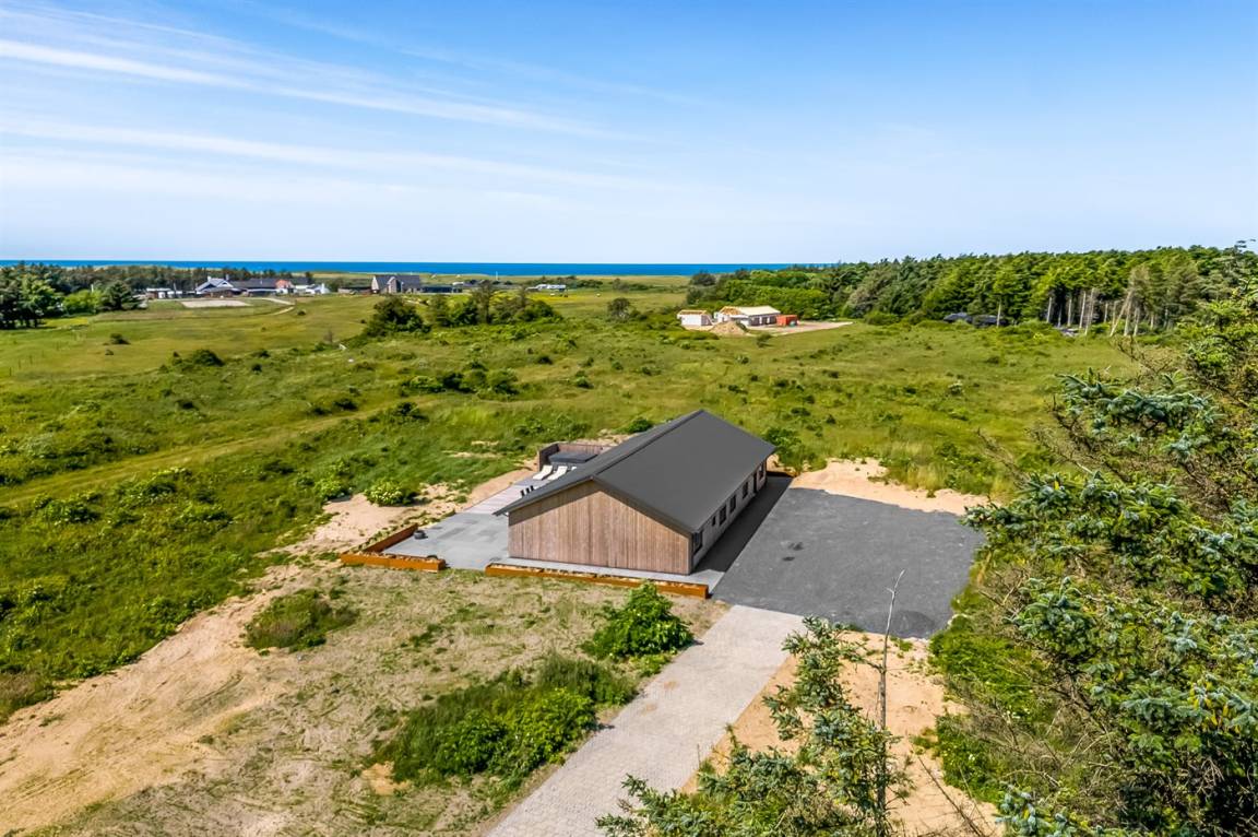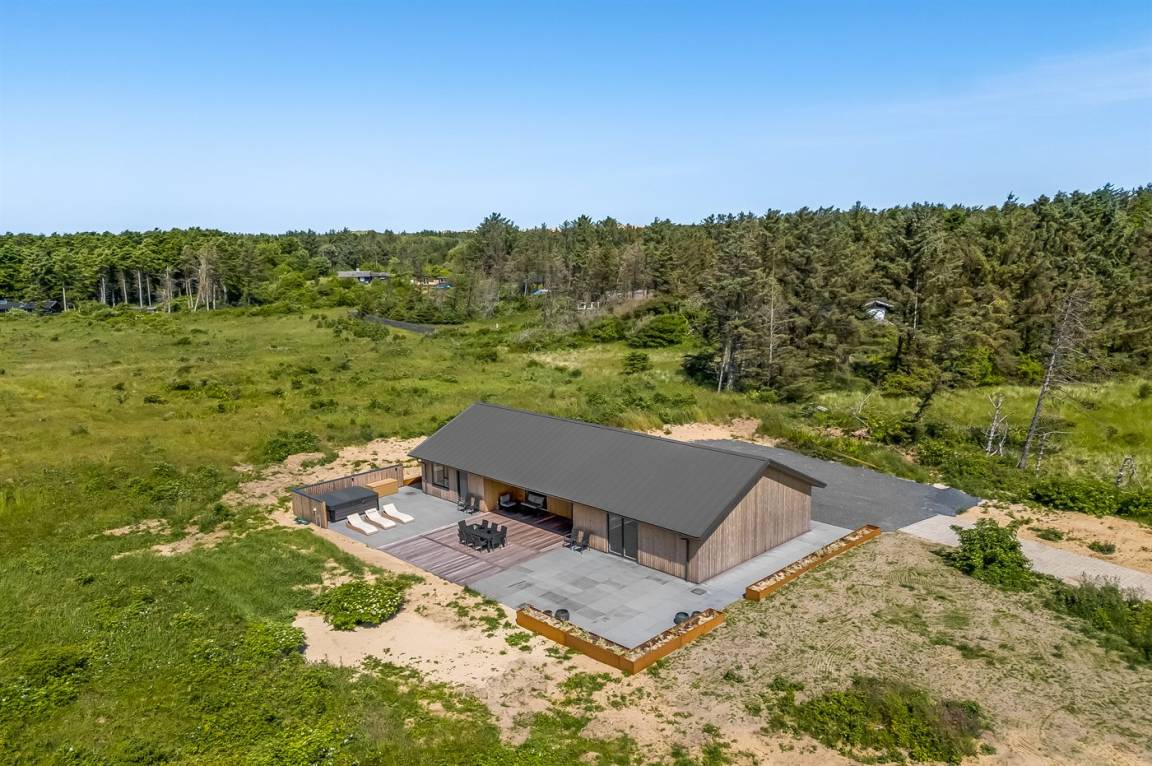 Dieses schöne, neu erbaute Ferienhaus liegt auf einem sehr großen Naturgrundstück – nahe am Strand.