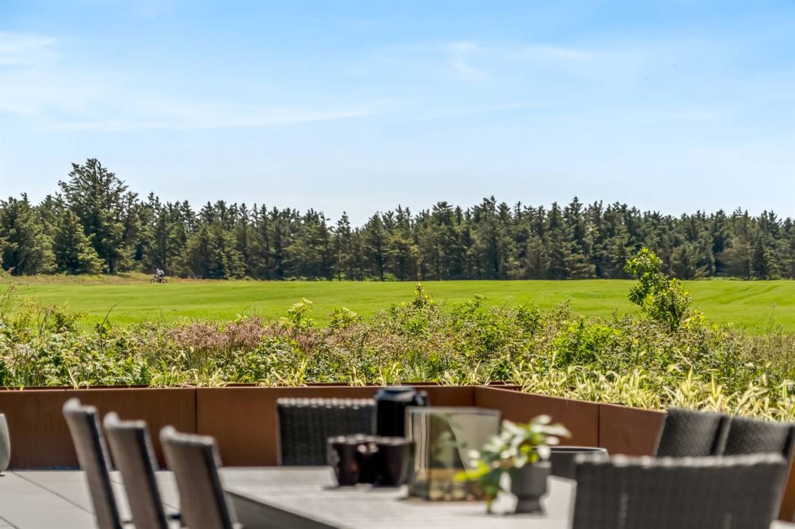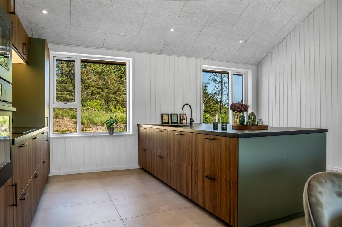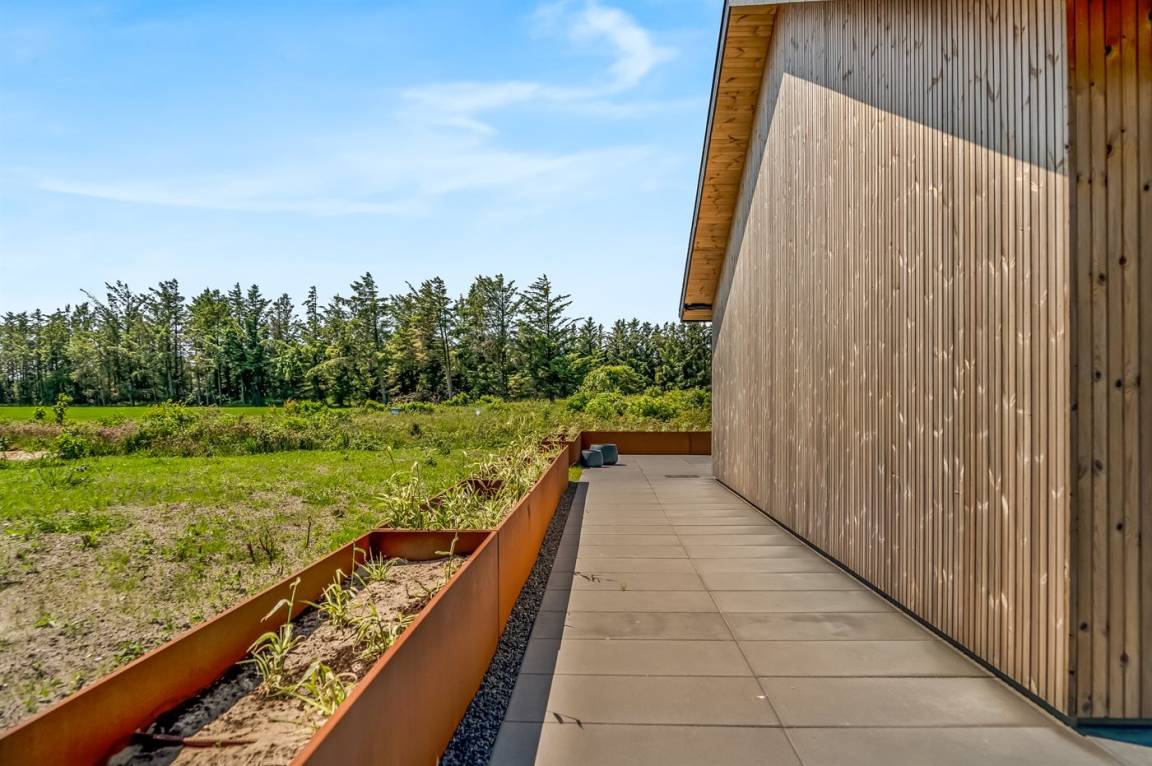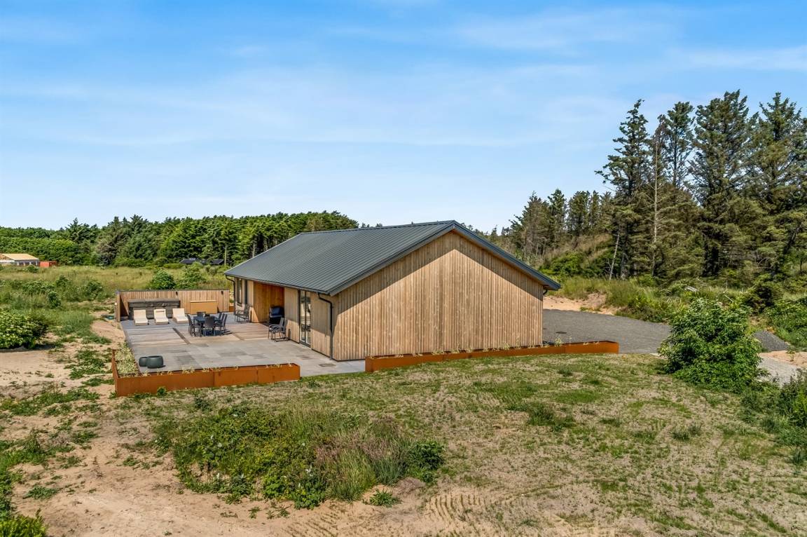 Dieses schöne, neu erbaute Ferienhaus liegt auf einem sehr großen Naturgrundstück – nahe am Strand.
