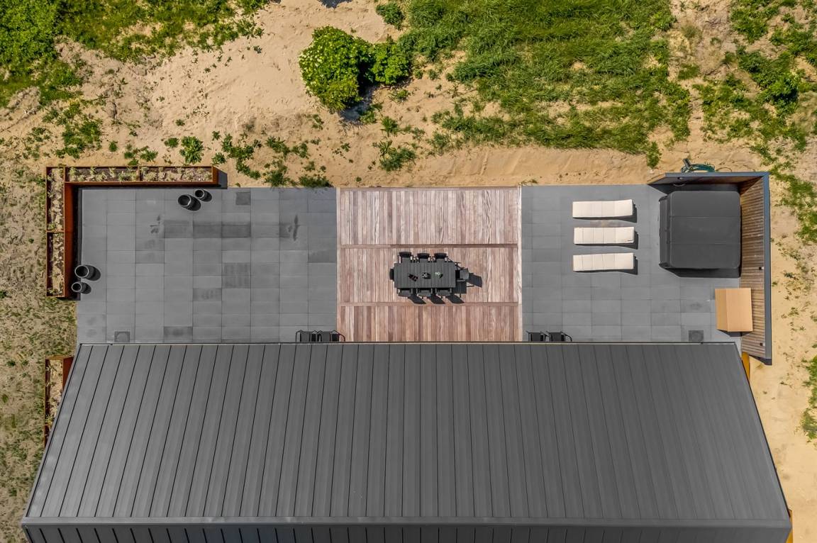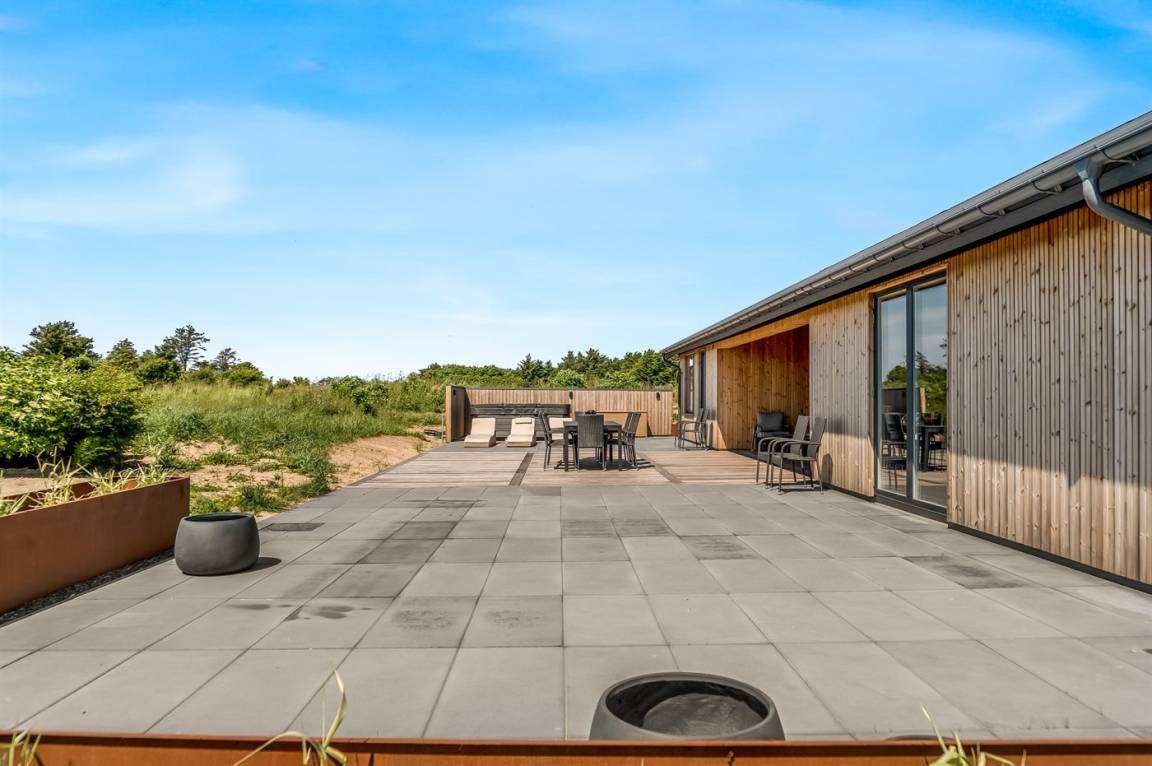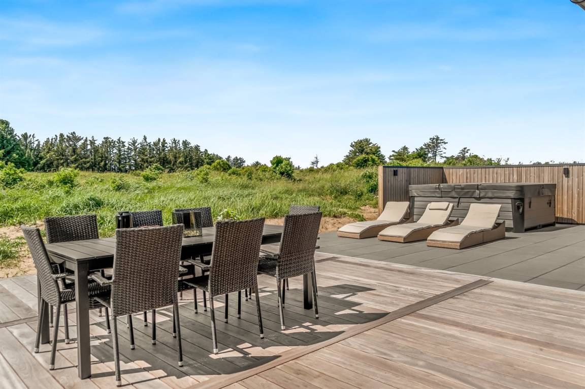 Zum Haus gehören sowohl offene als auch überdachte Terrassen sowie ein großer Außen-Whirlpool, der zu Wellness und Entspannung im Freien einlädt.