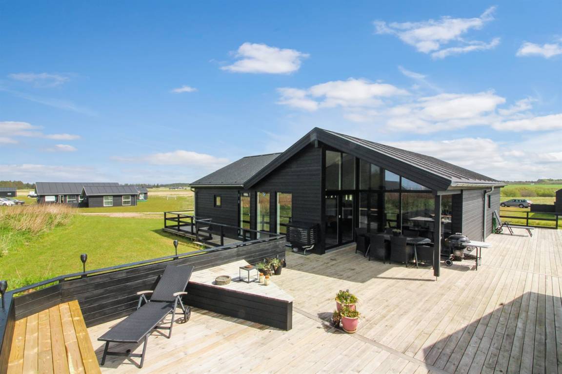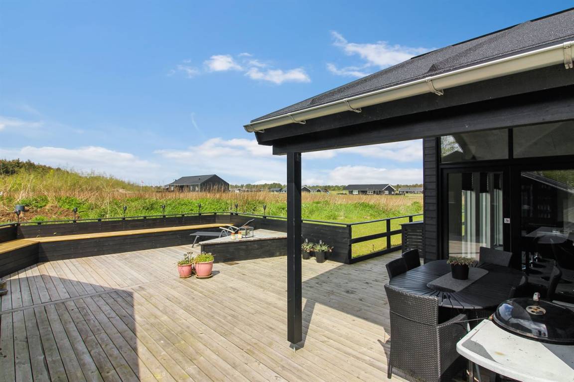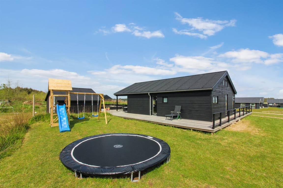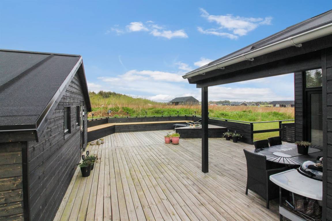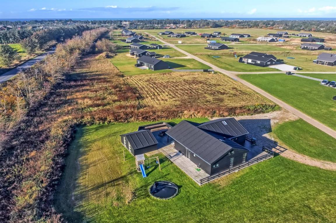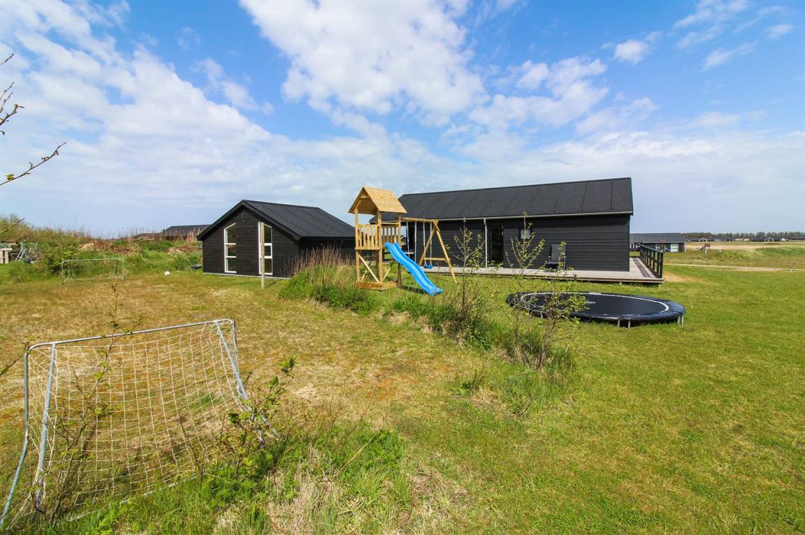 Ganz neues, reizvolles und geräumiges Ferienhaus, Baujahr 2017, das auf einem großen ungeschützten Grundstück in einer neu gegründeten Ferienhaussiedlung liegt, wo noch neue Häuser gebaut werden. Die Siedlung hat kurzen Abstand zum Meer und zu einem schönen Badestrand. Das Ferienhaus verfügt über eine schöne windgeschützte Terrasse und auf dem Grundstück befindet sich eine Sandbahn, die für verschiedene Outdoor-Aktivitäten benutzt werden kann.