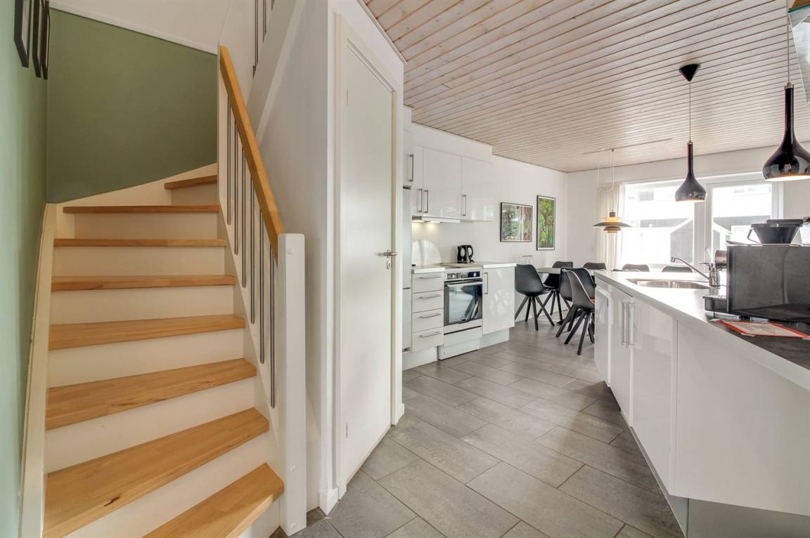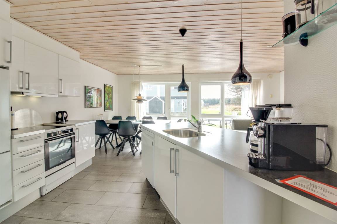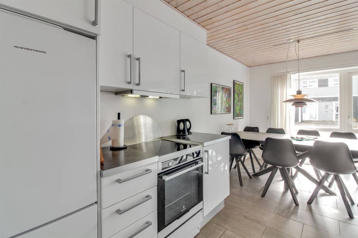 „The vacation at the holiday home: Indenfor absolut i fornuftig stand rengøringsmæsssigt, udstyrsmæssigt måske der bør ses på kopper og glas m. m. The local office: God service The holiday home itself: Ja men følgende bemærkninger. Udenfor Da det er hus, der slutter rækkehusene, står der enkelte grantræer, der smider nåle, især ved storm/blæsevejr. Det medførte desværre at bilen måtte i vaskeghallen ved Brugsen i Løkken og terassen var fyldt med grannåle allerede ved ankomsten til huset. Burde være klar til forbedringer.“