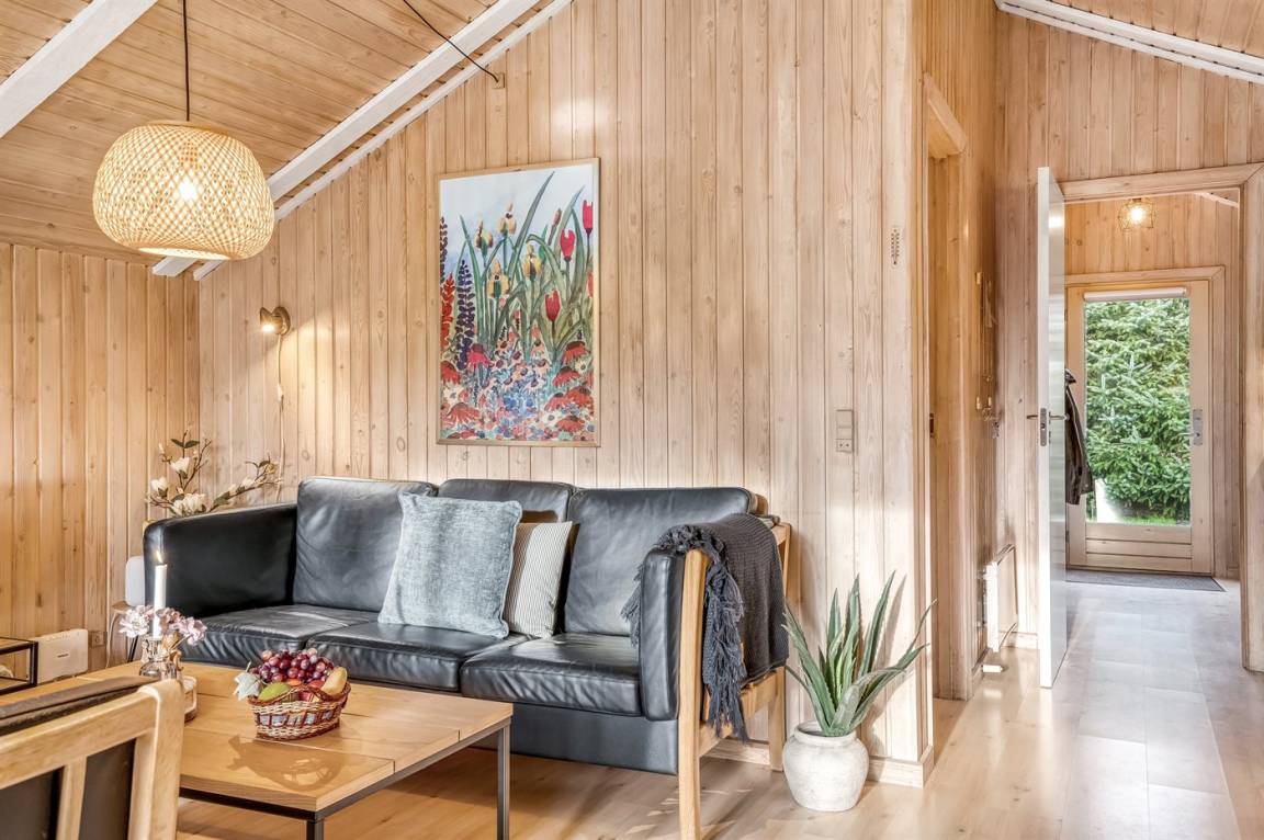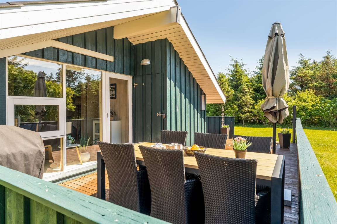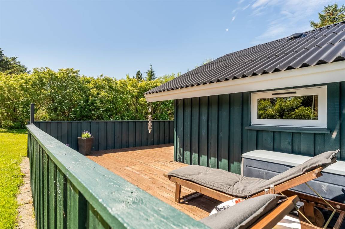 Gemütliches Ferienhaus das auf einem geschlossenen Grundstück in einer attraktiven Ferienhaussiedlung nahe an Strand und Meer liegt.