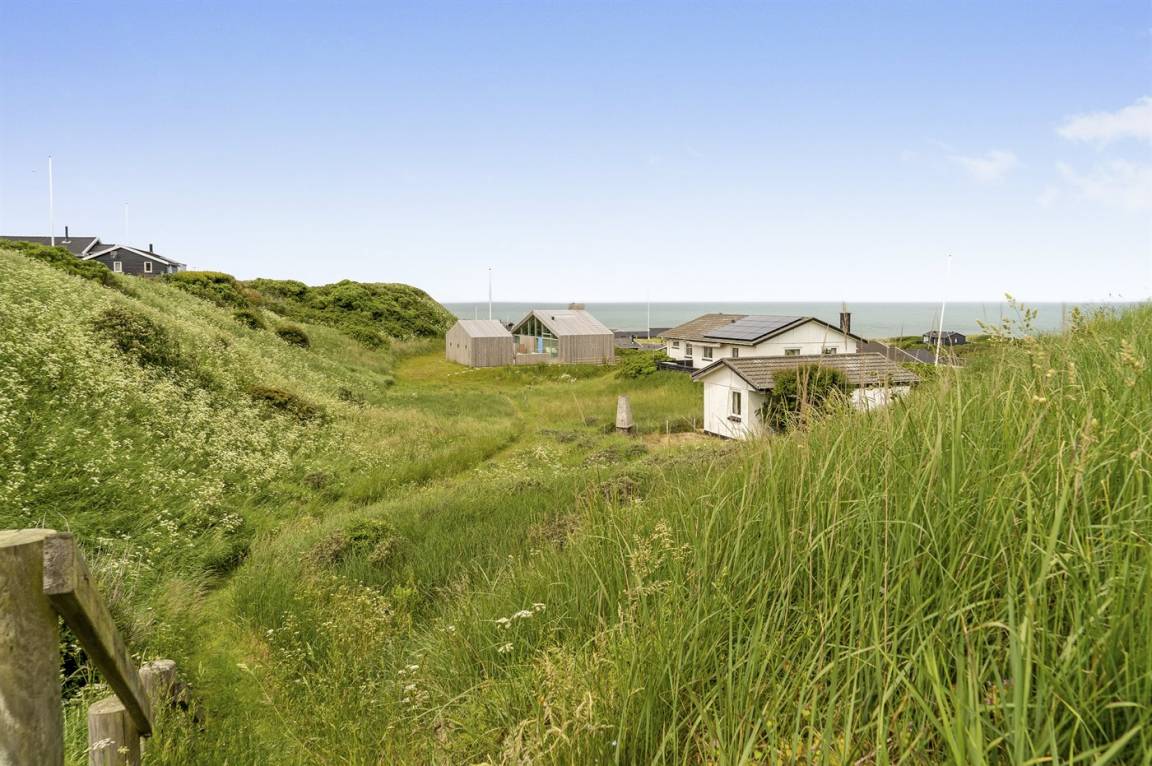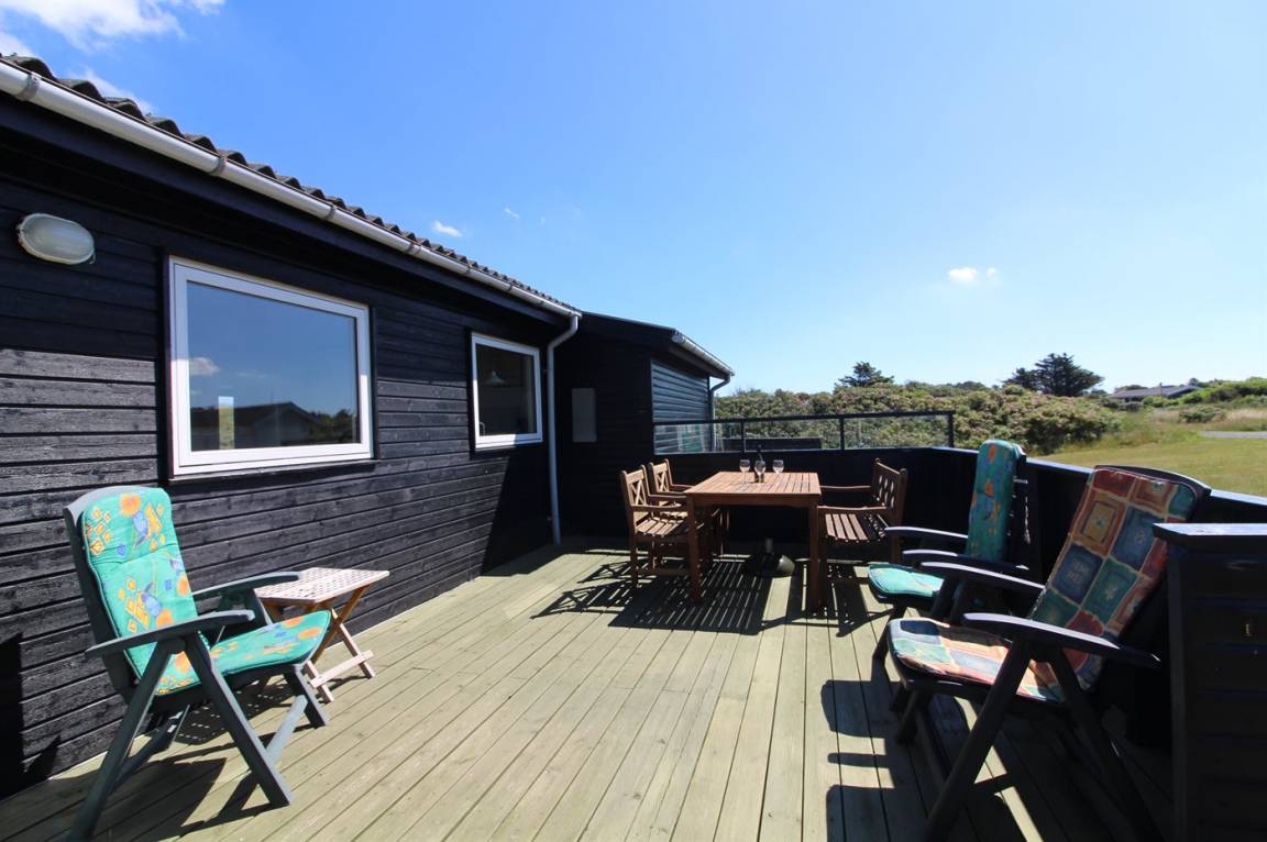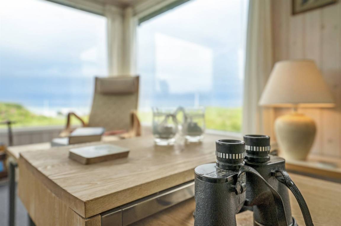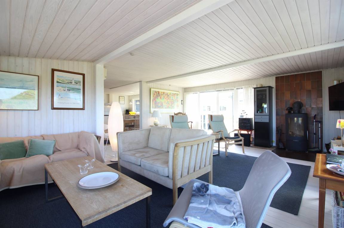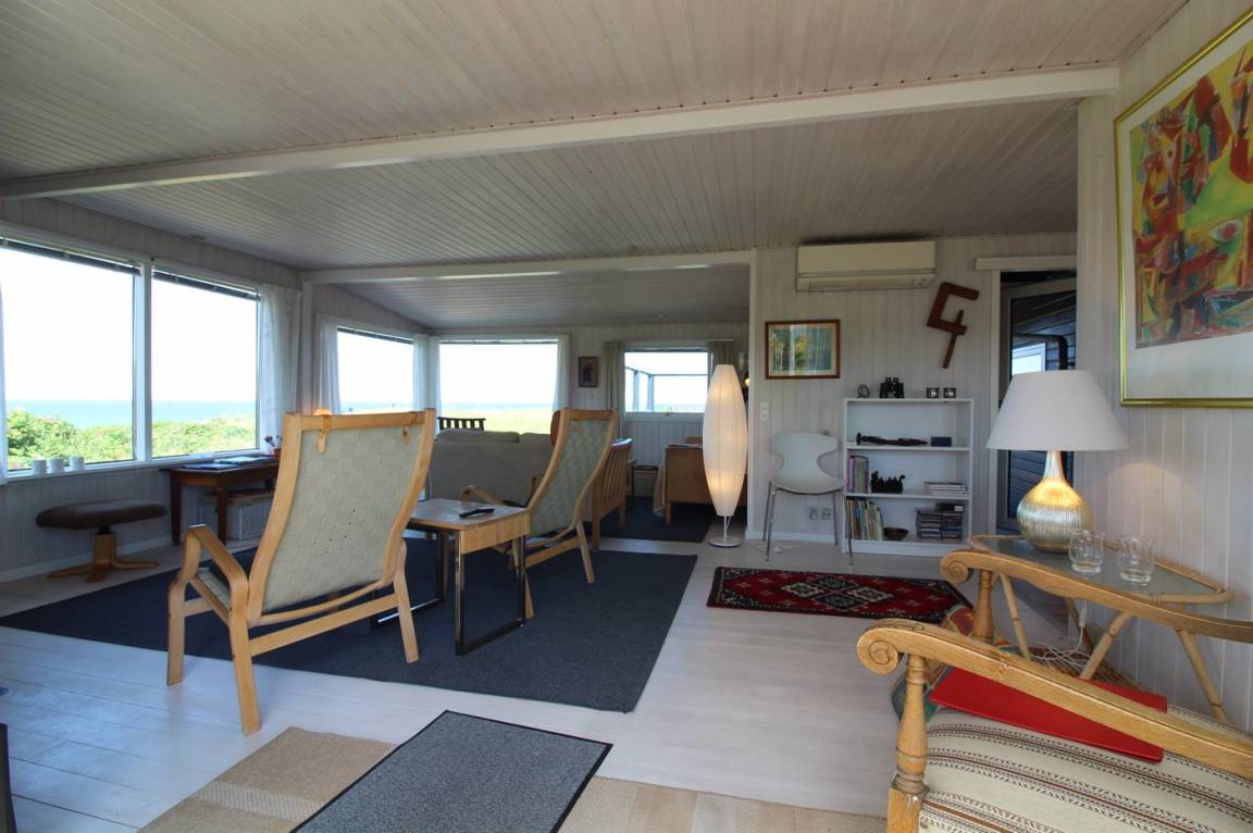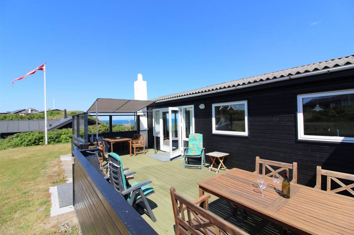 Hochgelegenes und geräumiges Ferienhaus mit Ausblick auf das Meer und die Umgebung, sowohl vom Haus als auch vom Grundstück aus. Das Grundstück liegt auf einem leicht abfallenden Gebiet nahe am Meer und ist von Dünen und Heckenrosen umgeben.