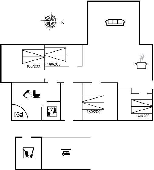 SchlafverhältnisseDie Schlafplätze verteilen sich auf 4 Schlafräume. 8 Schlafplätze in Doppelbetten. 2 Schlafplätze auf einer Doppelschlafcouch. 2 von diesen Schlafplätzen befinden sich im offenen Obergeschoss. Ferner steht ein Kinderbett zur Verfügung.