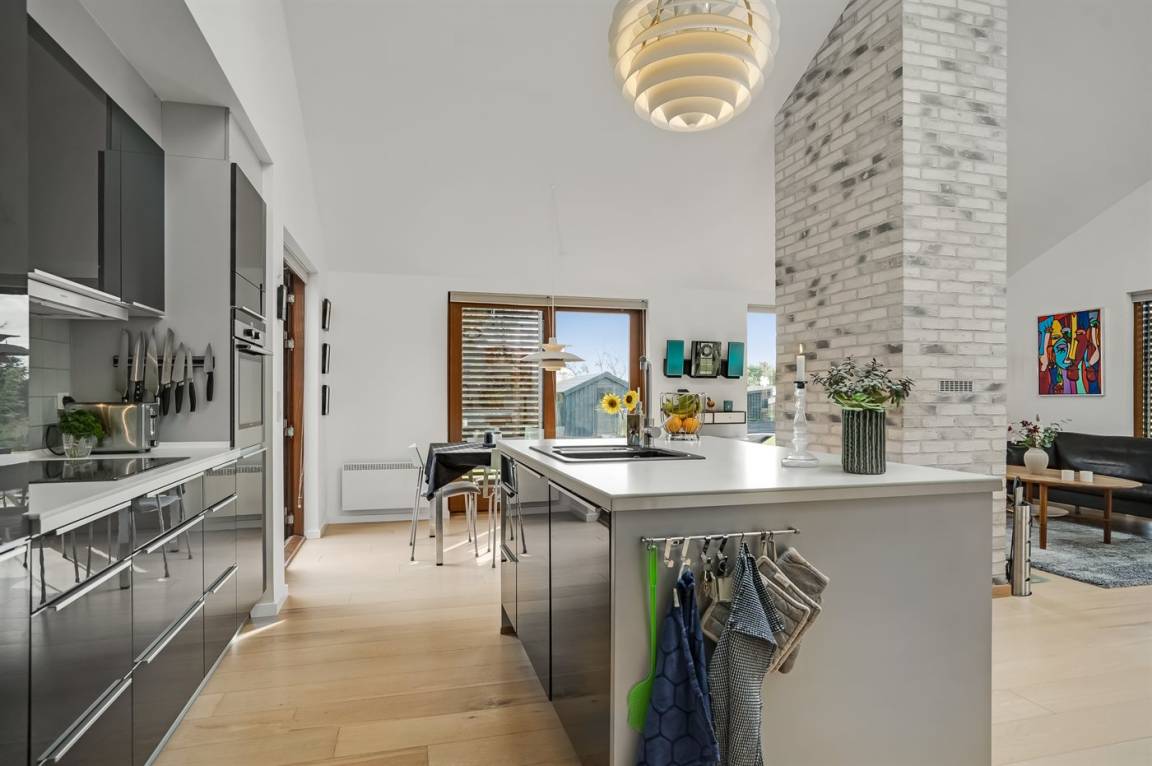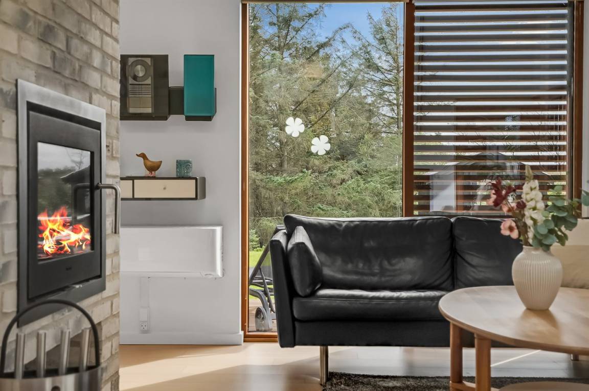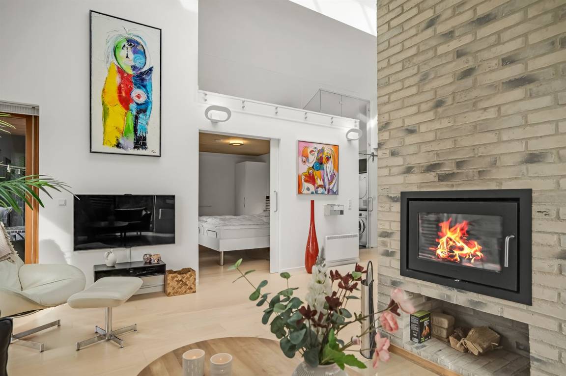 Die Einrichtung ist modern, mit Möbeln im modernen Design, einer B&O-Musikanlage, Eichenholzböden und bodentiefen Fenstern mit verstellbaren Fensterläden zur Regulierung des Lichteinfalls. Wohnzimmer und Küche/Essbereich sind dekorativ durch einen Schornstein mit Kaminofen voneinander getrennt.
