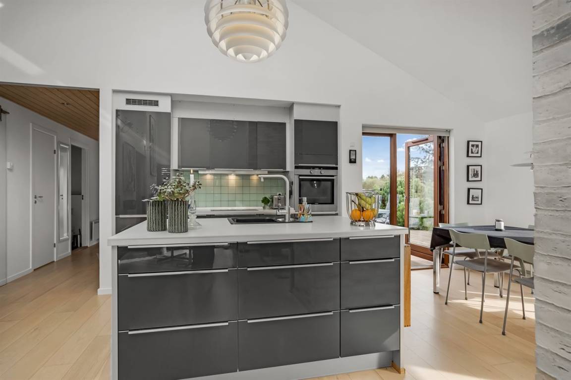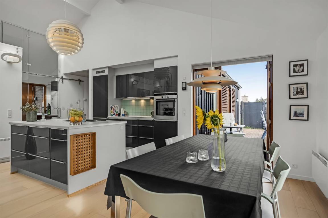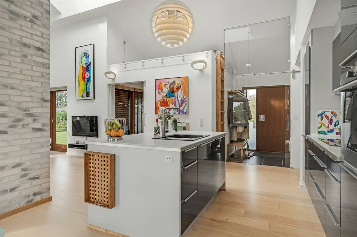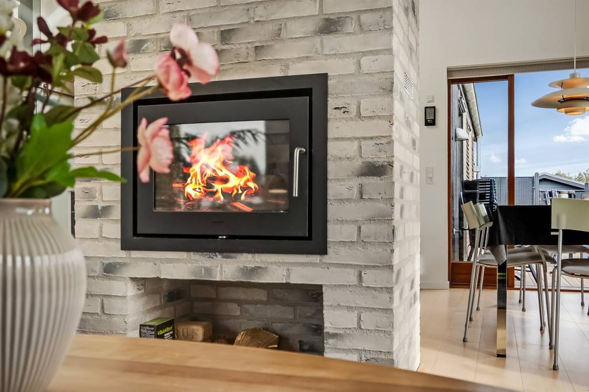 Die Einrichtung ist modern, mit Möbeln im modernen Design, einer B&O-Musikanlage, Eichenholzböden und bodentiefen Fenstern mit verstellbaren Fensterläden zur Regulierung des Lichteinfalls. Wohnzimmer und Küche/Essbereich sind dekorativ durch einen Schornstein mit Kaminofen voneinander getrennt.