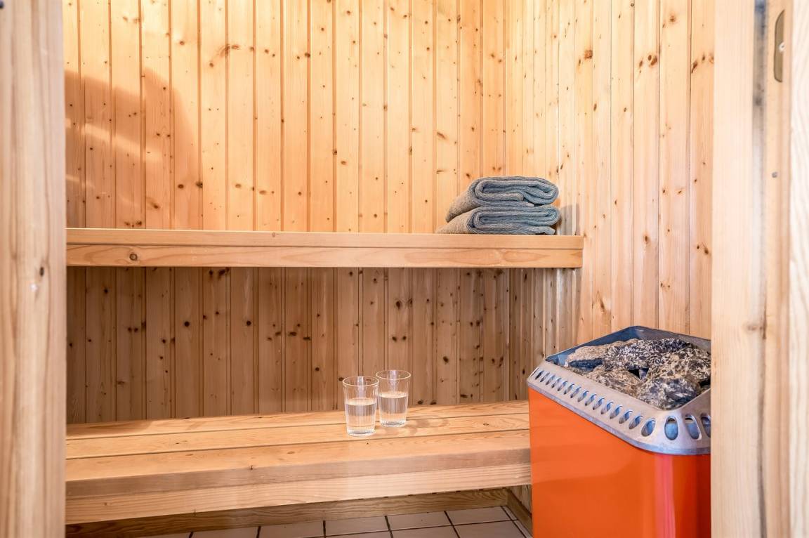 Es gibt 1 Badezimmer mit Fußbodenheizung, Duschnische, Badewanne und Toilette. Es steht außerdem eine Sauna zur Verfügung in der man sich so richtig entspannen kann.