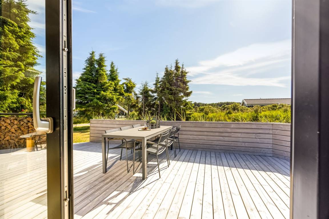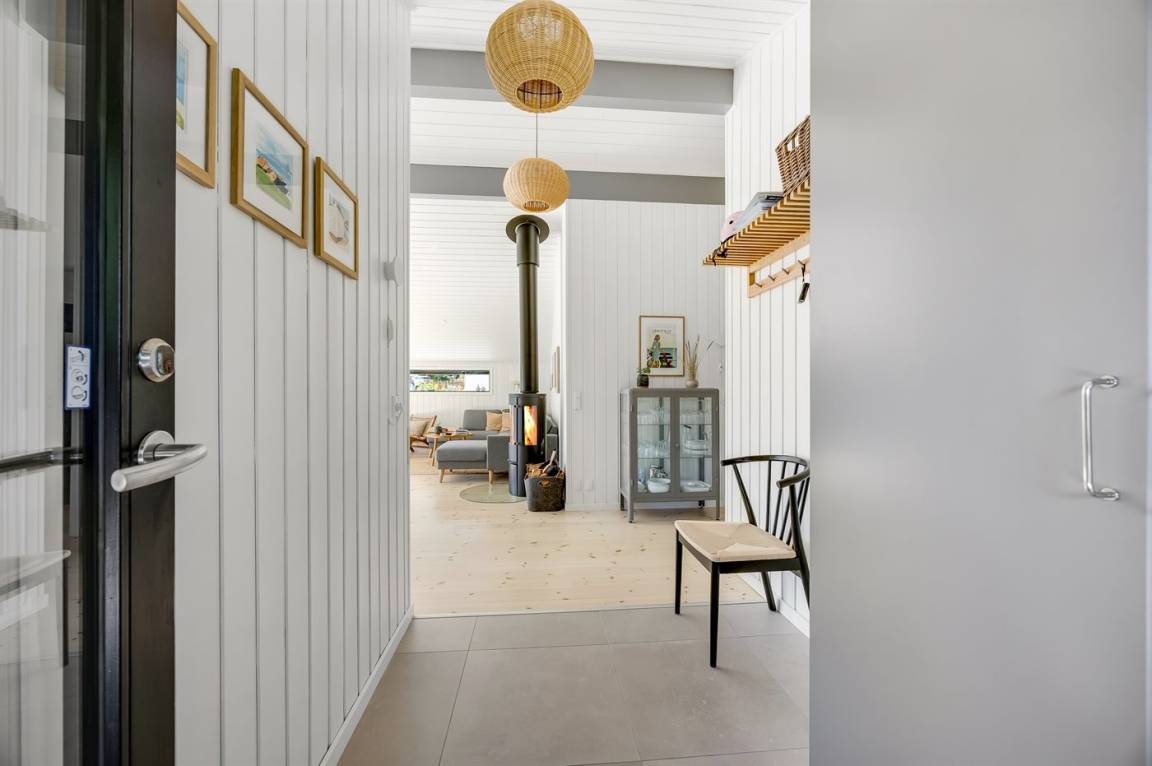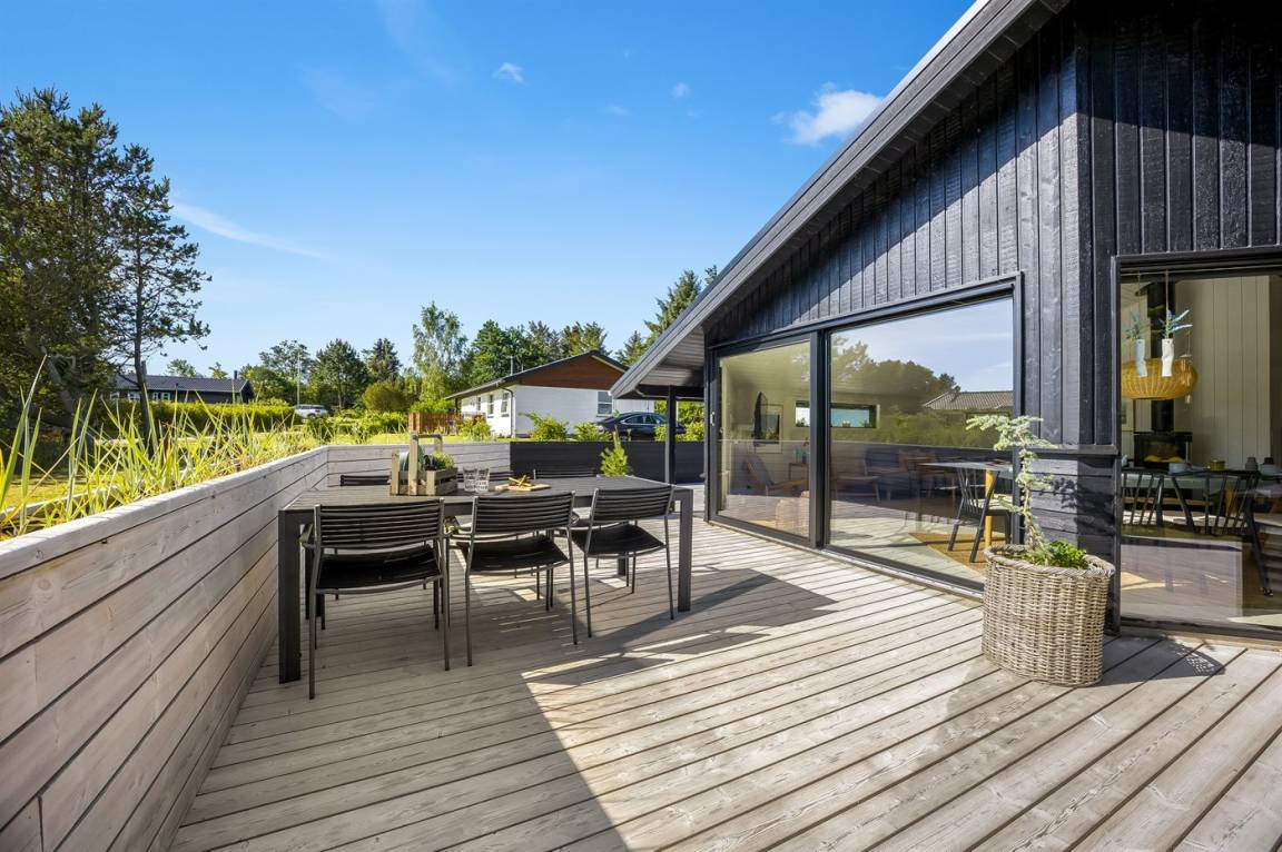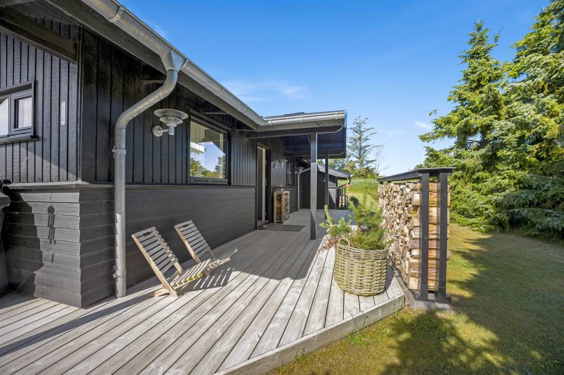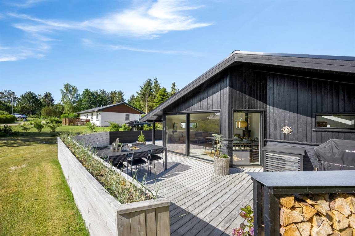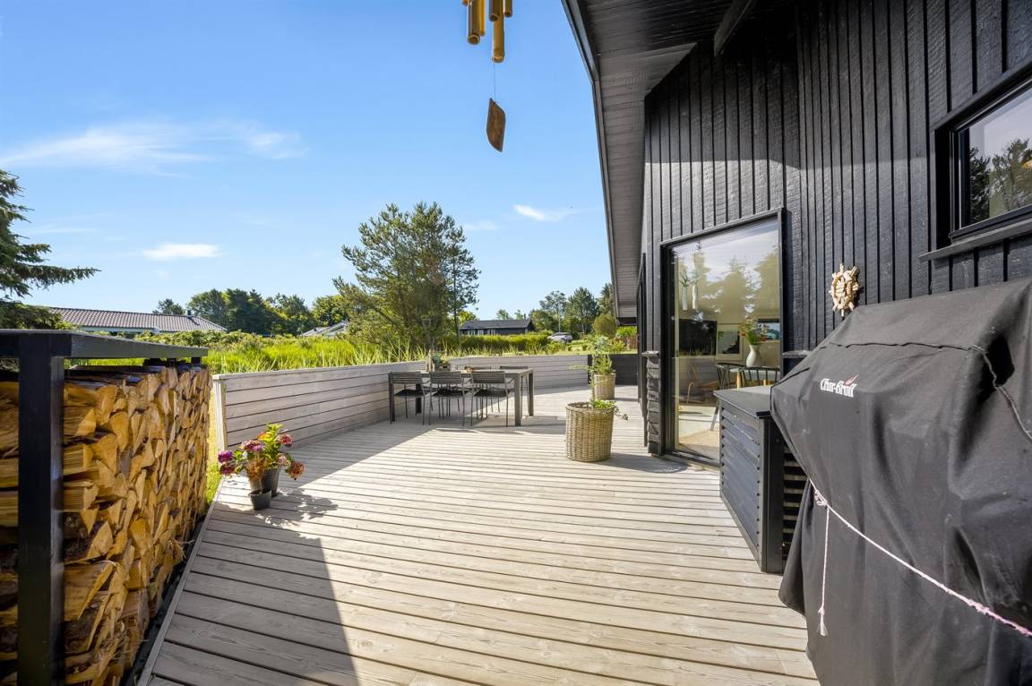 Das Grundstück ist 1.065 m² groß und bietet eine schöne offene und teilweise überdachte Holzterrasse, die sich wie ein natürlicher Erweiterungsraum zum Innenbereich anfühlt. Die Terrasse ist rundum mit windgeschützten Elementen ausgestattet und daher ideal für ganztägige Aufenthalte – egal bei welcher Windrichtung. Ein wunderbarer Ort, um sowohl den Morgenkaffee als auch die Sommerabende zu genießen – für Kinder und Erwachsene gleichermaßen. Zusätzlich gibt es einen Geräteraum, einen Grill und einen einfachen Zugang zu einem Spielplatz nur 300 Meter entfernt. Parkplätze befinden sich direkt am Haus, und es gibt eine Ladesäule für dein E-Auto. Die Entfernung zum Meer und zu Einkaufsmöglichkeiten beträgt ca. 990 Meter.
