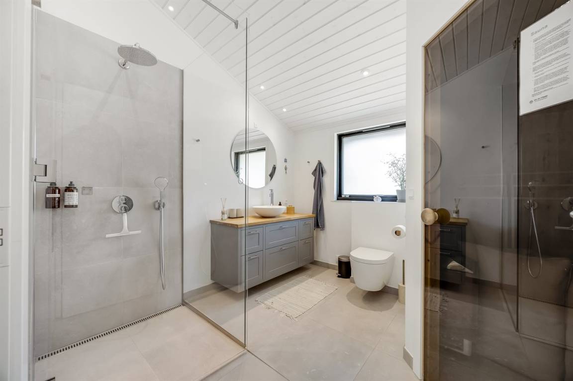 Das geräumige Badezimmer ist mit Fußbodenheizung, Dusche, WC und Sauna ausgestattet.