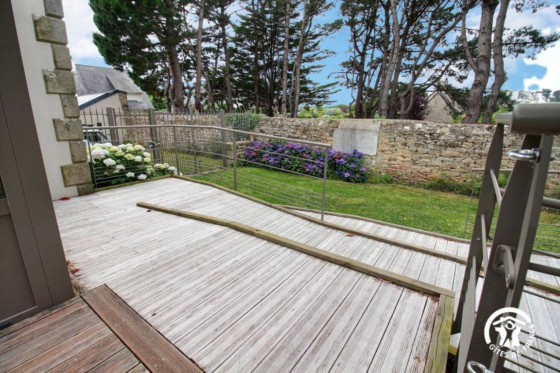 Im Erdgeschoss können Sie die Gemeinschaftsräume genießen, die Sie mit den Mietern der anderen Wohnungen teilen: ein großes Wohnzimmer (mit Fernseher, Heimkino und WLAN), eine schöne Veranda und eine Terrasse mit Meerblick, eine Waschküche, eine landschaftlich gestaltete Garten (Kanu, Grillplatz, Volleyballplatz, Gemüsegarten, Obstgarten, Pétanque, Außendusche, etc.) mit direktem Zugang zum Küstenweg!