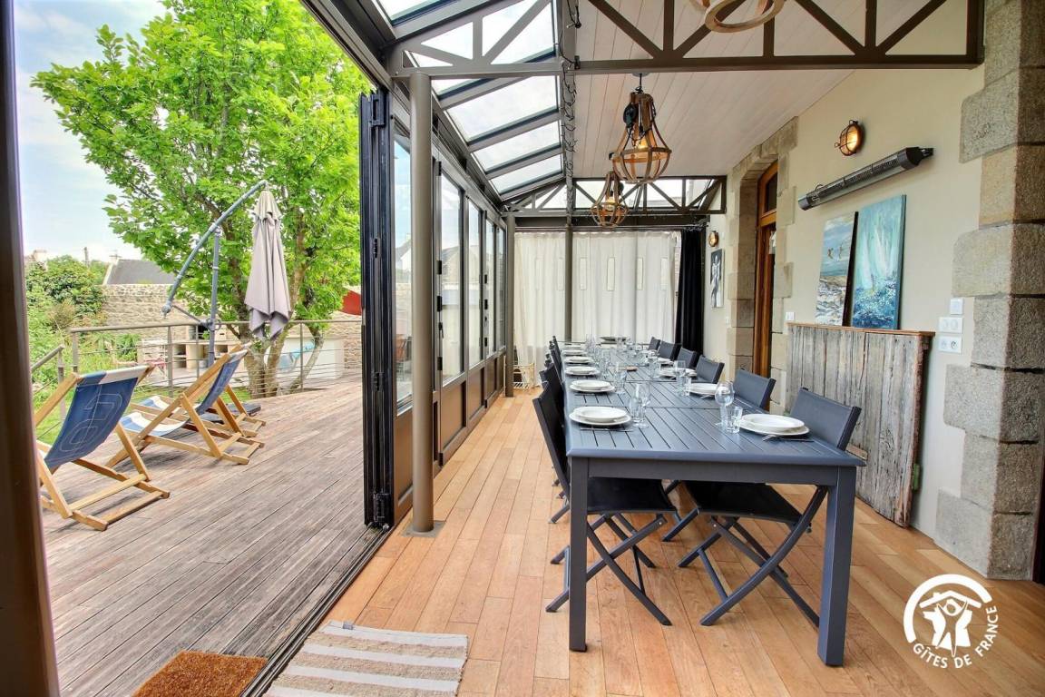 Im Erdgeschoss können Sie die Gemeinschaftsräume genießen, die Sie mit den Mietern der anderen Wohnungen teilen: ein großes Wohnzimmer (mit Fernseher, Heimkino und WLAN), eine schöne Veranda und eine Terrasse mit Meerblick, eine Waschküche, eine landschaftlich gestaltete Garten (Kanus, Grill, Volleyballplatz, Gemüsegarten, Obstgarten, Pétanque, Außendusche usw.) mit direktem Zugang zum Küstenweg!