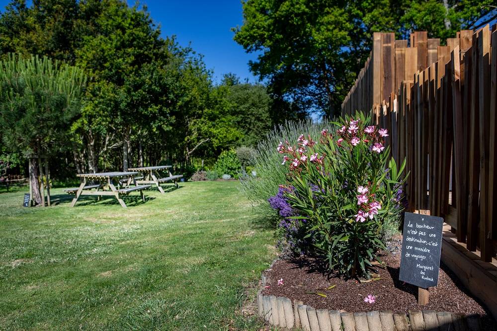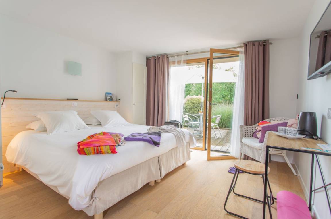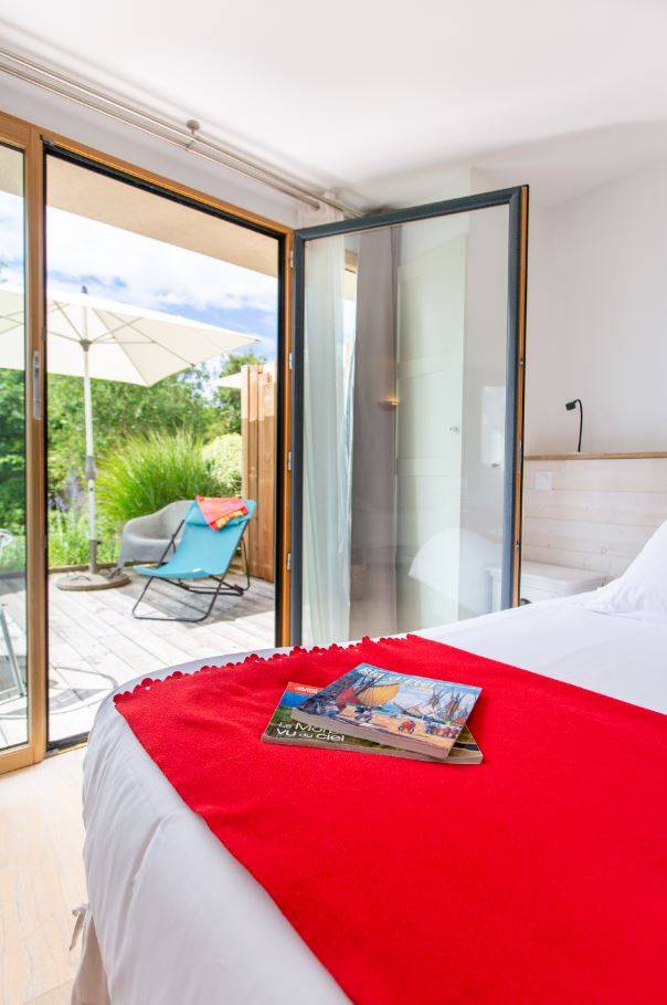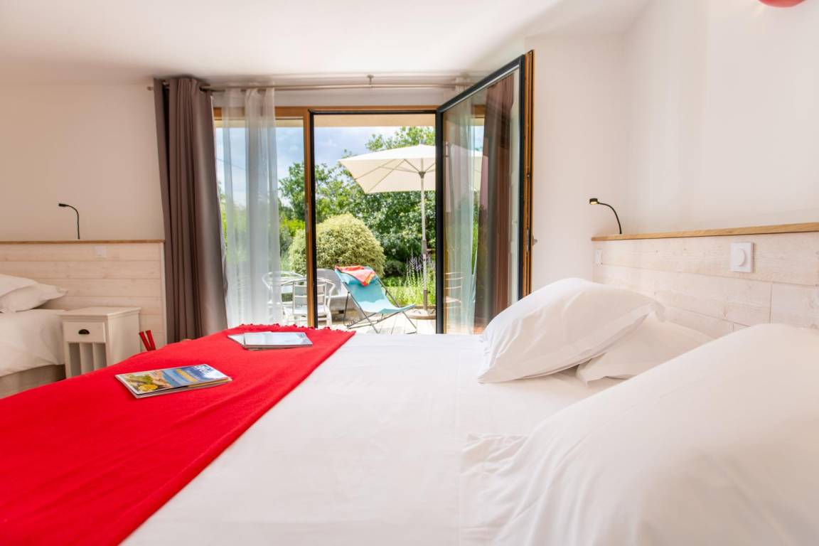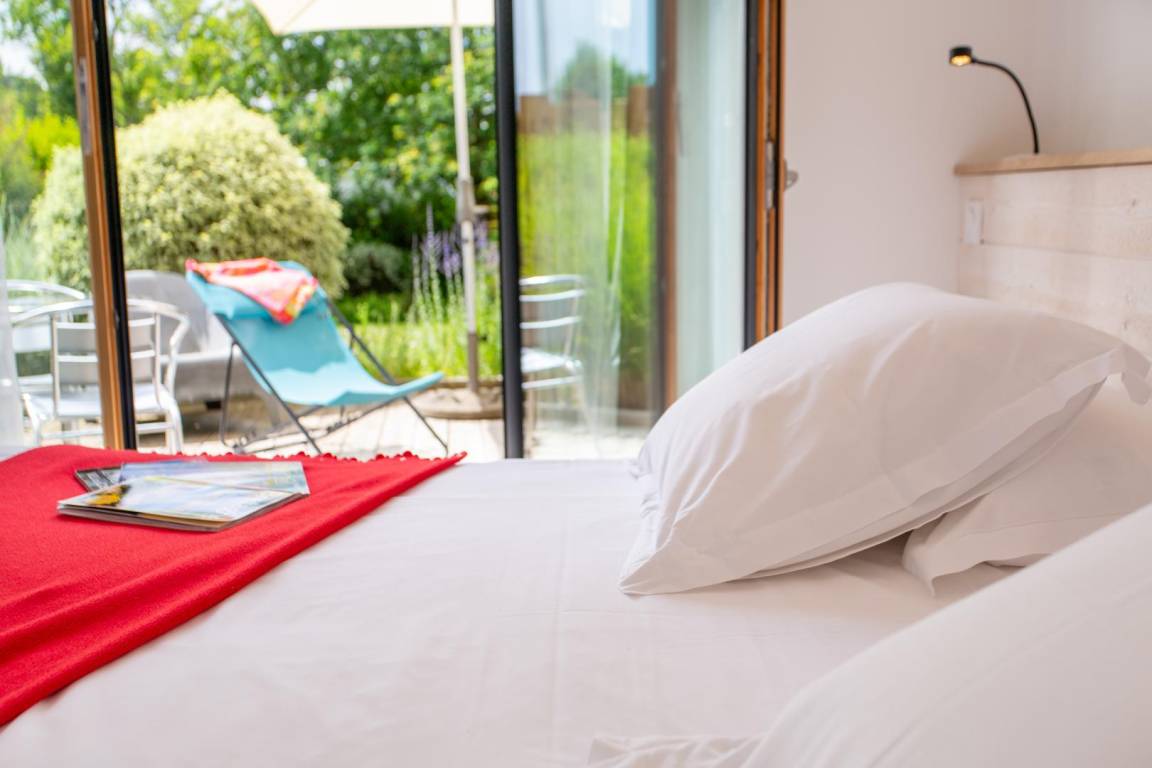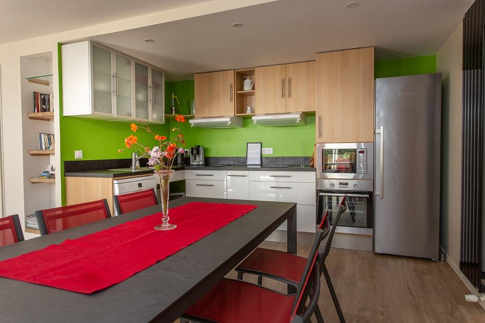 - Schlafzimmer „Aubergine" (2 Schlafplätze): 1 komfortables Kingsize-Bett (180 x 200 cm) oder 2 Einzelbetten (90 x 200 cm), eigenes Duschbad mit Dusche und WC. Große Terrasse mit Blick auf den Garten, angrenzend an die Küche.