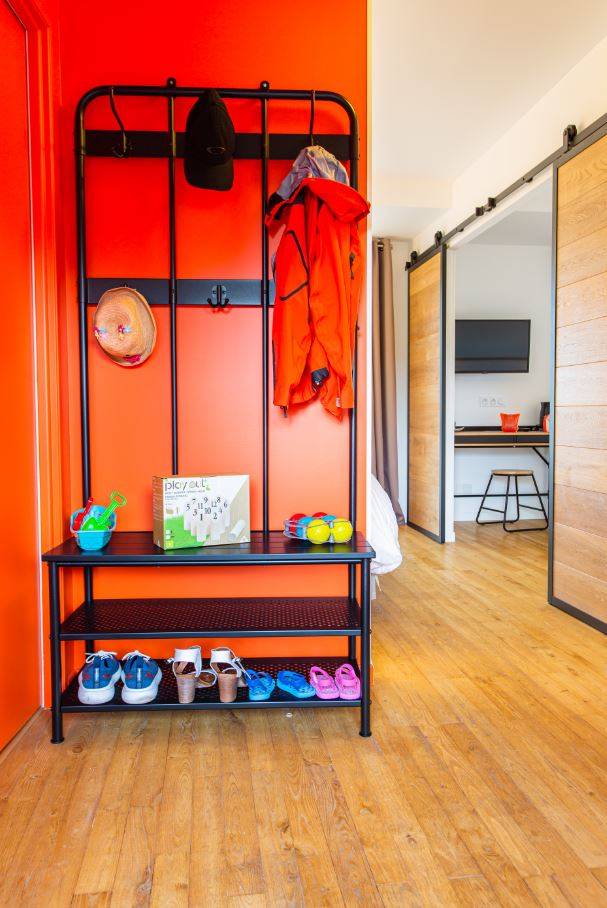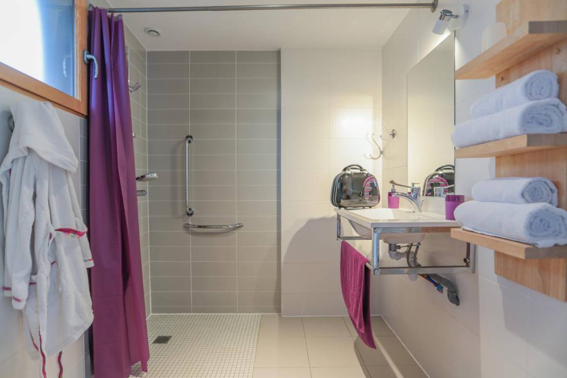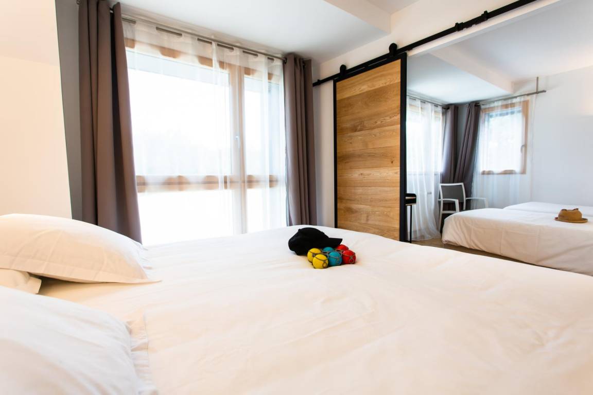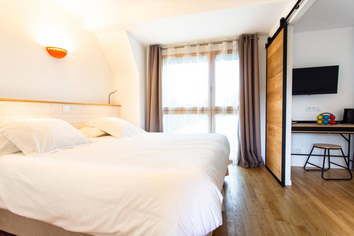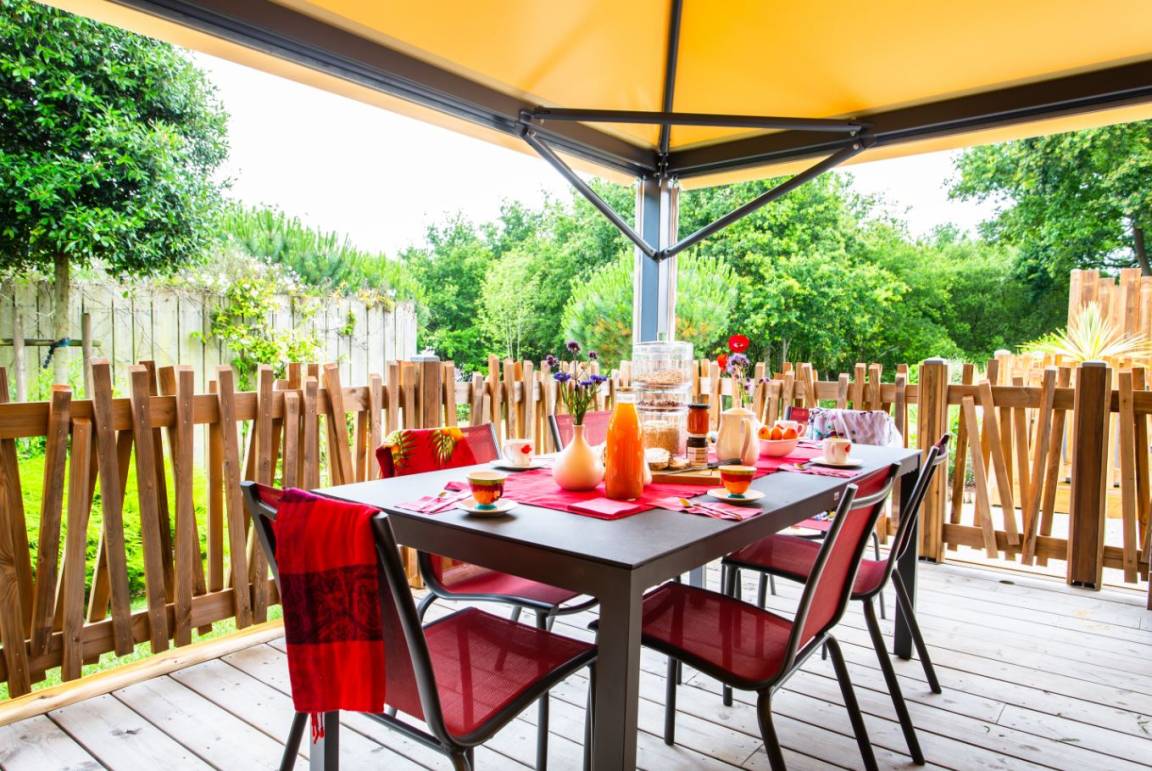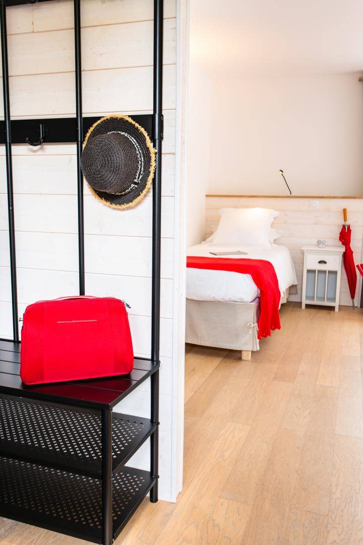 - Schlafzimmer „Aubergine" (2 Schlafplätze): 1 komfortables Kingsize-Bett (180 x 200 cm) oder 2 Einzelbetten (90 x 200 cm), eigenes Duschbad mit Dusche und WC. Große Terrasse mit Blick auf den Garten, angrenzend an die Küche.