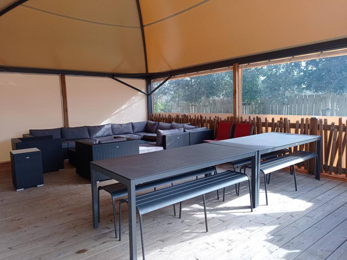 - Wohnbereich mit voll ausgestatteter Küche/Wohn-/Essbereich. Die Küche öffnet sich zu einer 40 m² großen Pergola, ideal für Mahlzeiten im Freien.